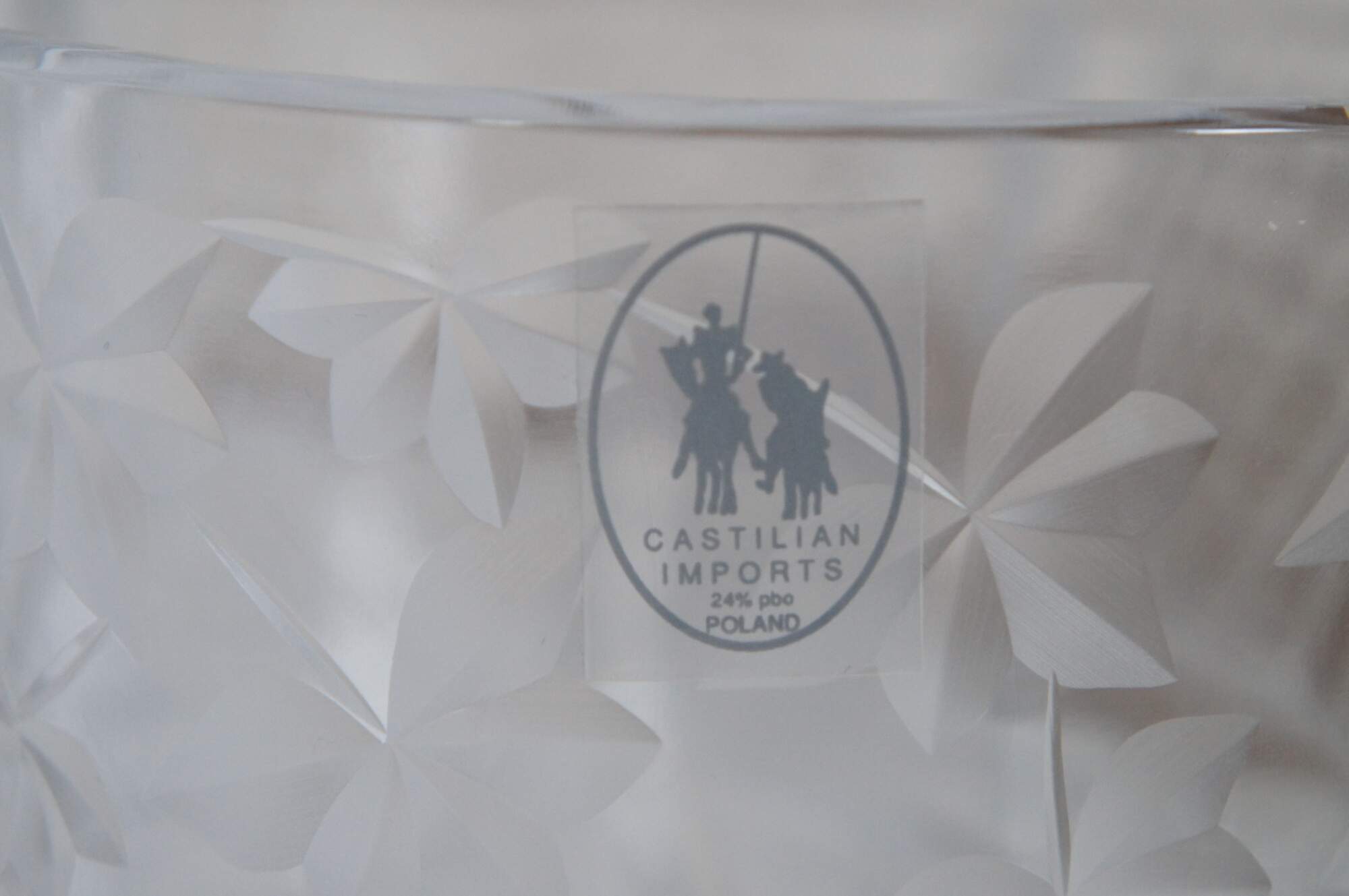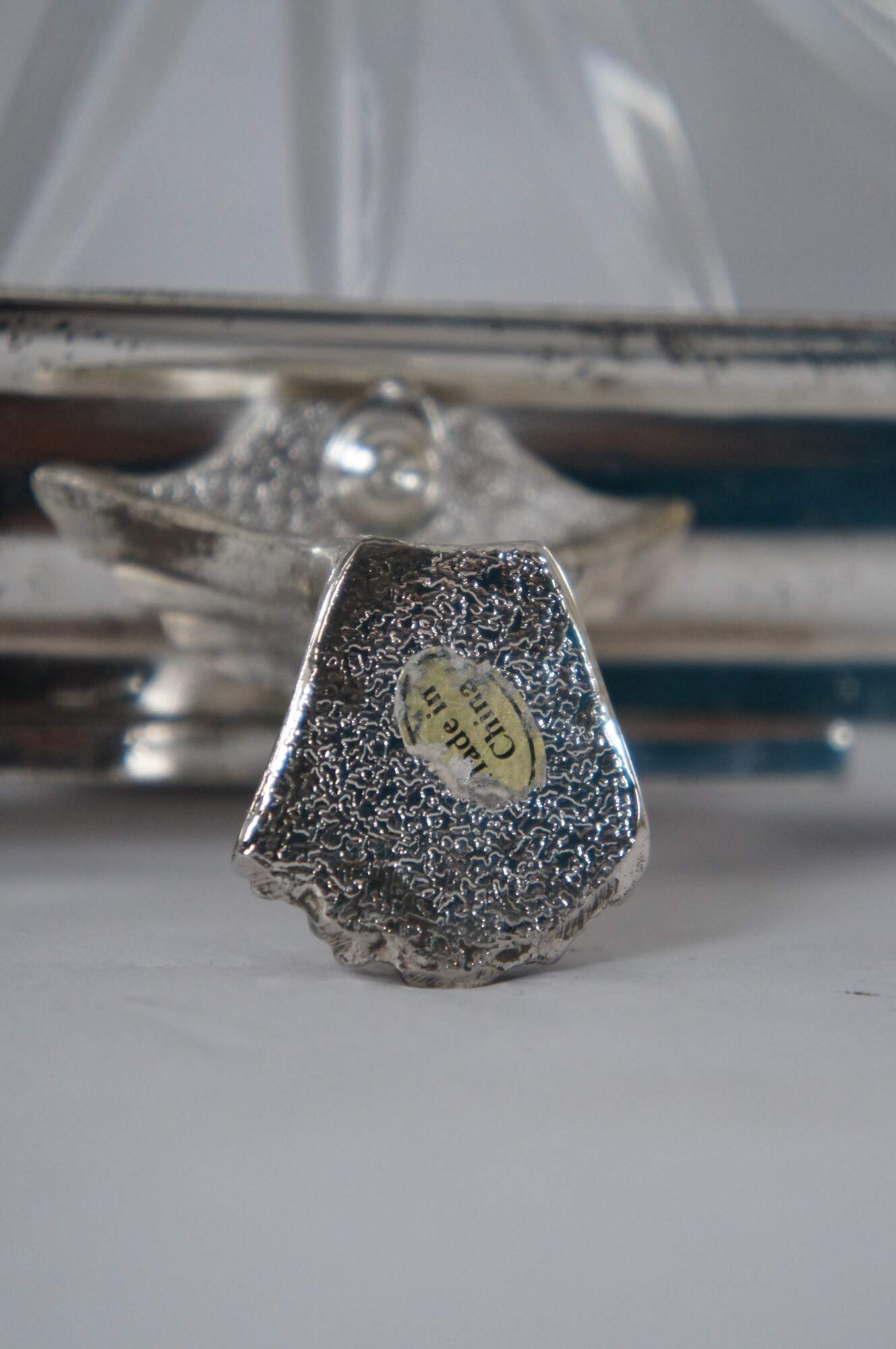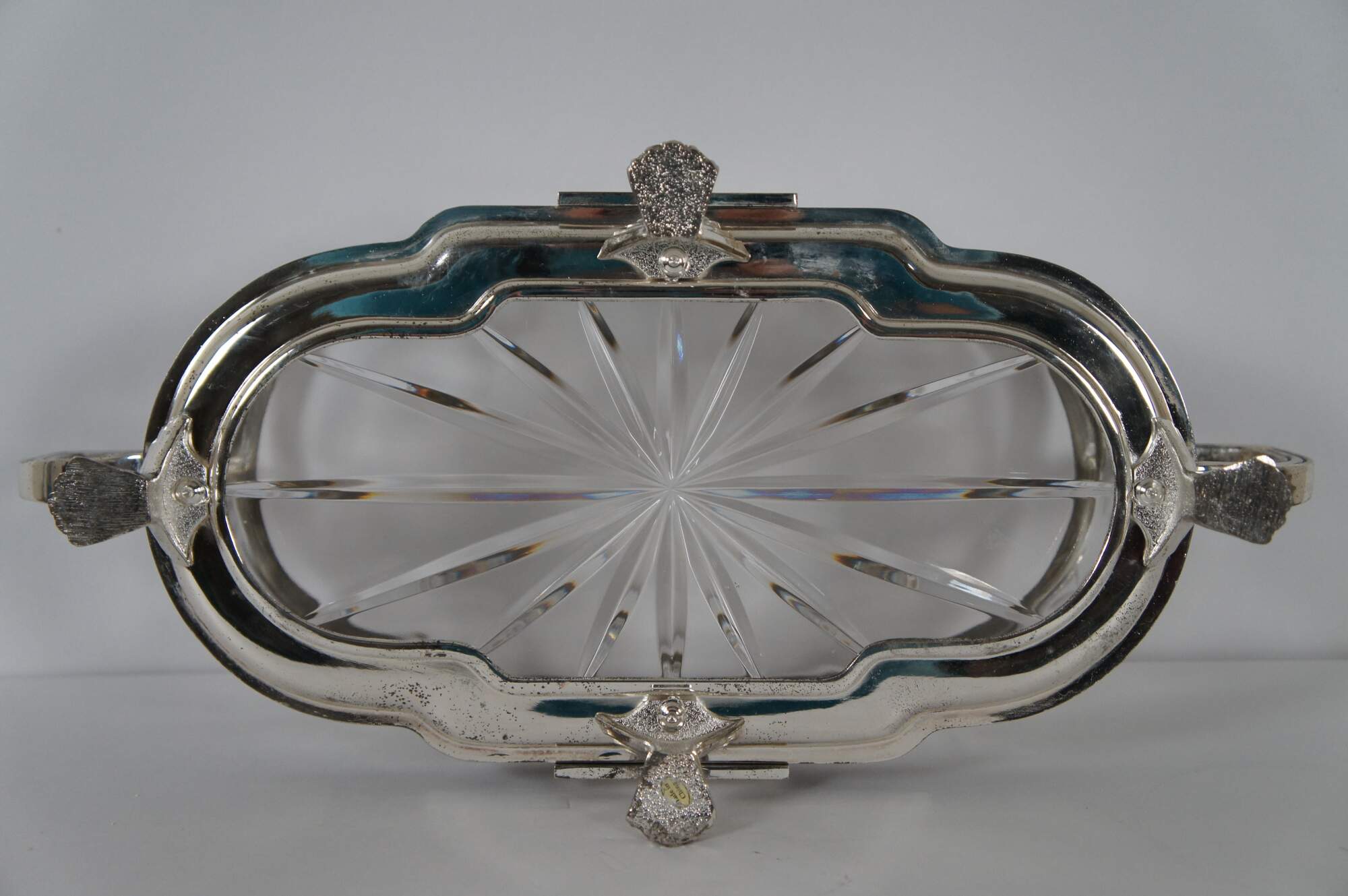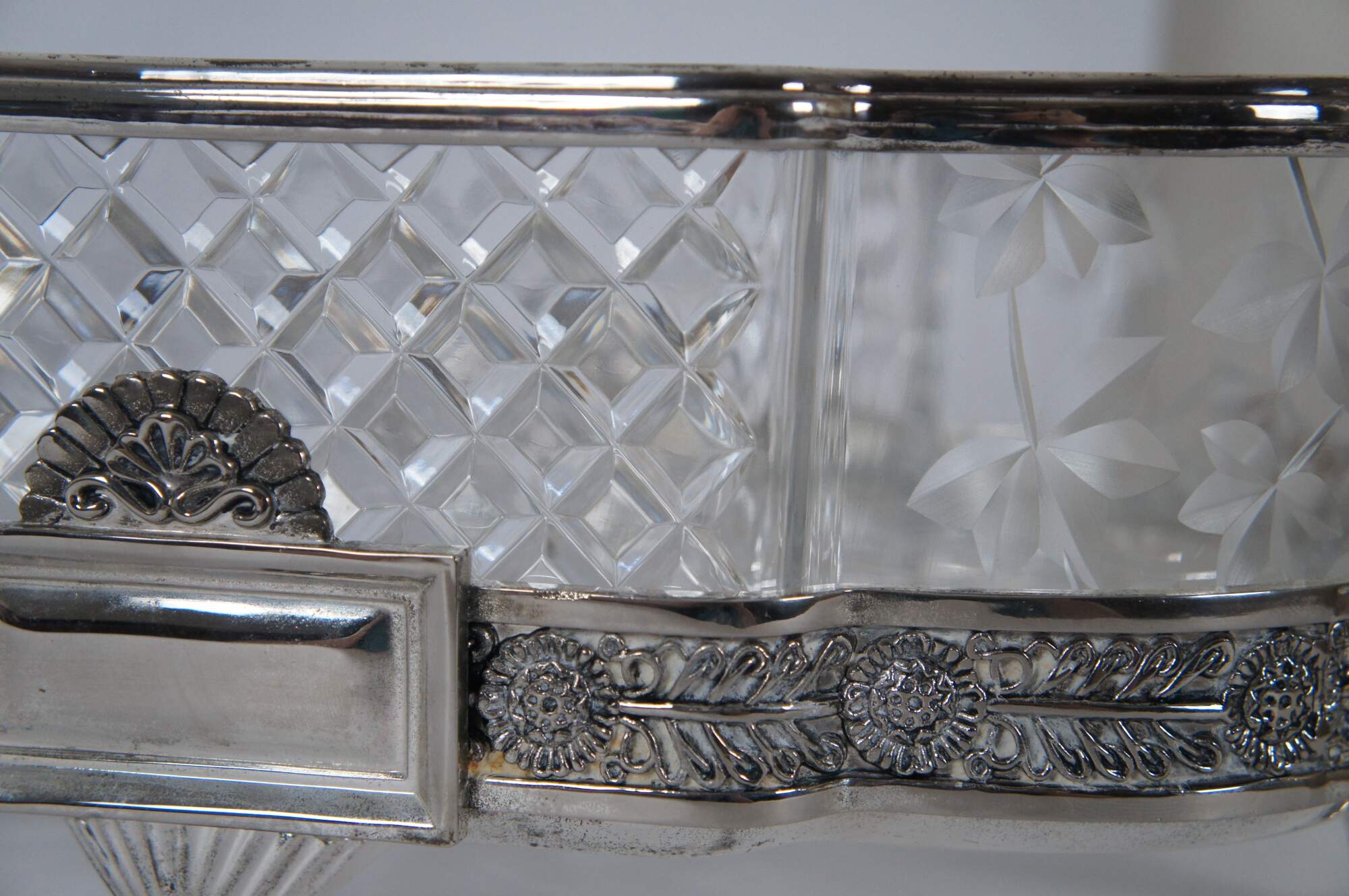 Vintage Castilian Imports cut crystal centerpiece dish in an elegant French Art Nouveau design with footed silverplate base with Greek key shaped handles, floral trim and paw / claw feet. Front and back also feature plain rectangular plates for engraving a monogram. Crystal insert made in Poland. Base made in China.
