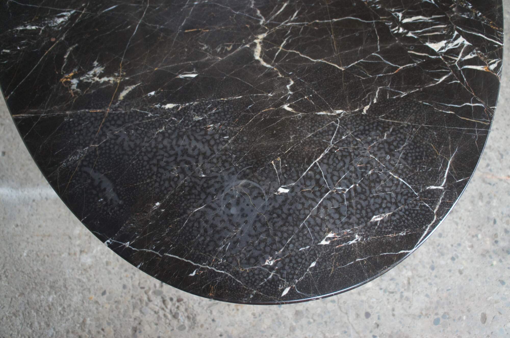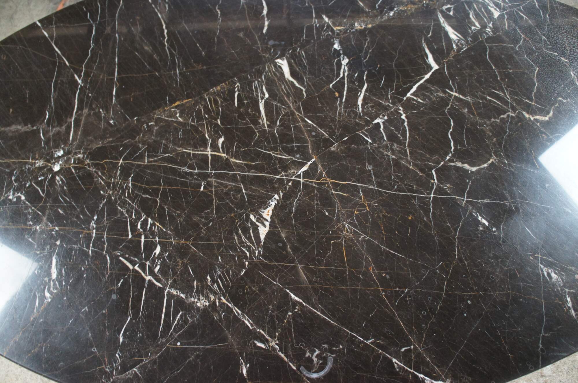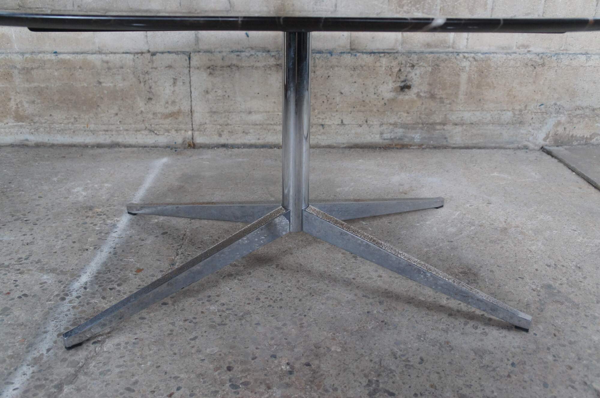 An iconic Florence Knoll dining / conference table or desk. Features a beautiful oval Marquina marble top over a chrome plated steel tripod base, circa 1960s.
