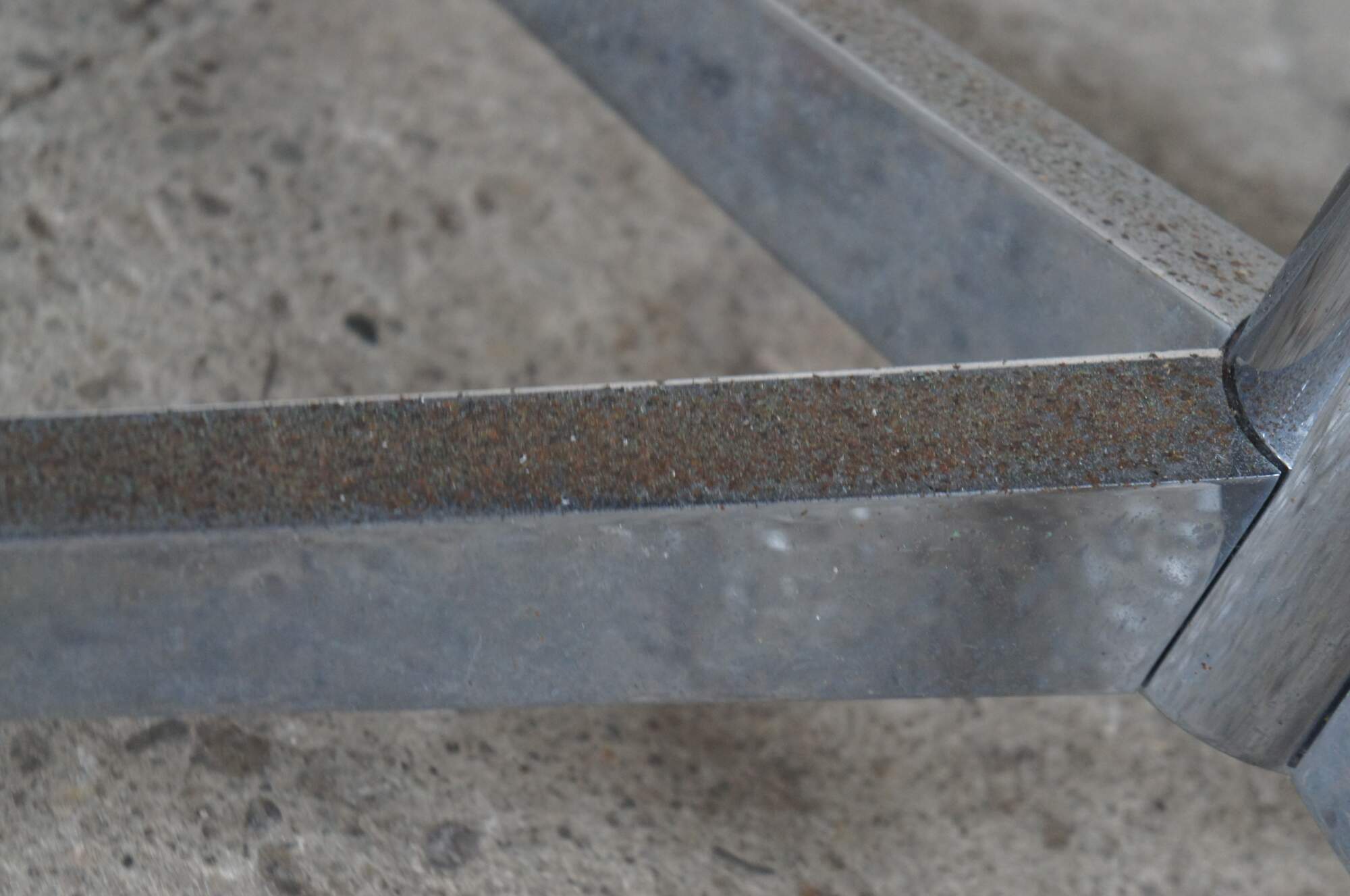 Fair; the base has pitting to the chrome plated base. Mostly along the top. The oval marble top was broken at some point in the past and professionally repaired with iron rods. wear and distressing to the surface. Spotting as well as some rings.