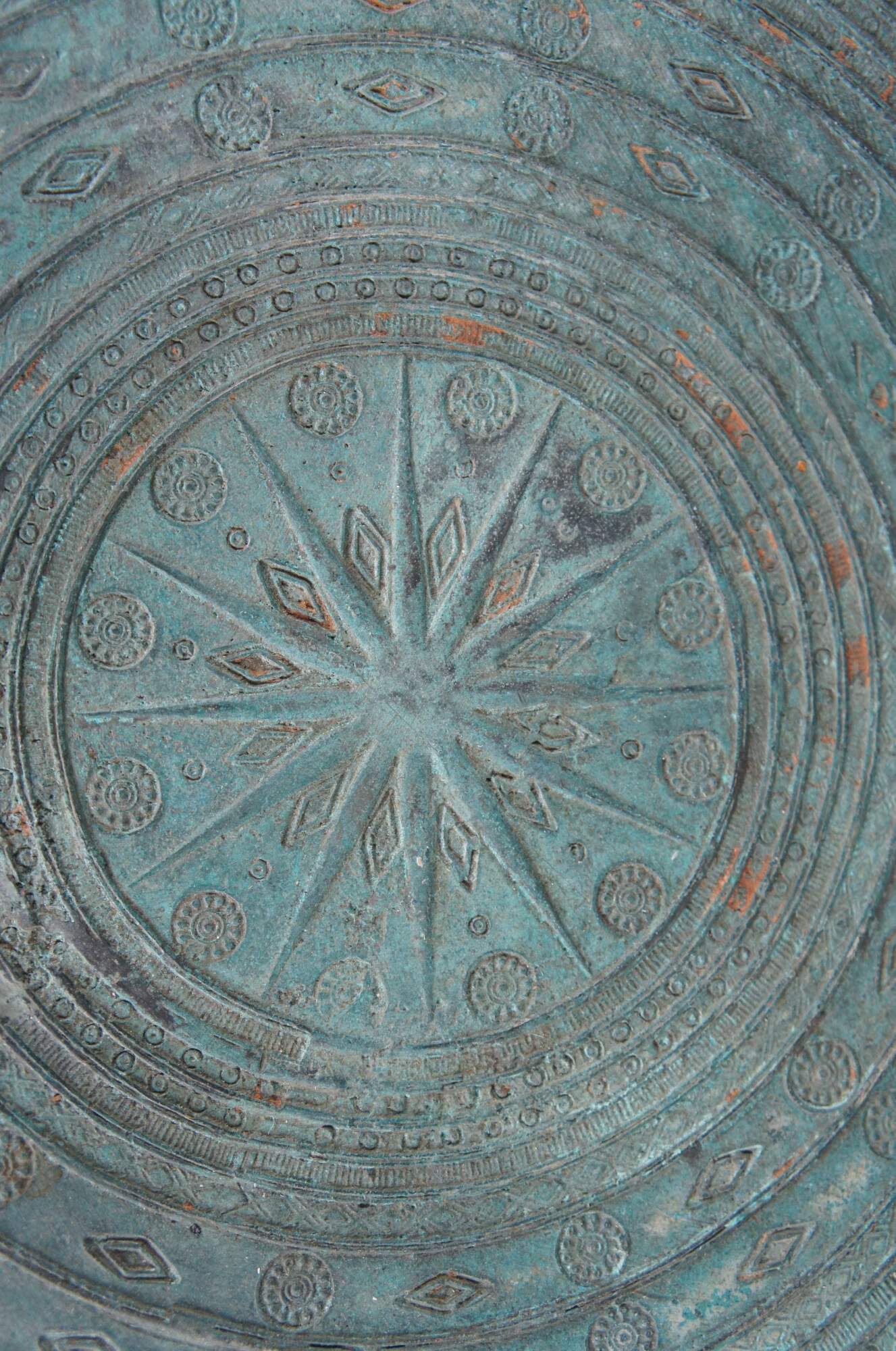 Rain Drums originated with the Dong Son culture in Southeast Asia, dating as far back as the mid-to-late Bronze Age (1,000–700 BC). Metal workers poured and set molten bronze in a cast, freed the hardened drums from their molds, then carved them with intricate motifs as the metal cooled. The art of sculpting bronze drums remains a refined skill, acquired over many years and passed on through apprenticeships.