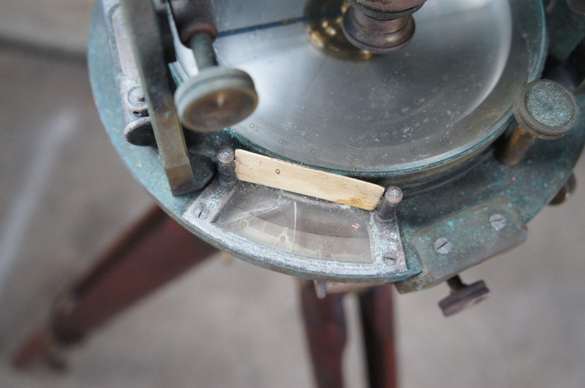 Fair; (verdigris) corrosion and patina from use and age. Could use cleaning / polish. One of the small glass windows along the outside of the compass is cracked.