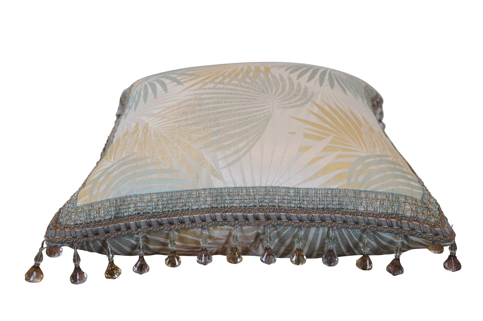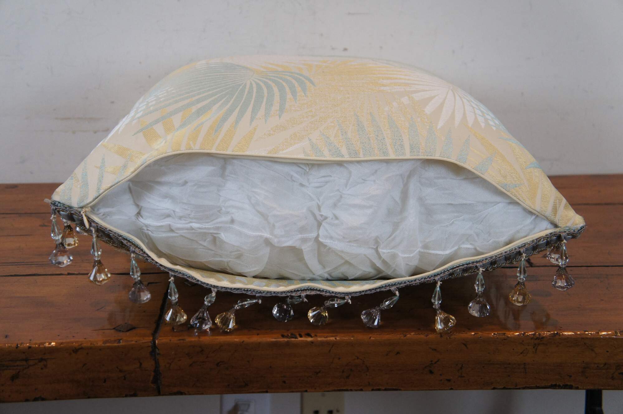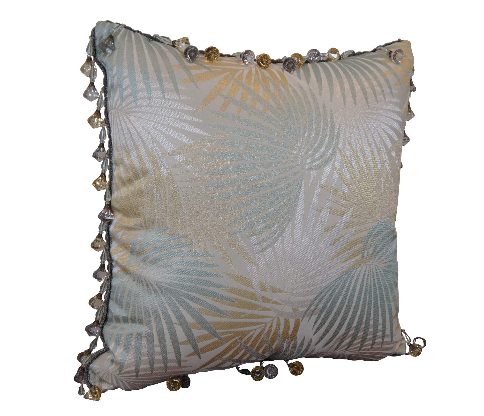 Tropical themed throw pillow featuring metallic brocade with light turquoise / green, gold and off-white palm leaves, bordered with matching braided trim and finished with a drop crystal style beaded fringe. Fiber filled; zippered closure.