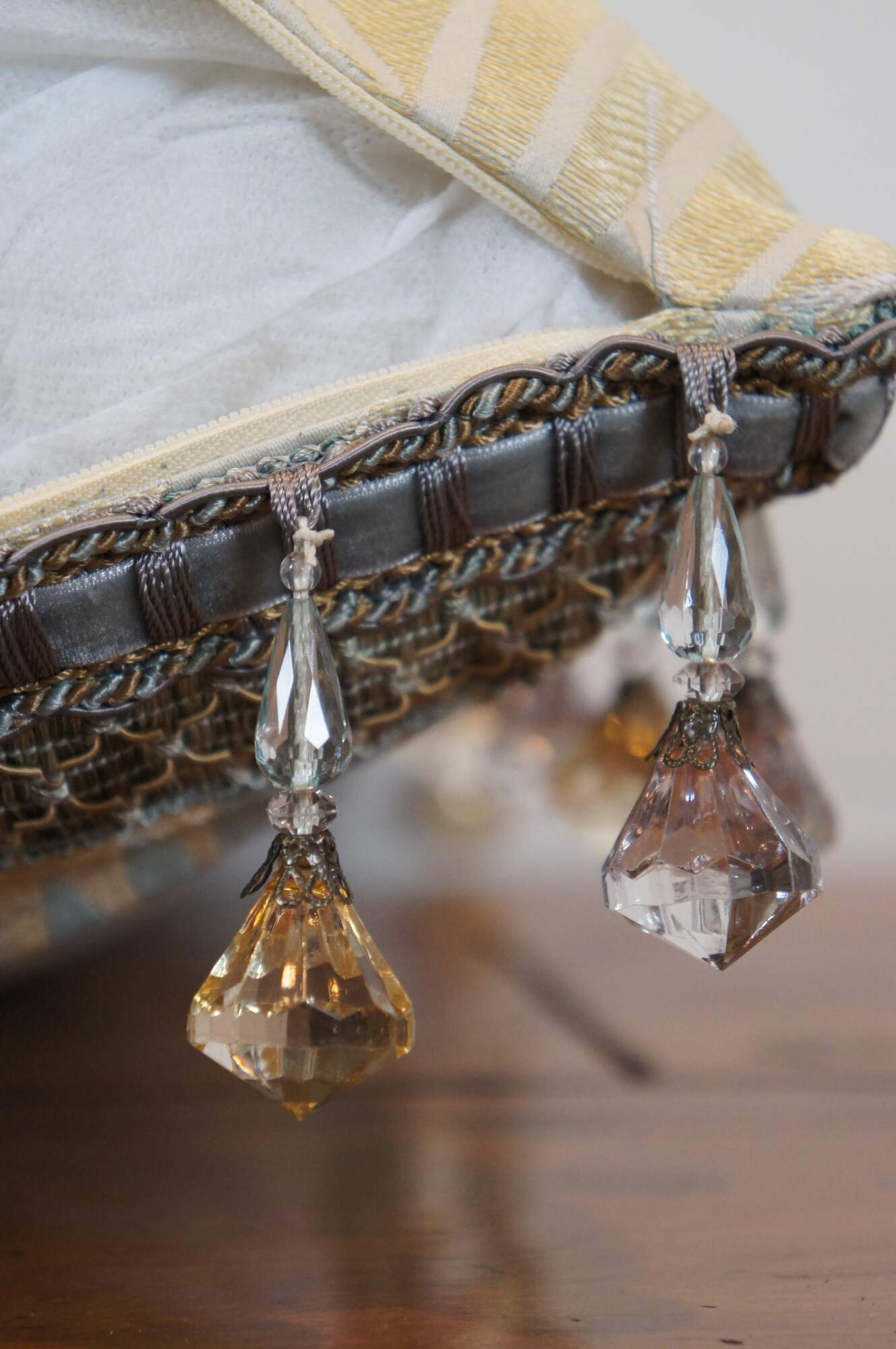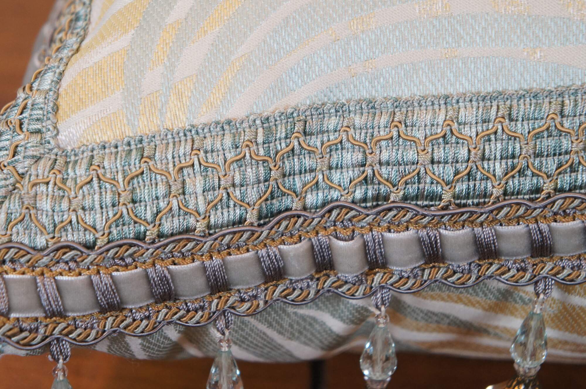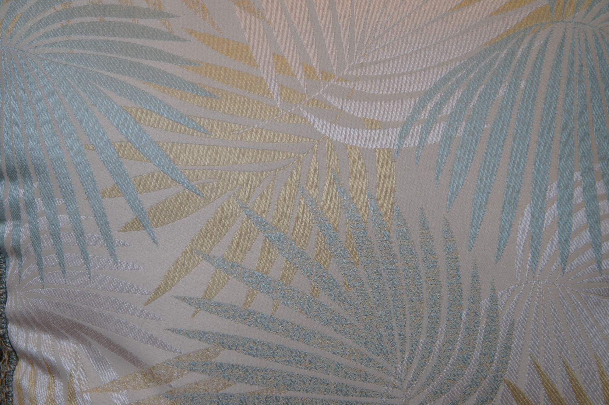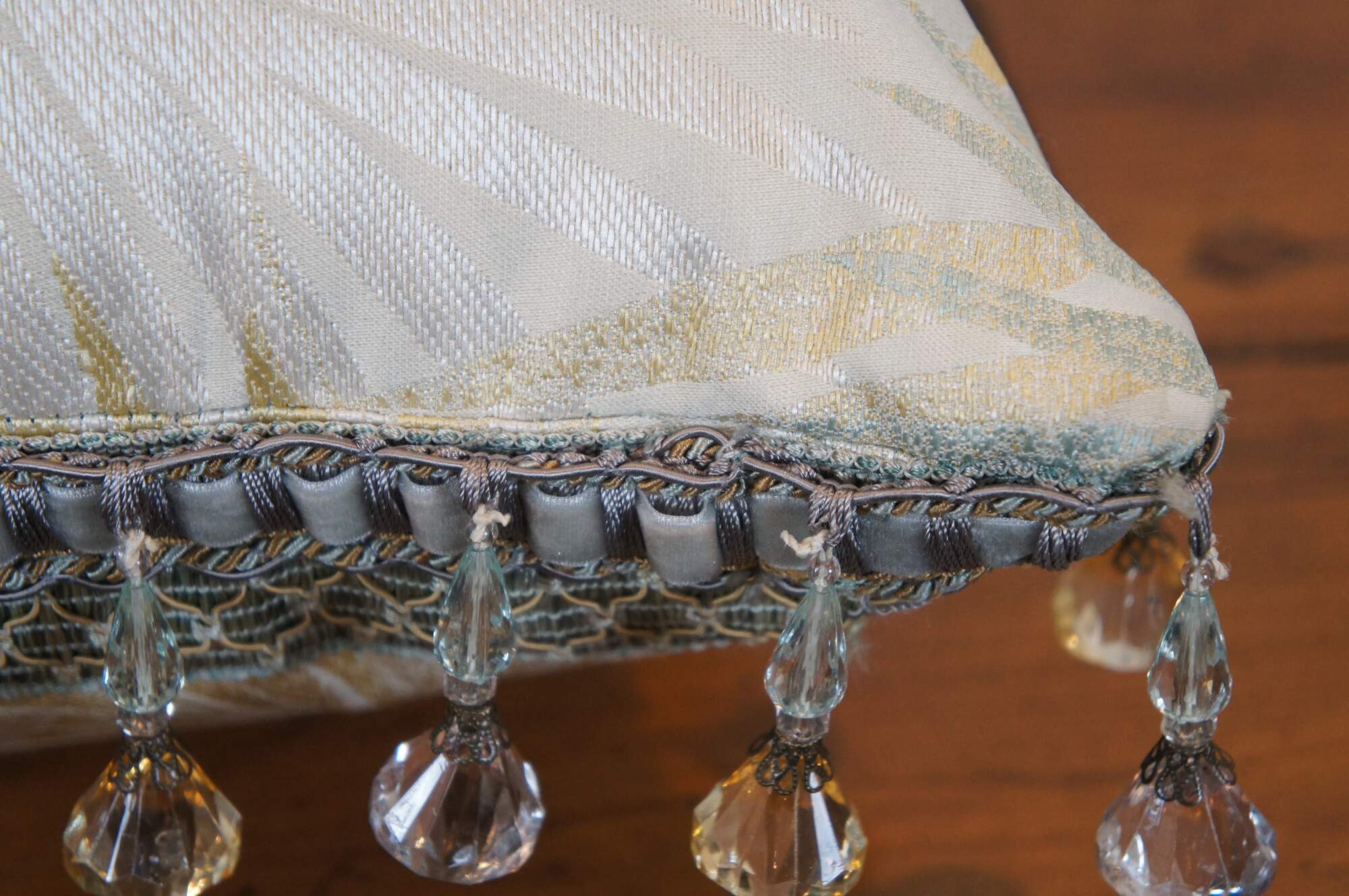Tropical themed throw pillow featuring metallic brocade with light turquoise / green, gold and off-white palm leaves, bordered with matching braided trim and finished with a drop crystal style beaded fringe. Fiber filled; zippered closure.