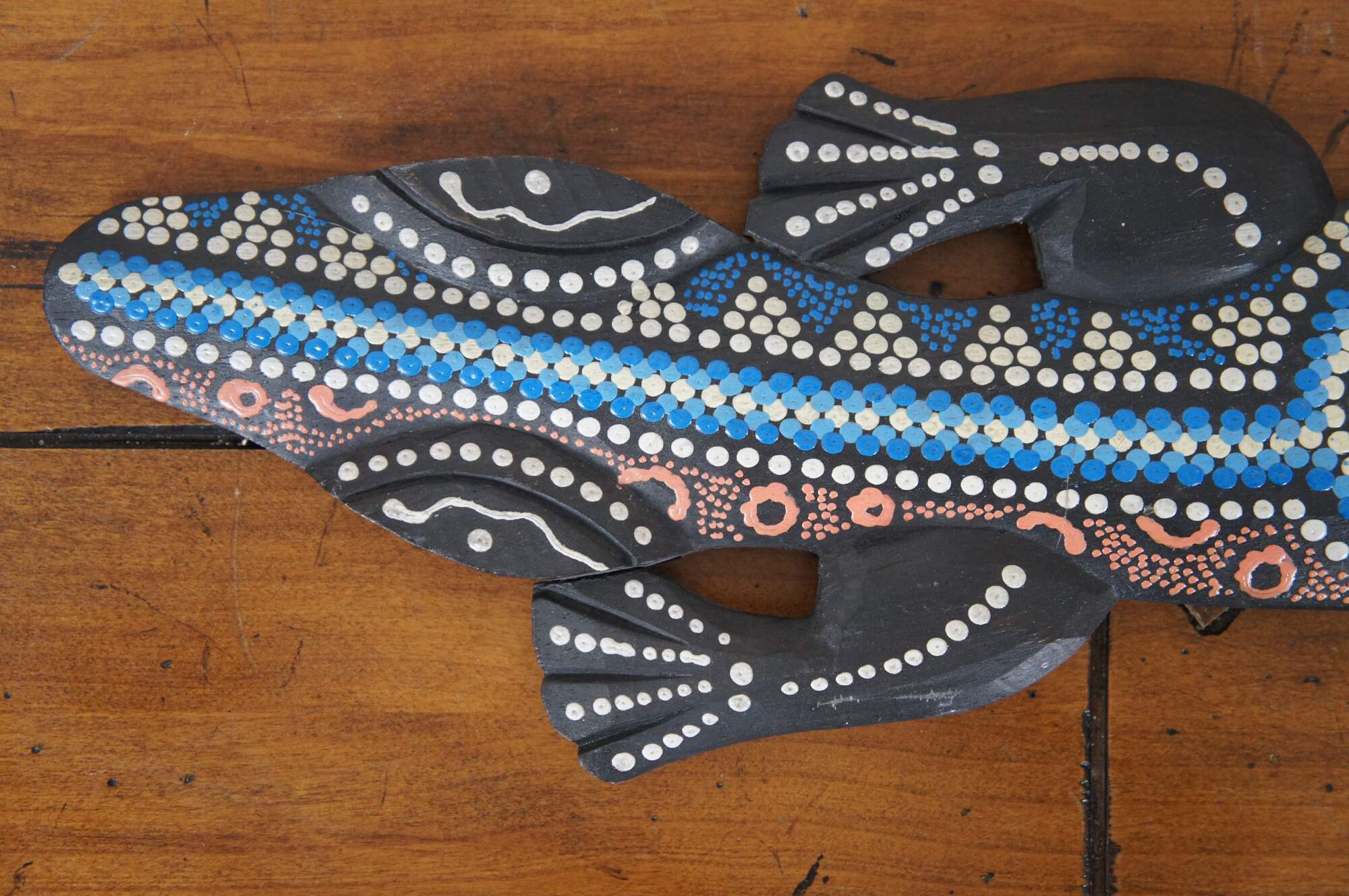 Vintage folk art wall hanging gecko / lizard, carved of light weight wood painted black and intricately decorated with dot art in blue, white, red, and salmon pink.