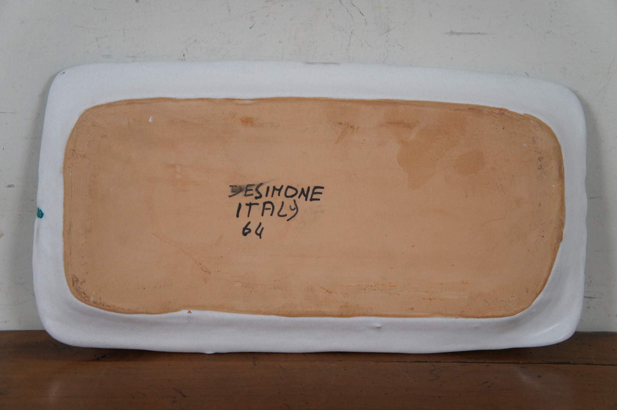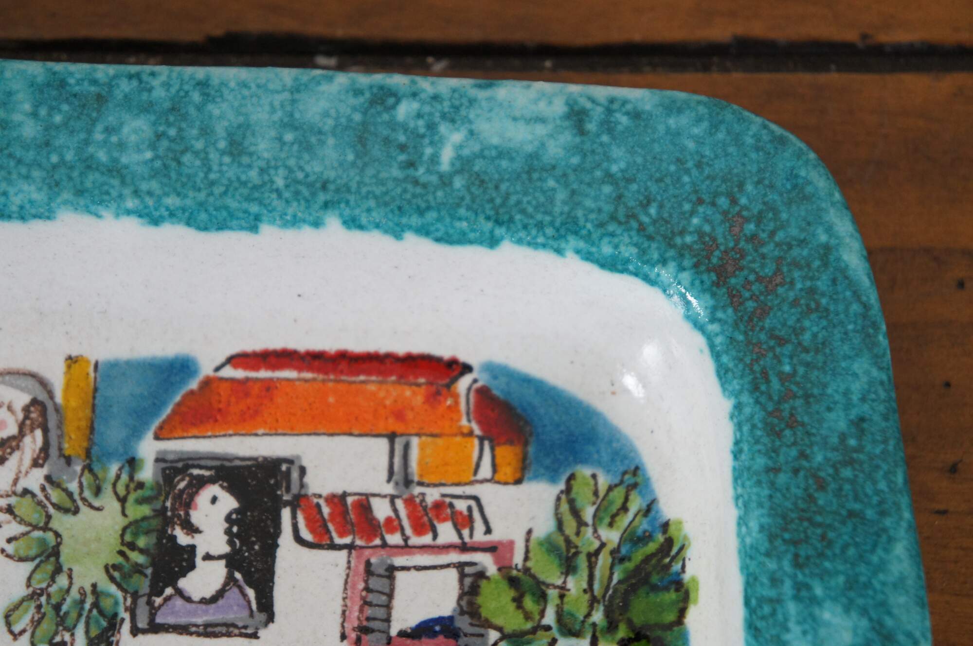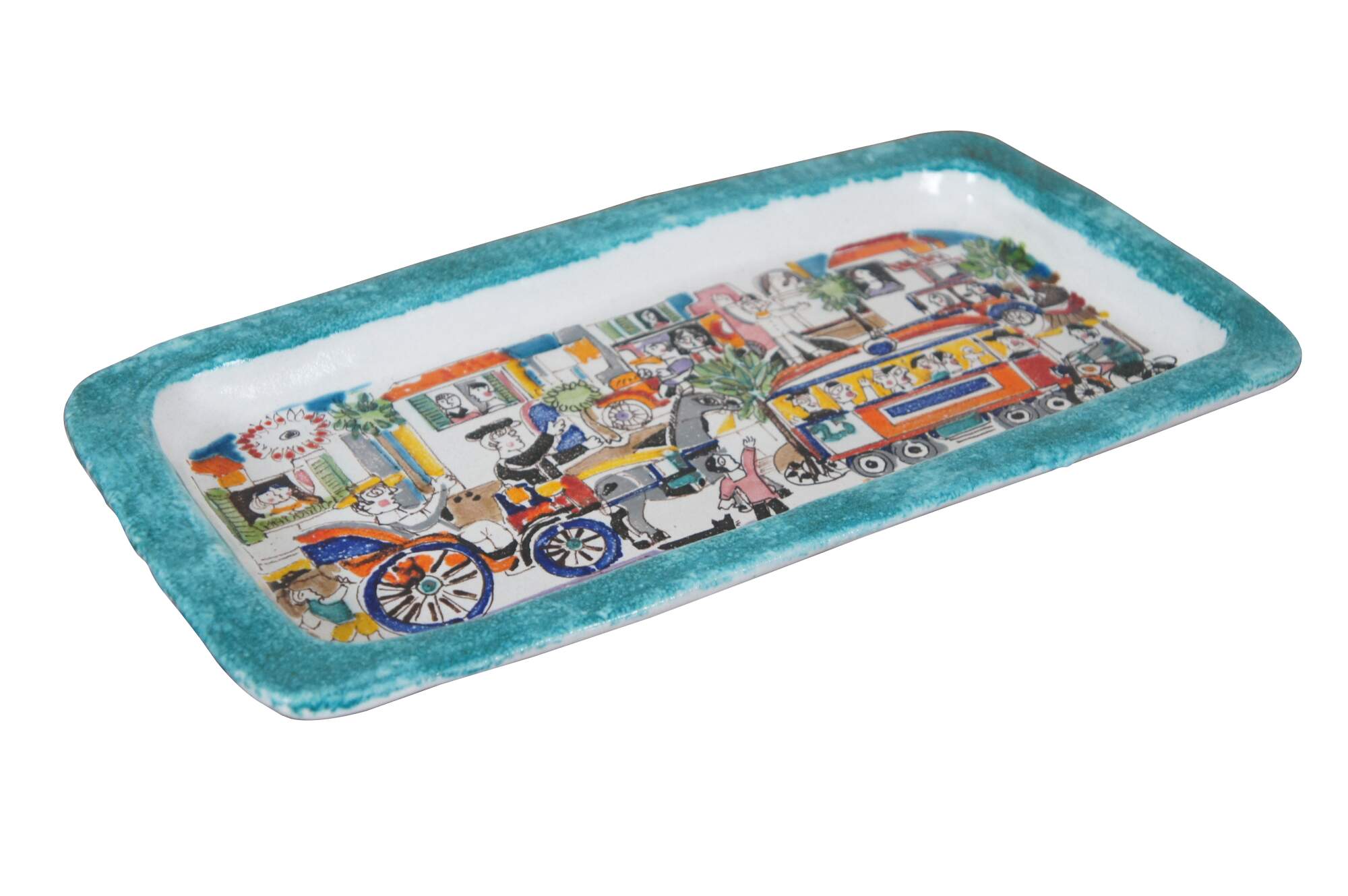 Vintage Italian ceramic pottery decorative serving tray by Ceramiche De Simone in their Folk line. Rectangular form with a teal blue border surround a bustling cityscape scene filled with a variety of figures and vehicles including cars, a trolley, motorbike, even a horse and carriage. Marked on back Desimone Italy 64. Item number VSS39FKE. MSRP: €132.00