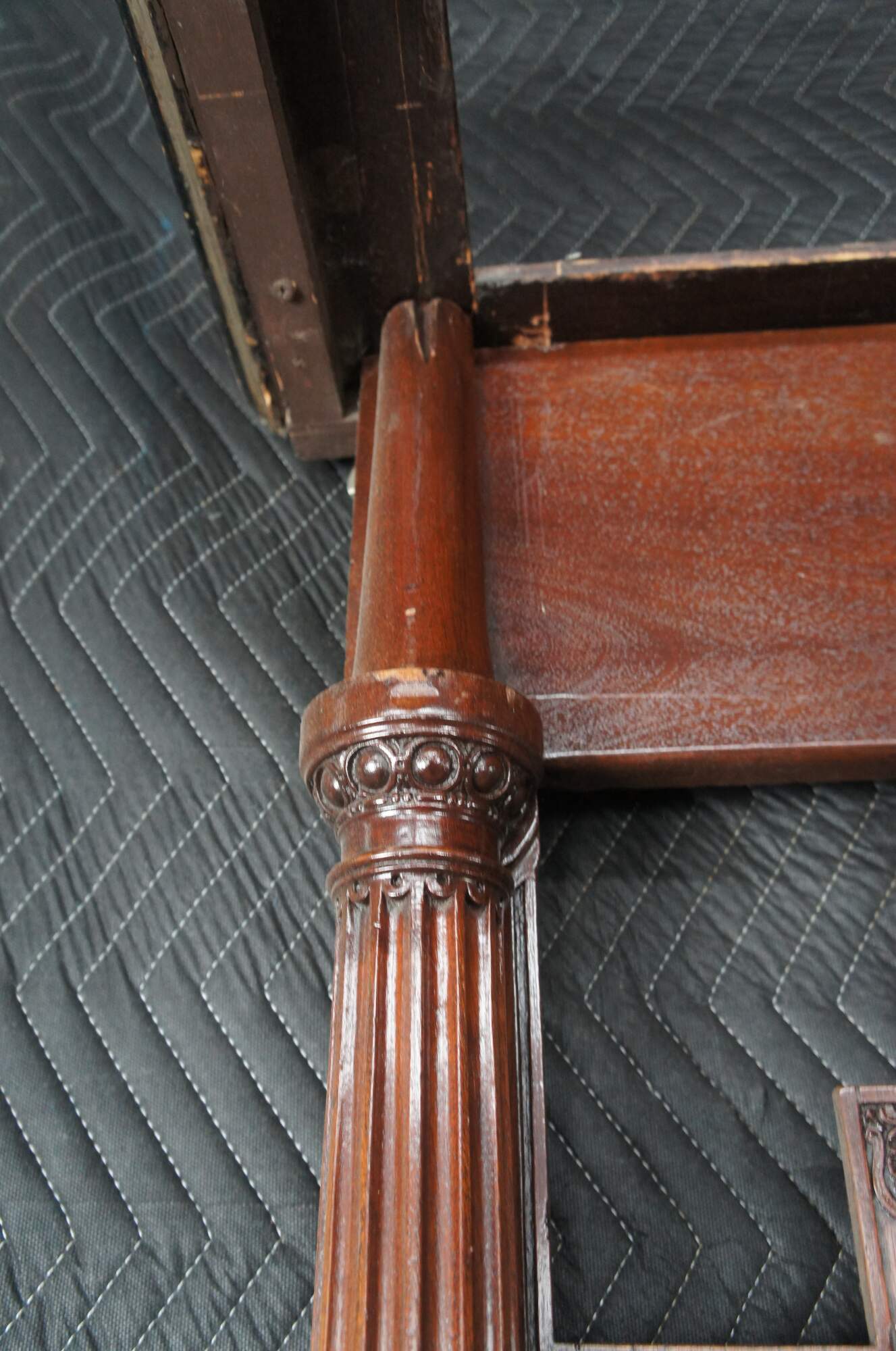 Features a solid mahogany frame with exceptionally carved detail. Includes geometric lattice designs along the headboard, ornate fretwork, turned fluted posts and an original hand painted neoclassical tester. The bed is supported by Marlborough legs with block feet. A stately furnishing that will add grandeur to any space.
