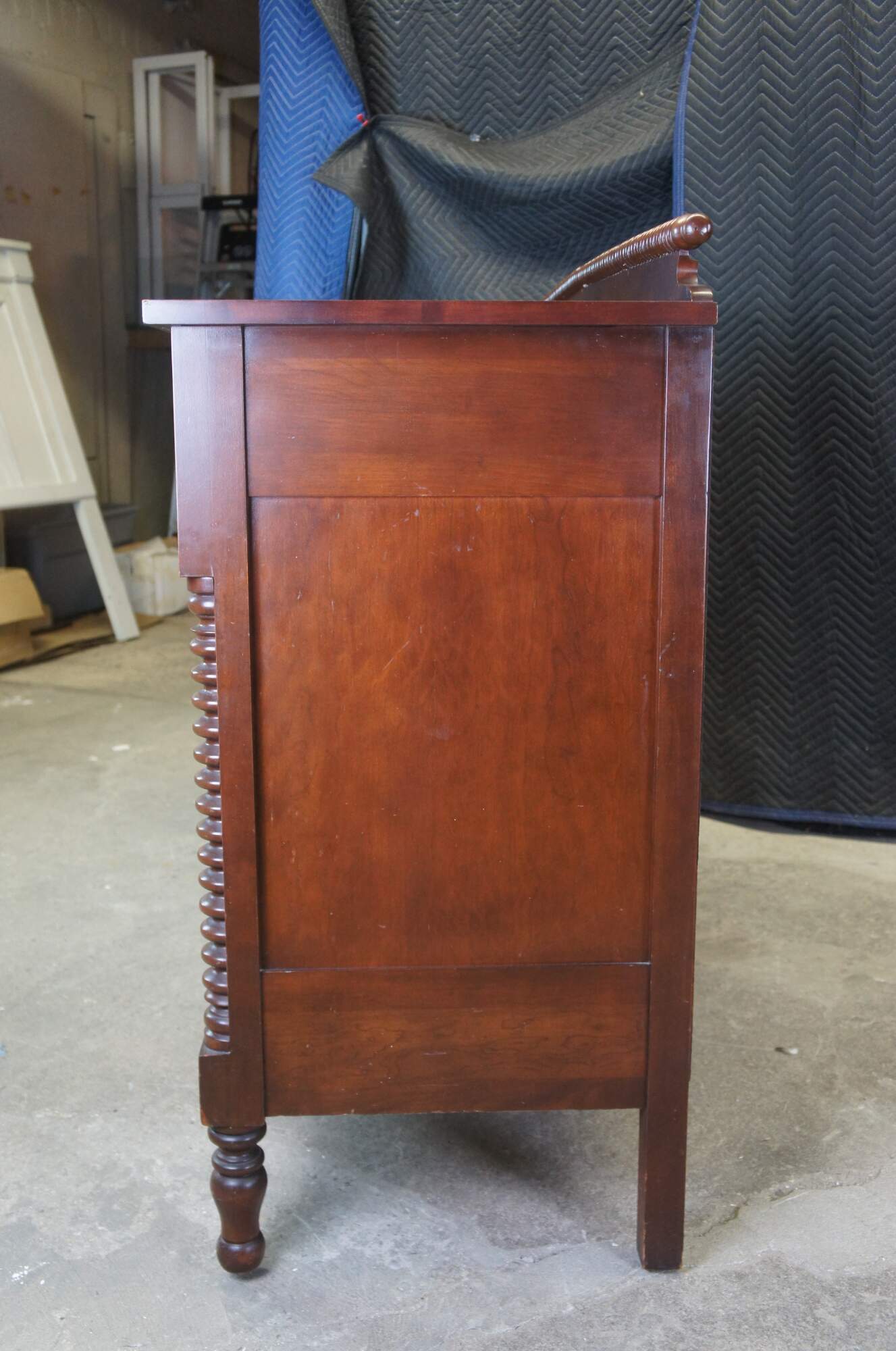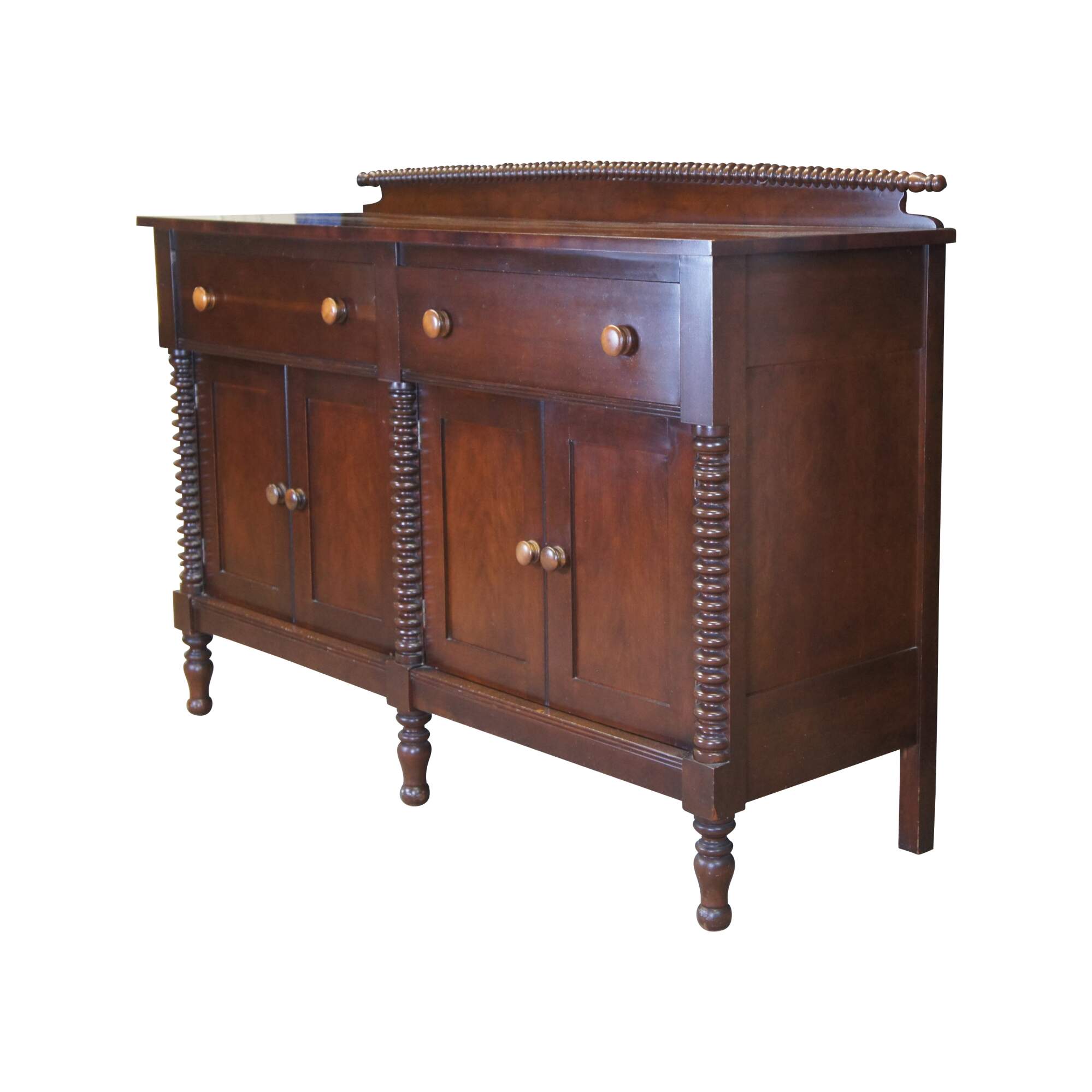 American Empire Revival Sideboard circa first half 20th century. Marked ""Styled by Park"". Features a rectangular form made from cherry with two large upper dovetailed drawers over lower cabients with shelf. Includes turned wooden knobs and applied spool turned columns along the front as well as a horizontal ribbed backsplash. The case is supported by turned turnip feet.