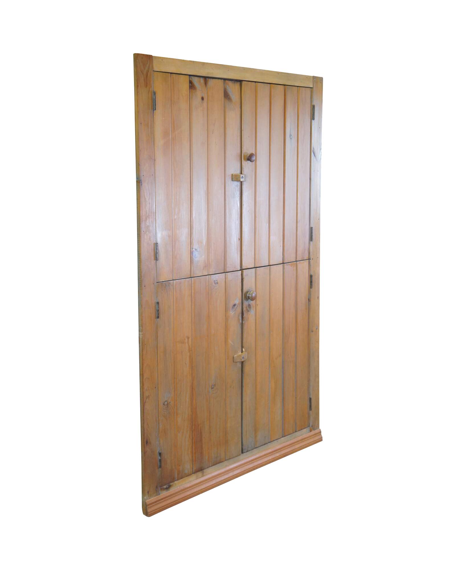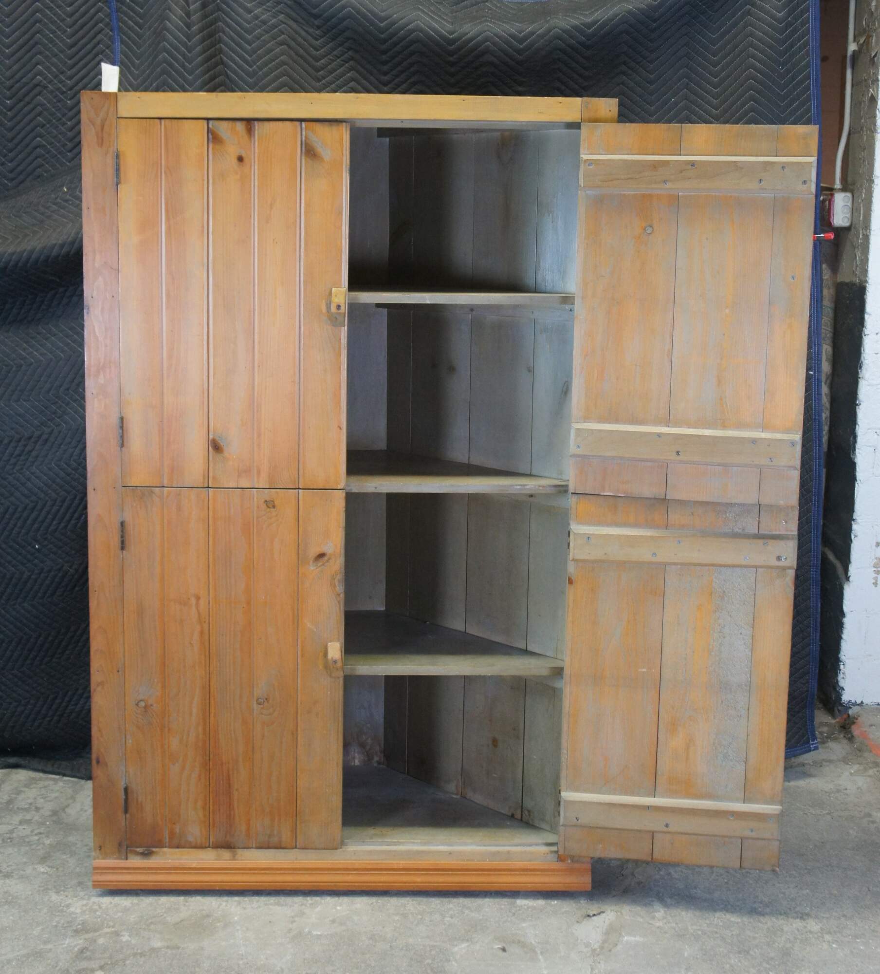 Lovely antique beadboard corner cabinet. Beadboard is wood paneling with vertical grooves and small ridges between each plank. It was Initially used to help protect walls in high-traffic areas of 19th-century homes. This charming corner cabinet is made from pine with an upper and lower paneled compartment opening to three shelves. The cabinet features wooden pulls and latches.