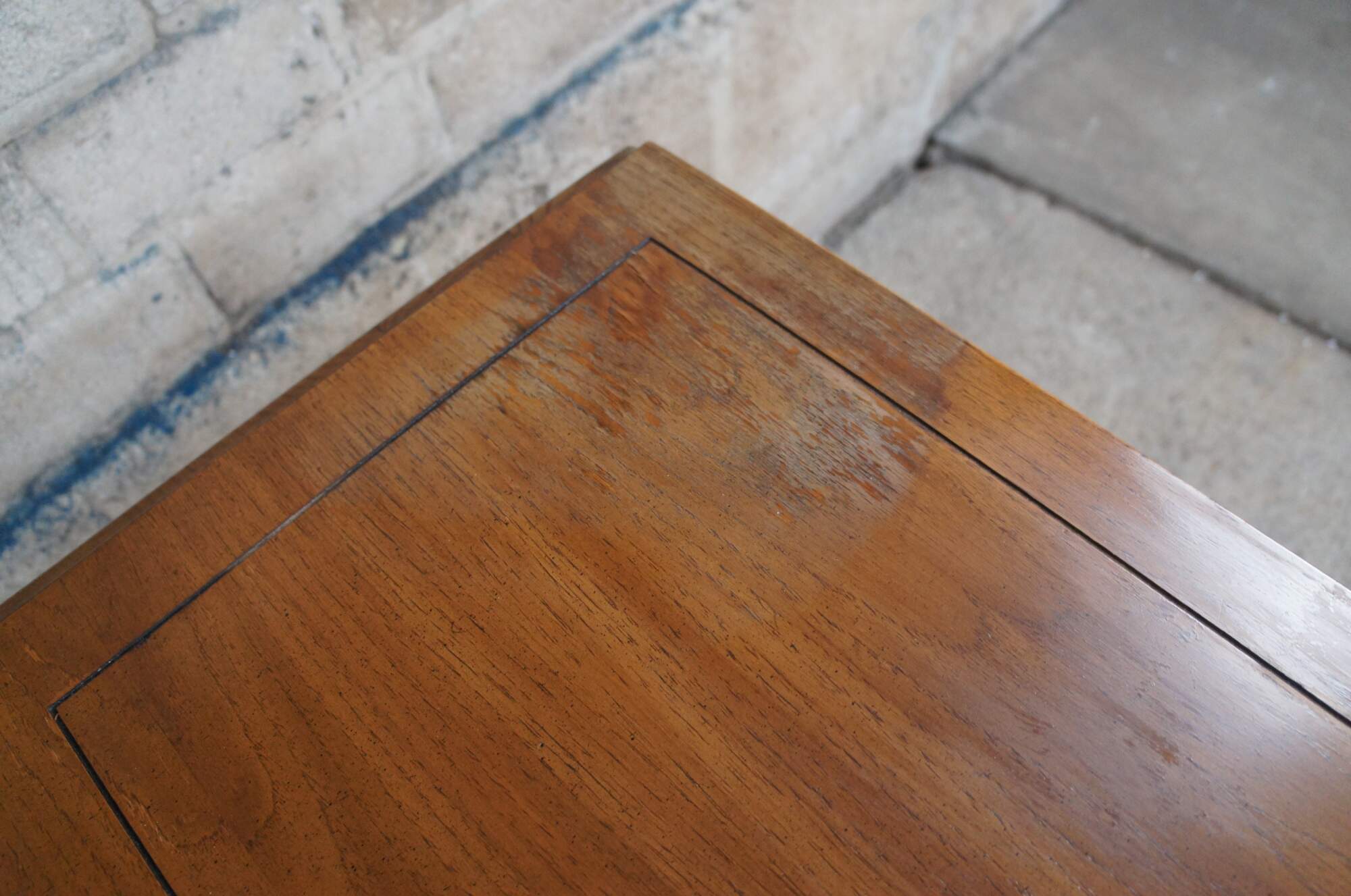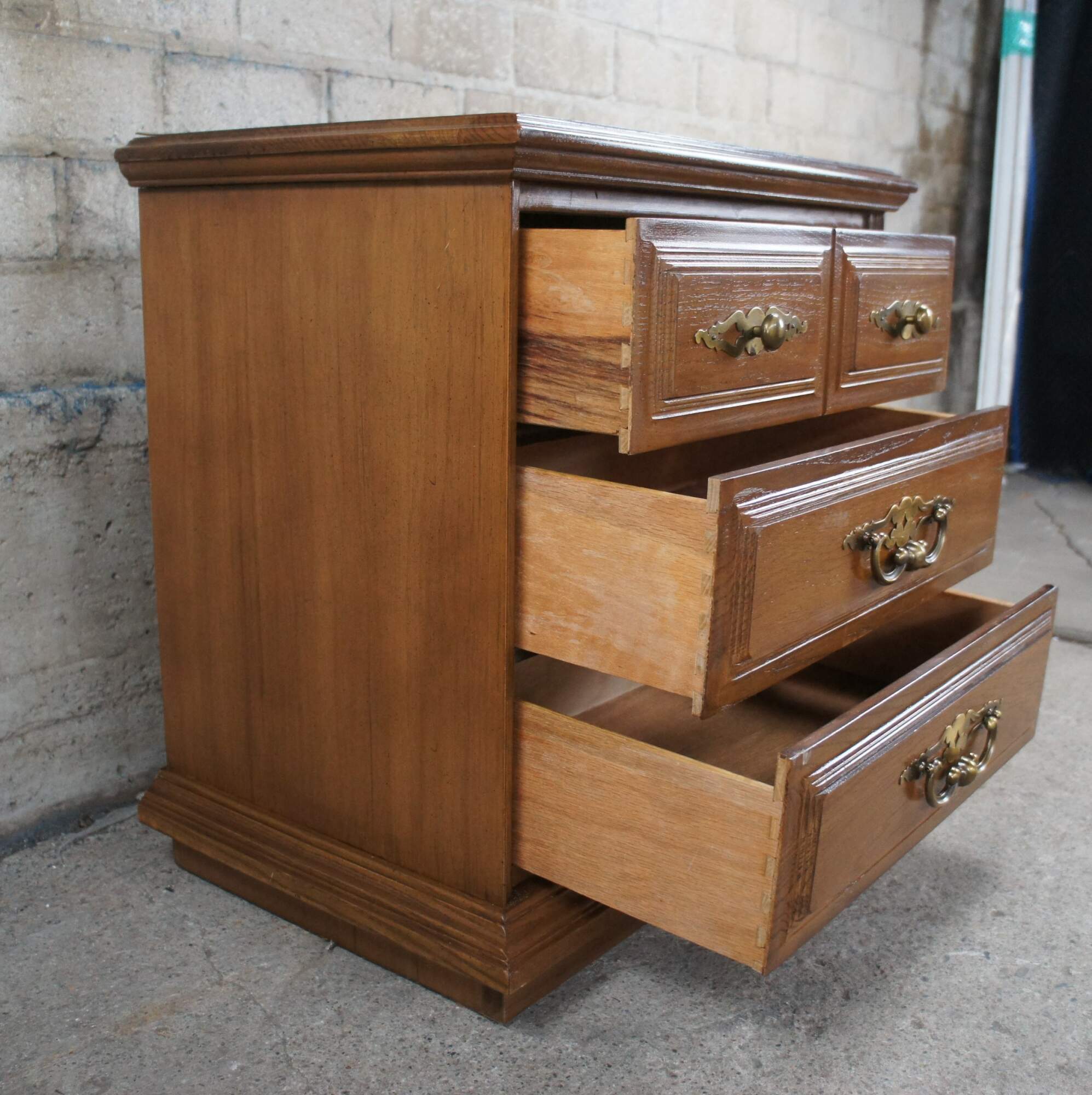 Stanley Furniture nightstand, circa 1980s. Made from oak with three dovetailed drawers and brass hardware.