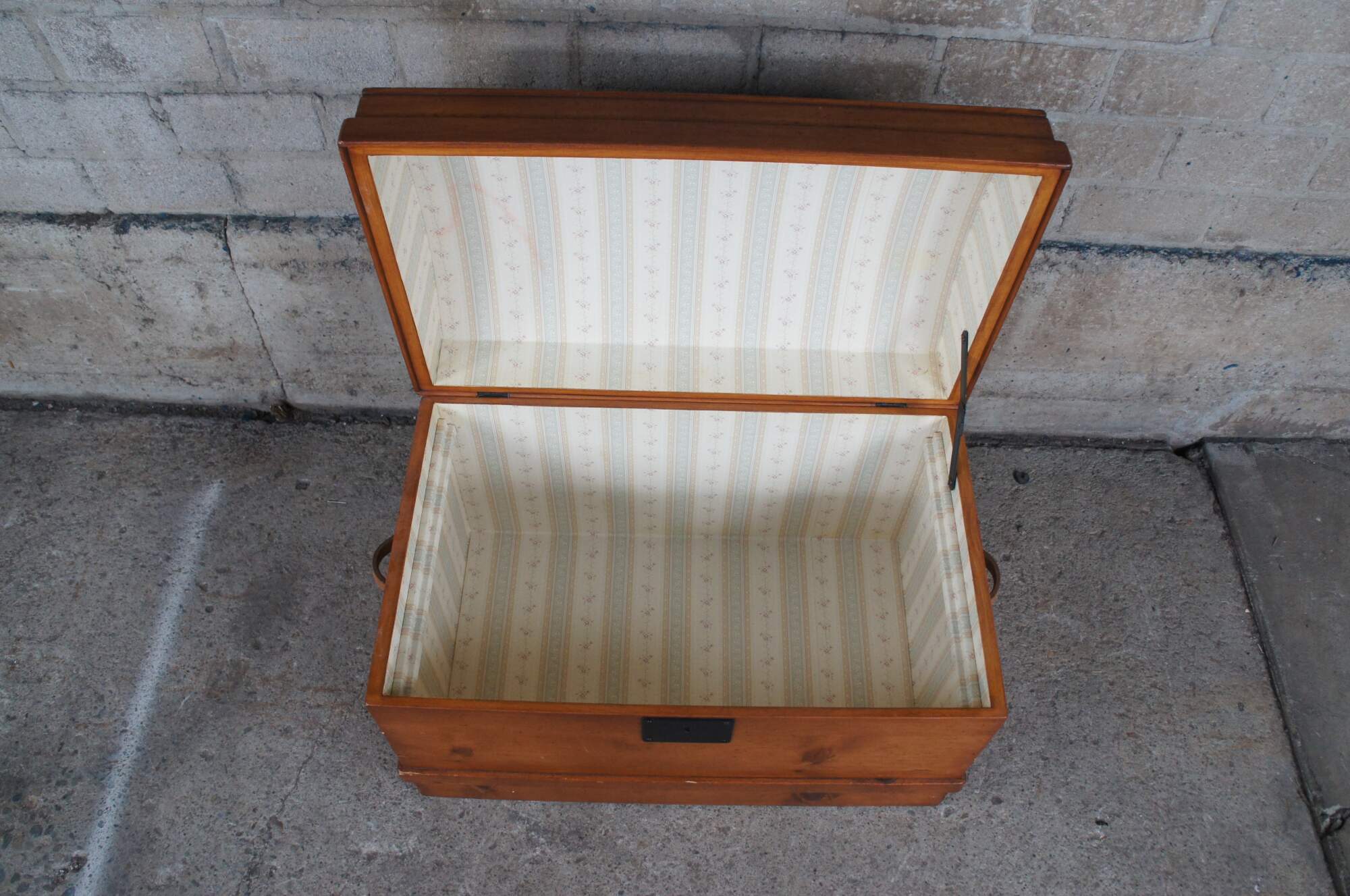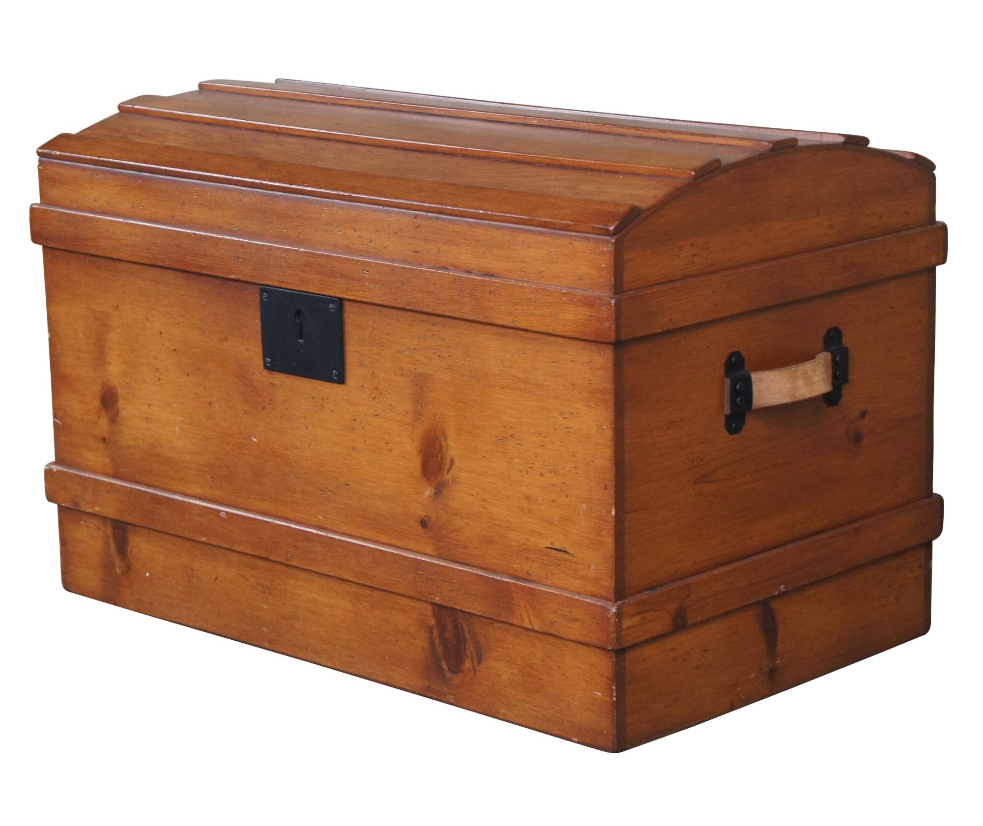 A Victorian style dome top trunk from the latter half of the 20th Century. Made from pine with leather handles and an iron escutcheon plate. Opens to a striped linen interior with removable tray.