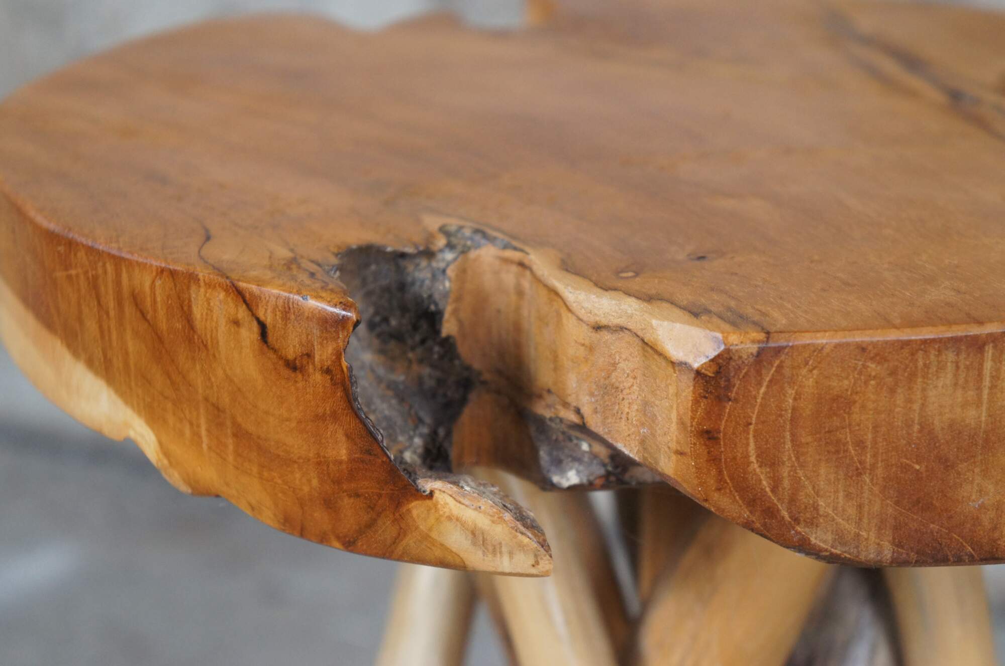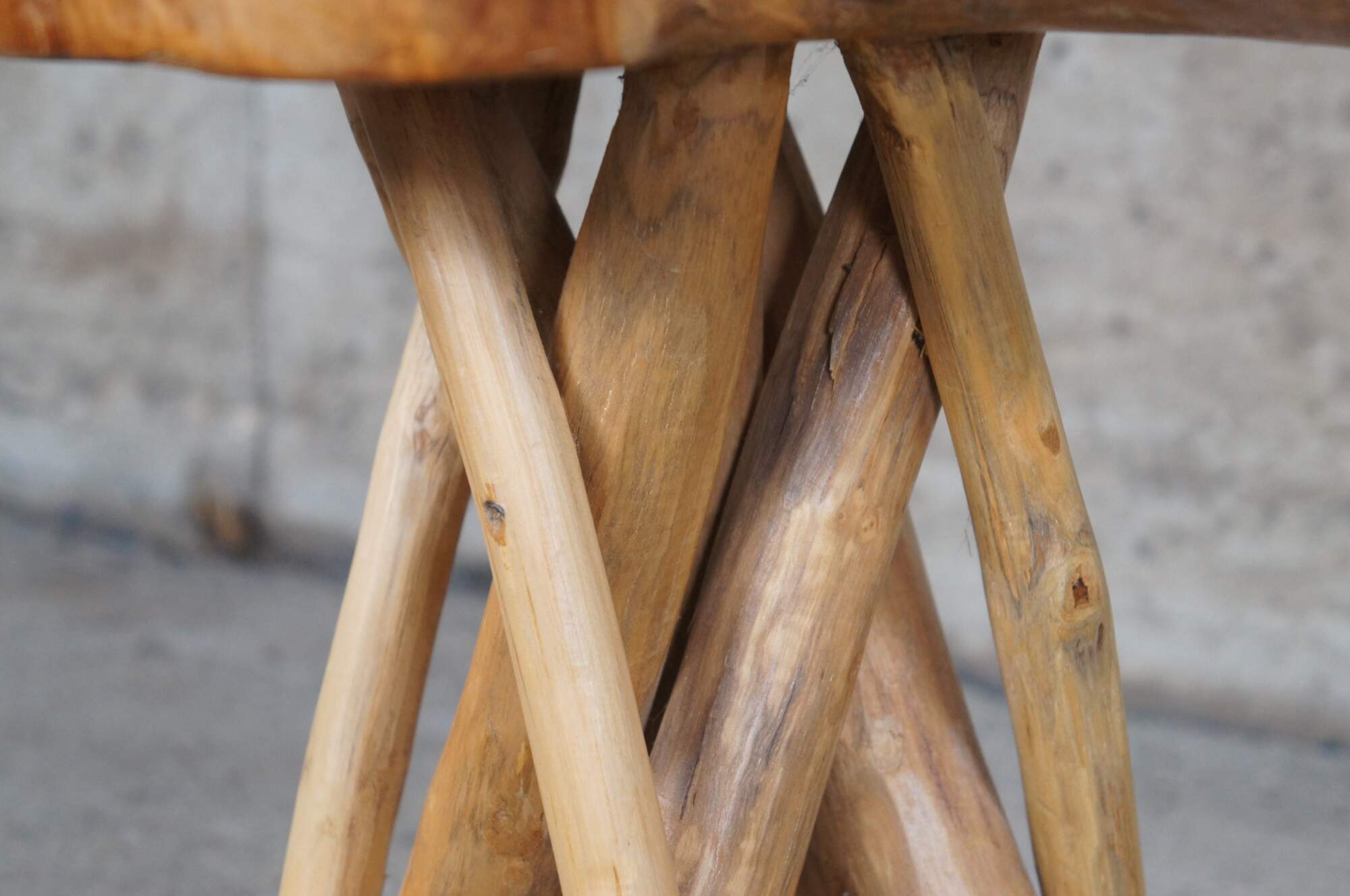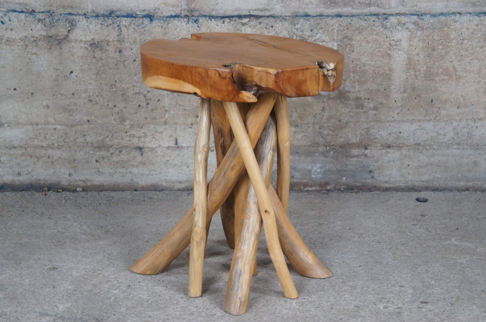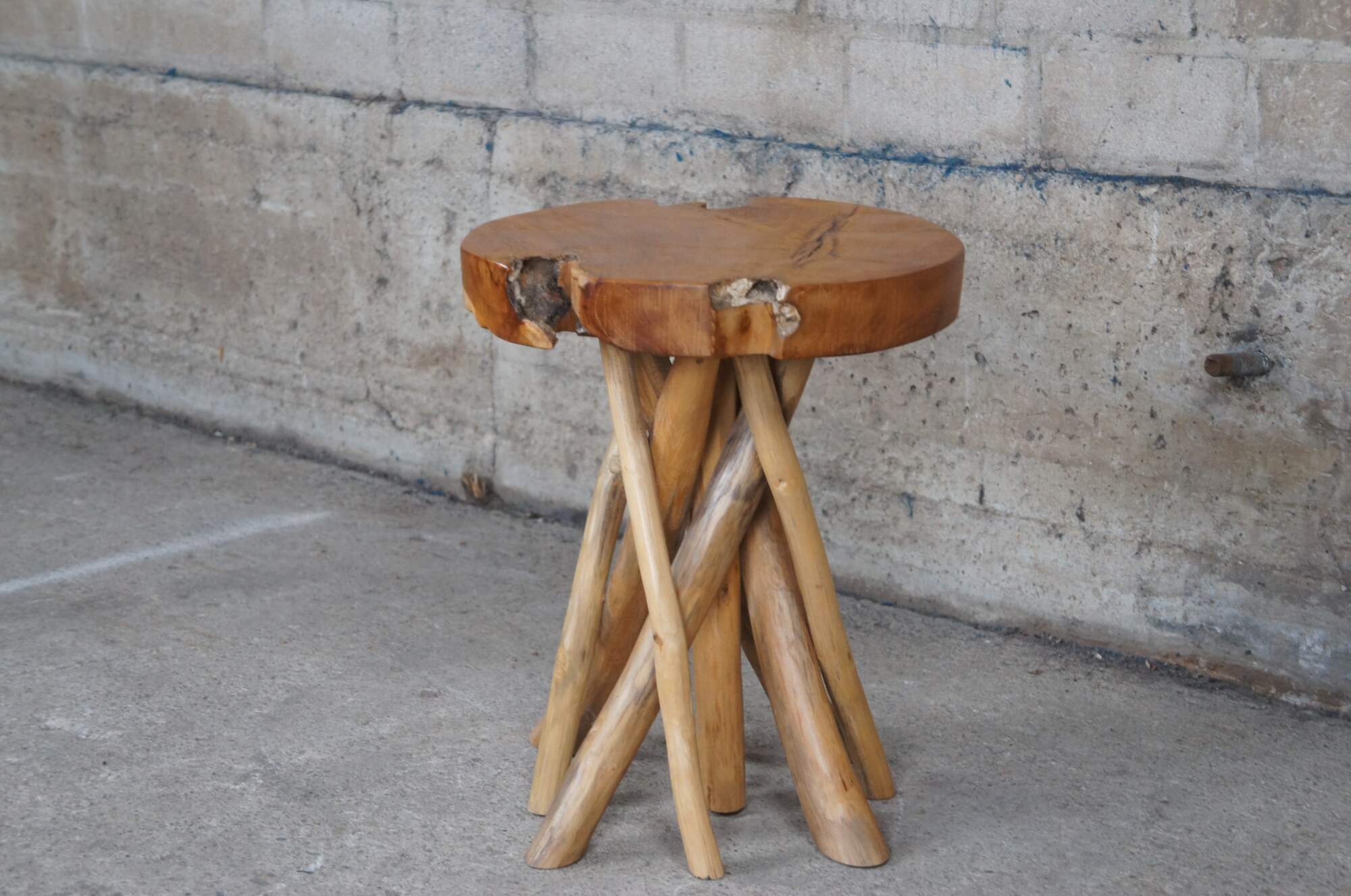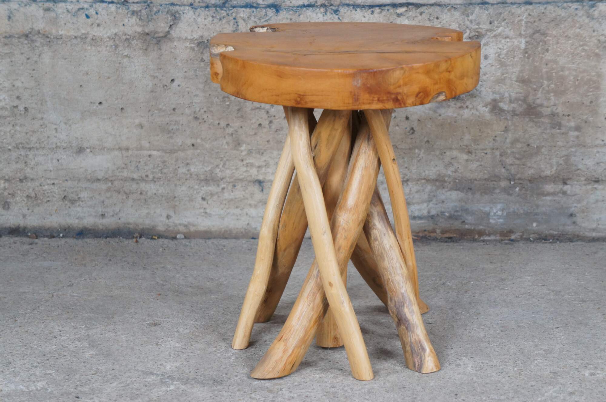 Intriguing farmhouse or lodge side table. Features a teak slab top over branch base. Great for use next to a chair or even as a stool / seat.