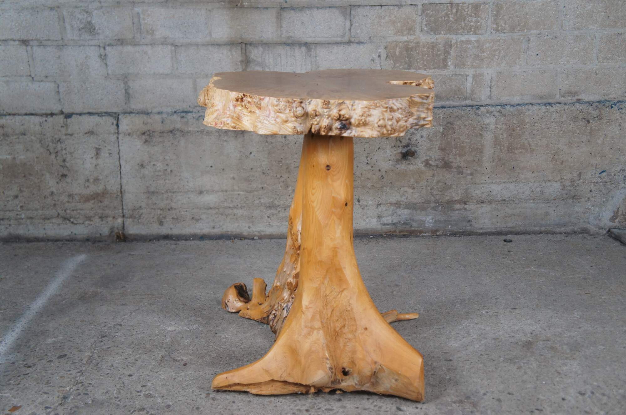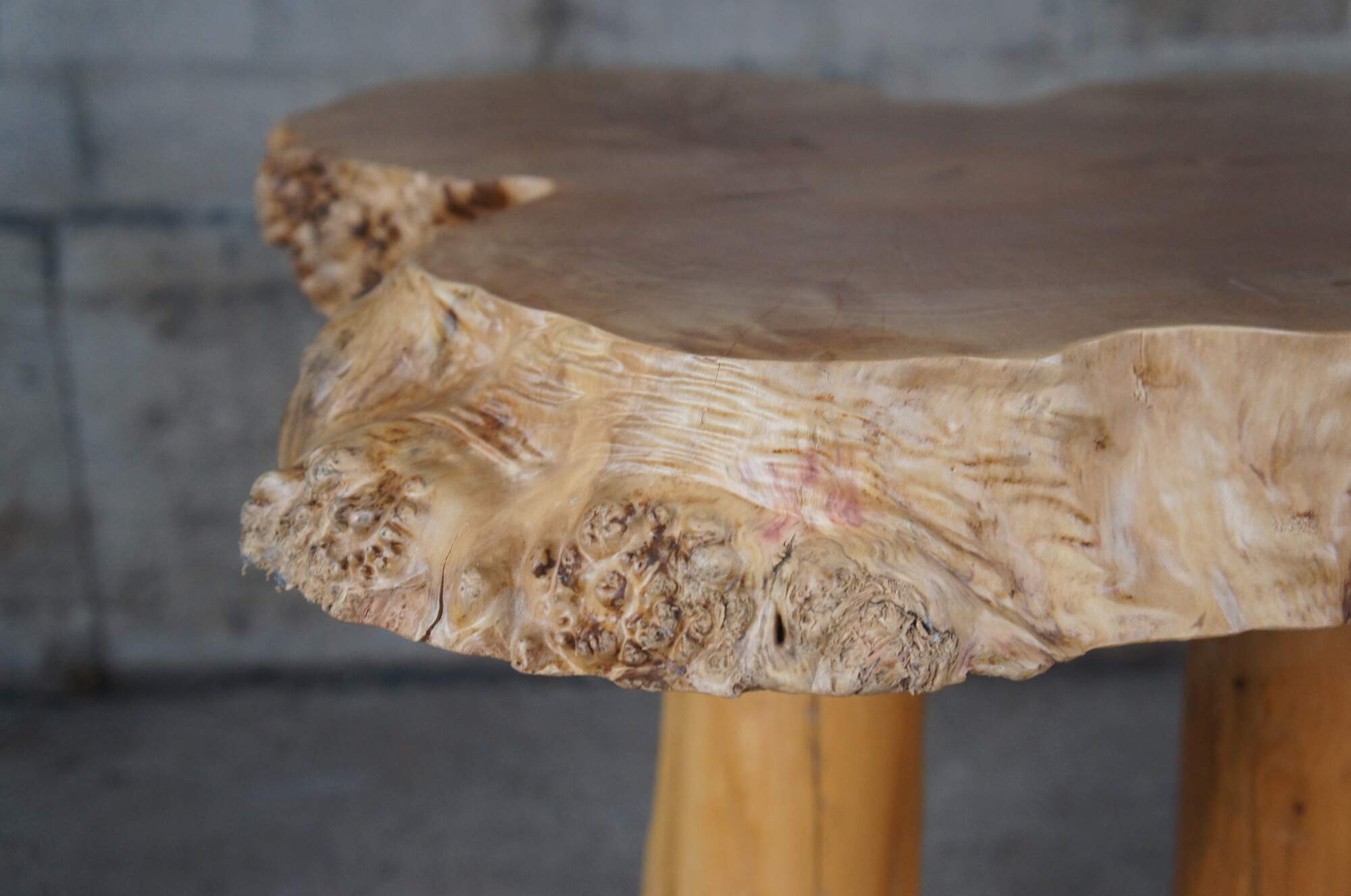 An impressive farmhouse or lodge side table. Features an Maple Burl live edge slab top over branched base. Great for use next to your favorite lounge chair as a cocktail or martini end table.