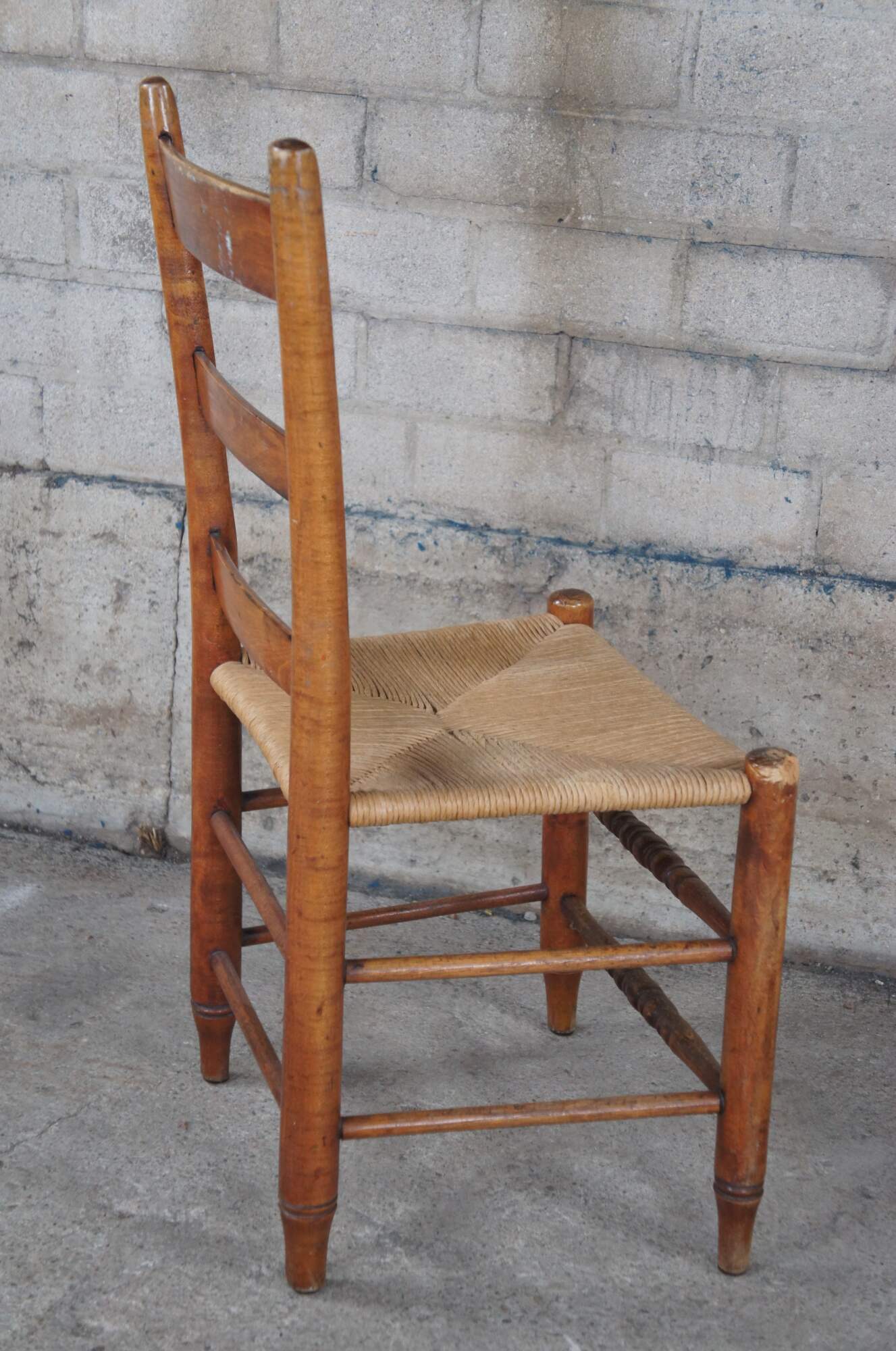 Two primitive antique ladderback chairs. Made of maple featuring turned supports, with rush seat and ladder back.