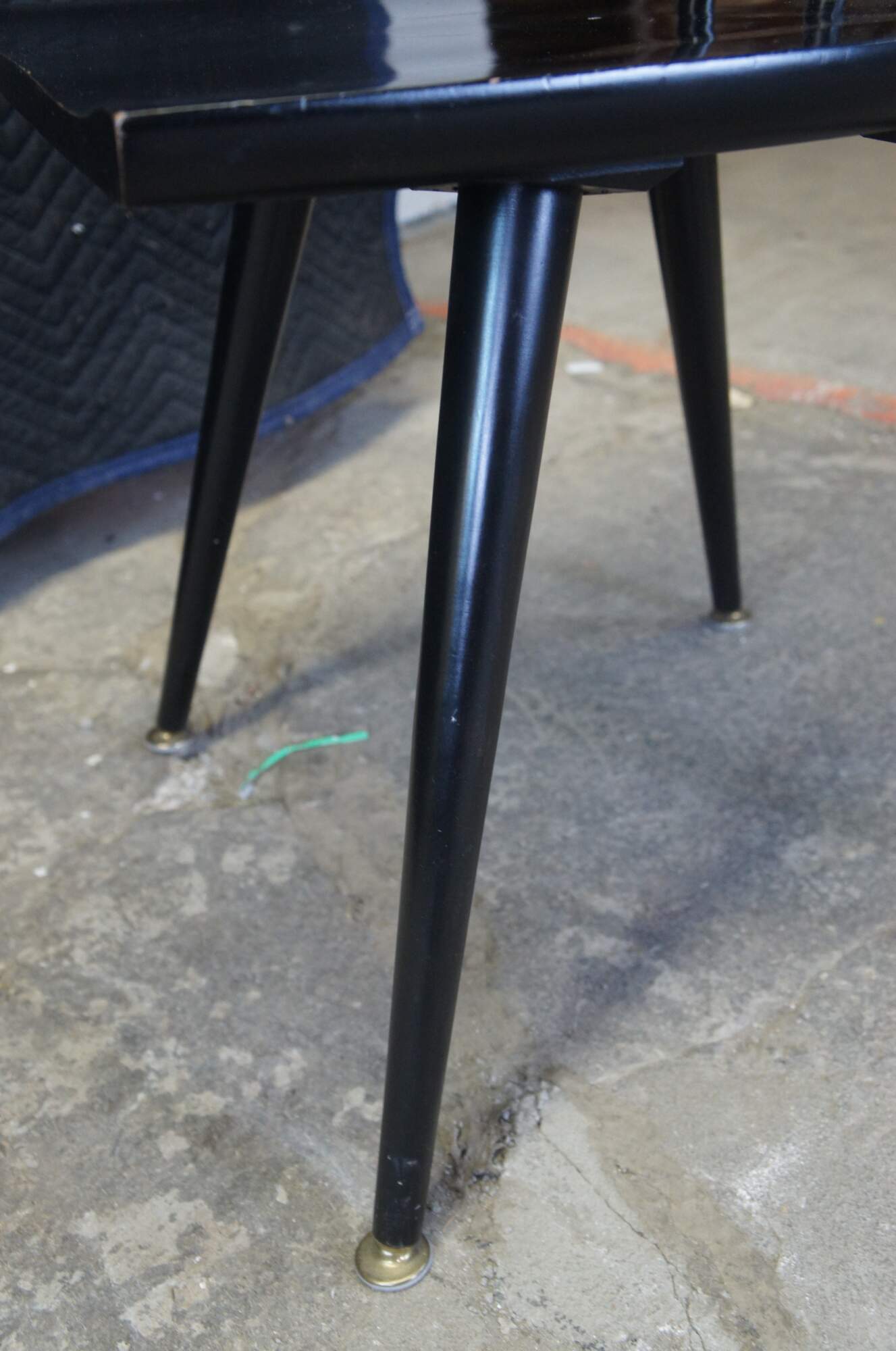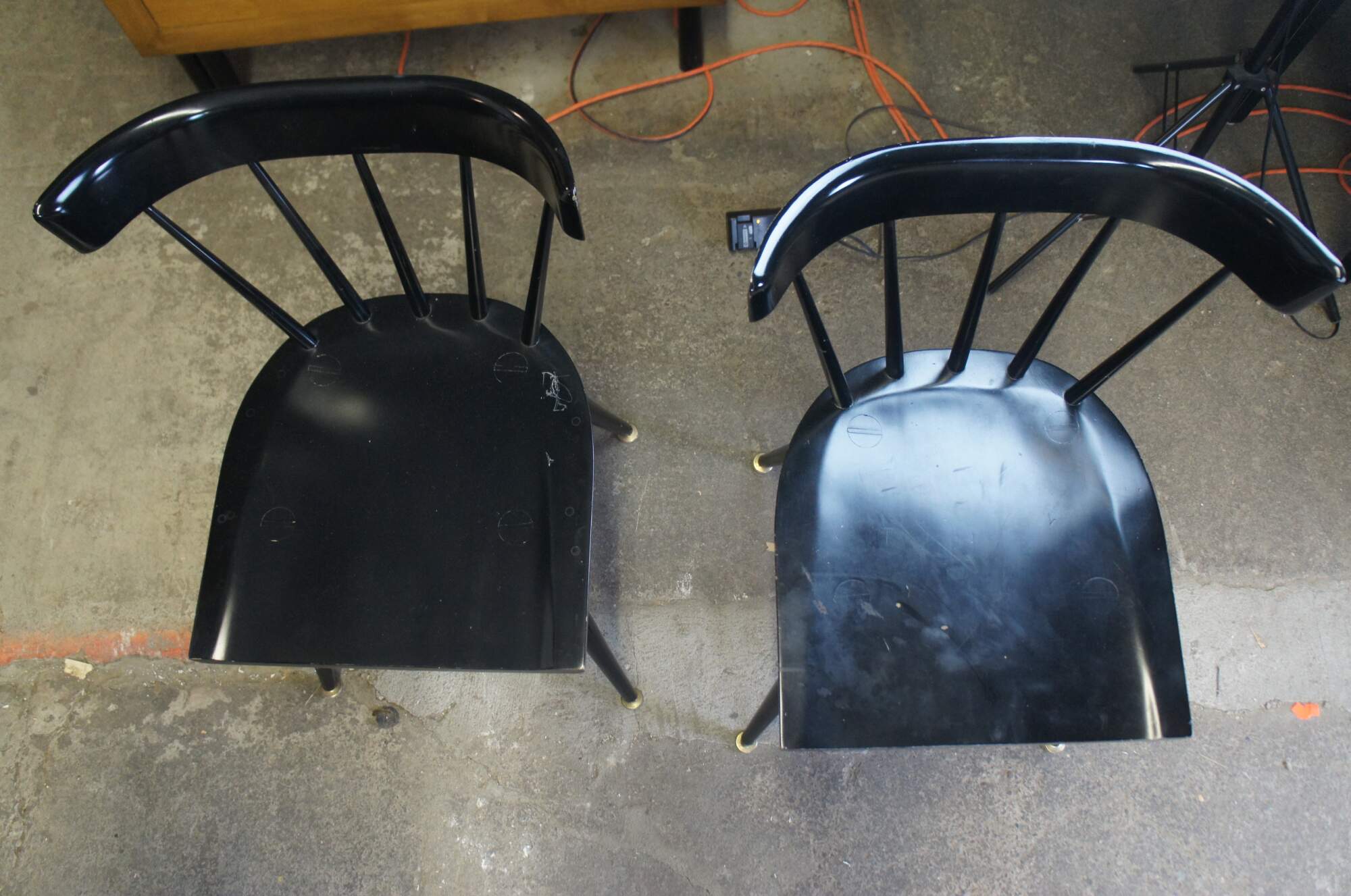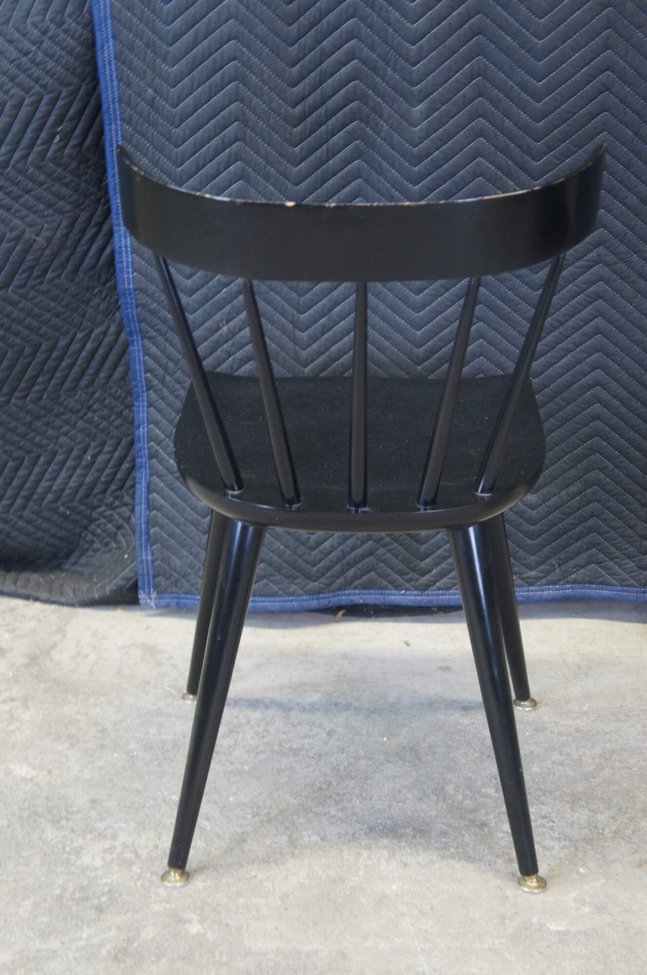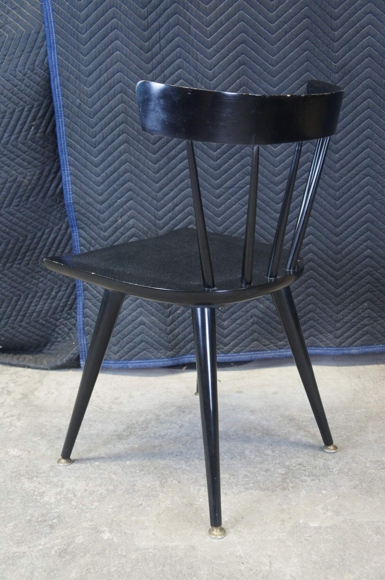 Set of four Mid-Century Modern Paul McCobb for Planner Winchendon dining chairs. These sleek Windsor style chairs are made from maple with a black lacquer finish. Feature curved backs, five rounded spindles, contoured seats and tapered legs.