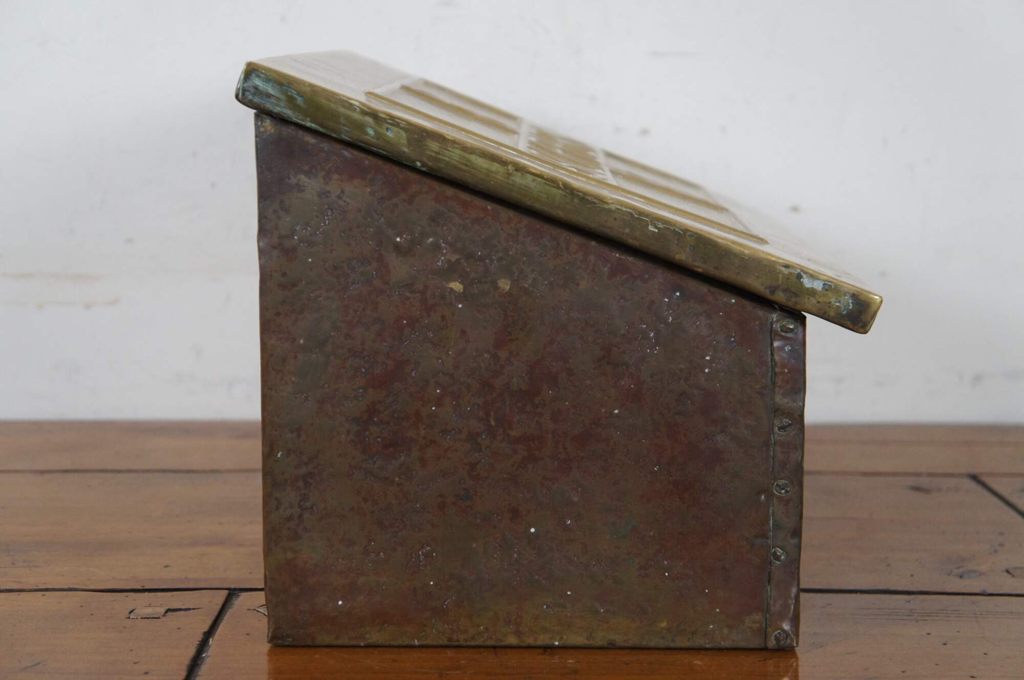 Late 19th century brass and wood lined slipper box. Rectangular form with sloped flip top lid, embossed with the label “Slippers” in a simple but elegant frame. Traditionally placed by the fireside to warm one’s house slippers in before wearing.