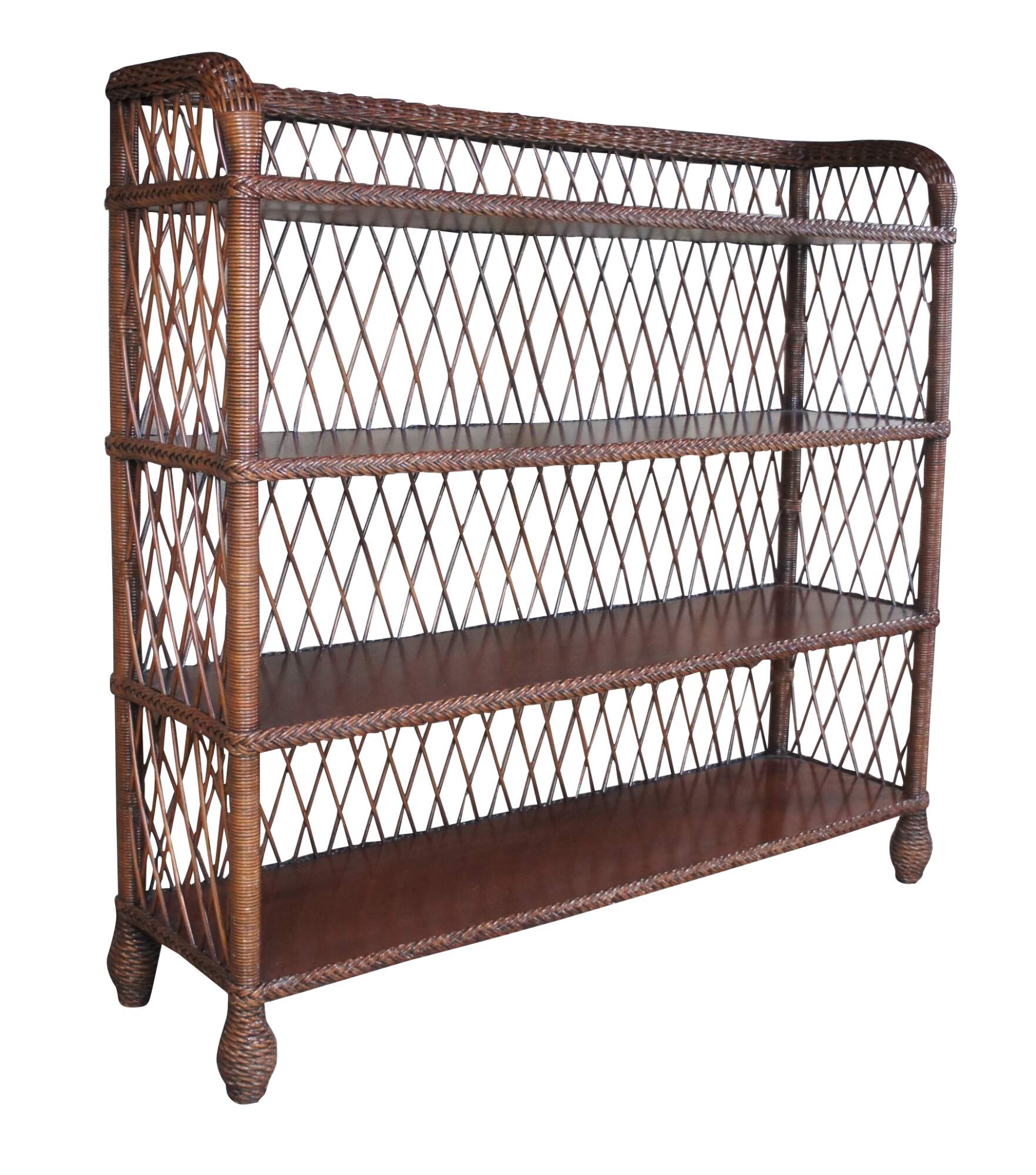 The Conservatory Bookcase by Ralph Lauren is a Modern Bohemian take on Late Victorian and Edwardian styling. Made from Mahogany and braided wicker with lattice back and sides. Includes four shelves over bun feet.