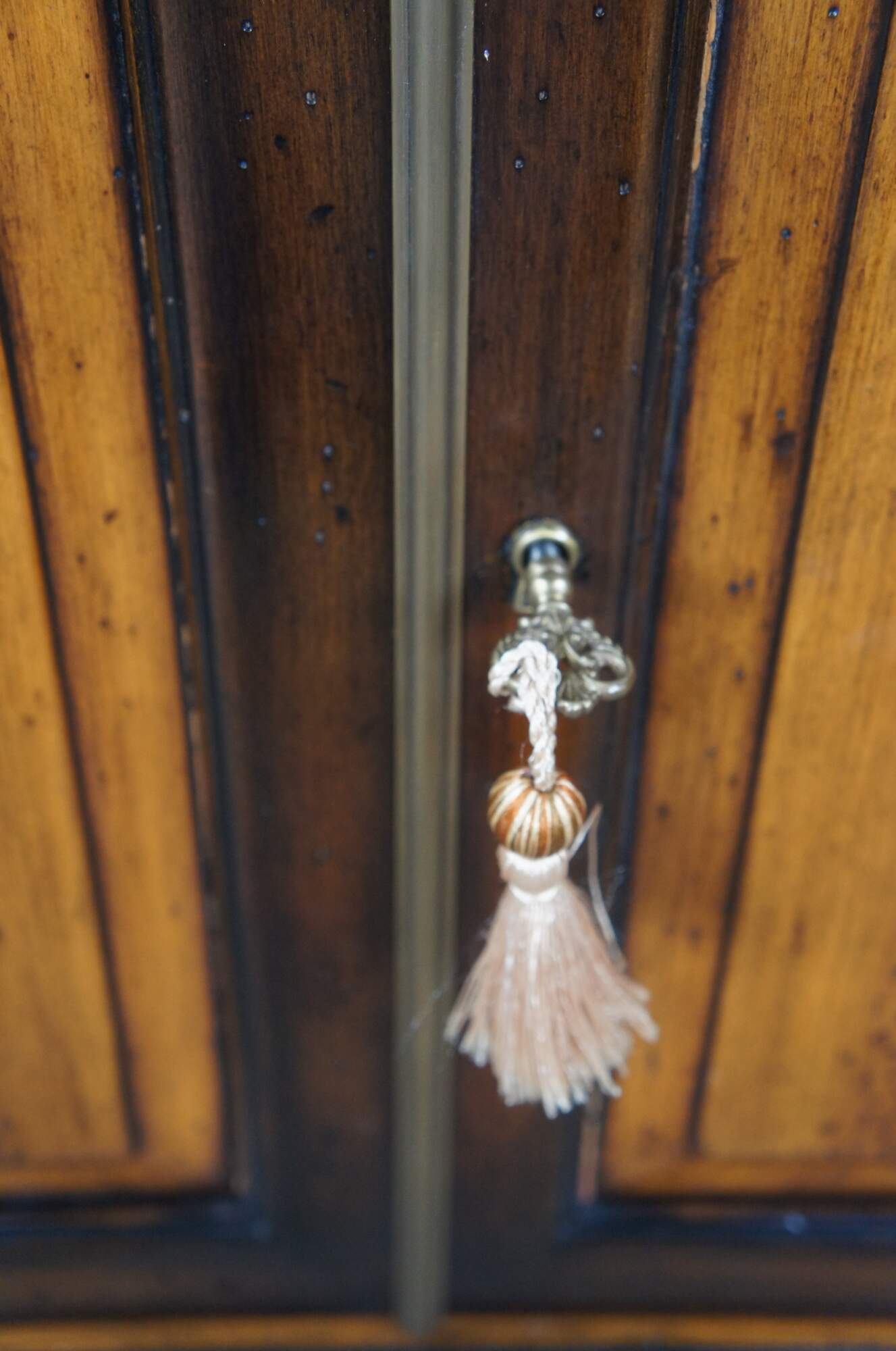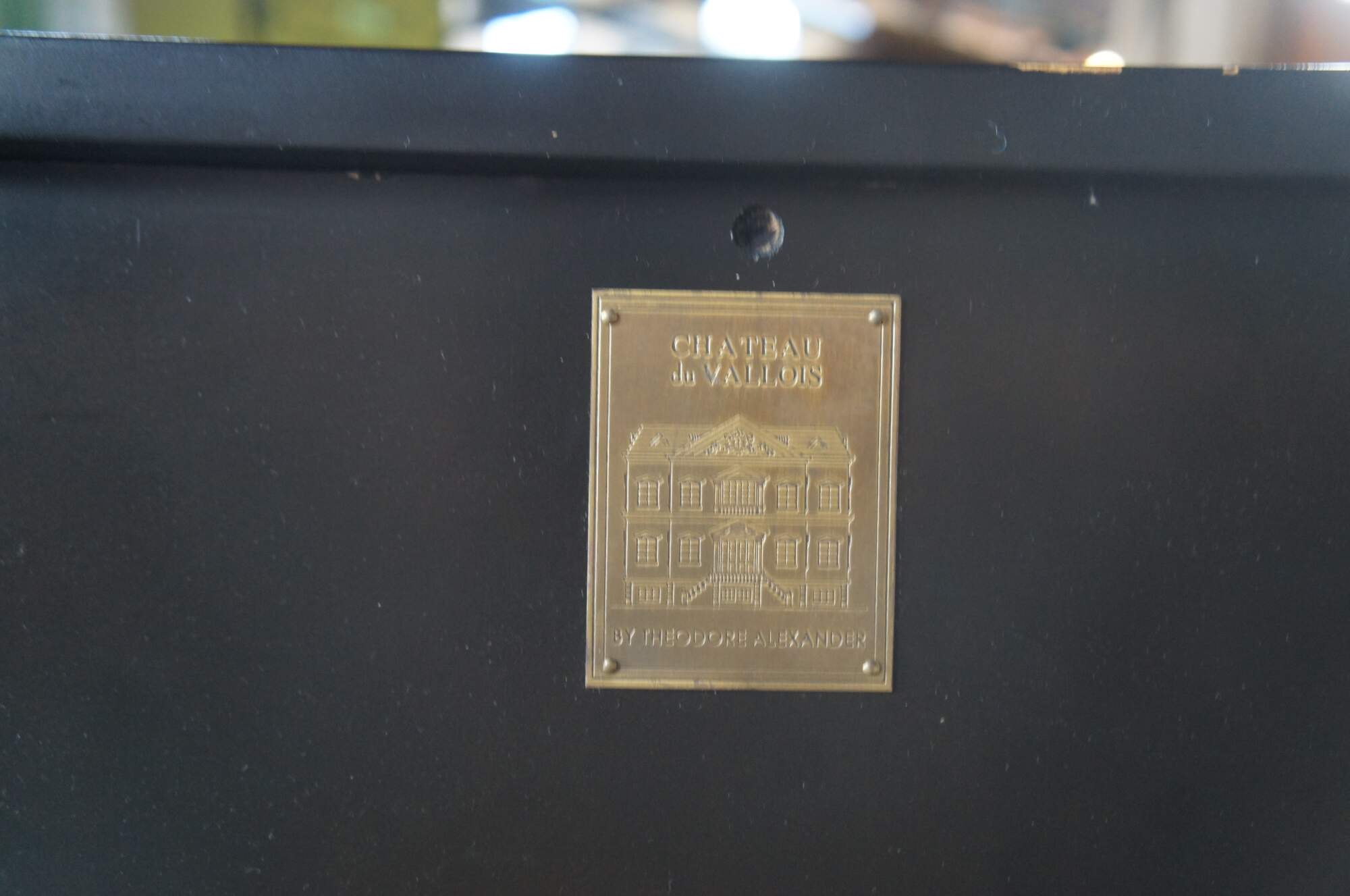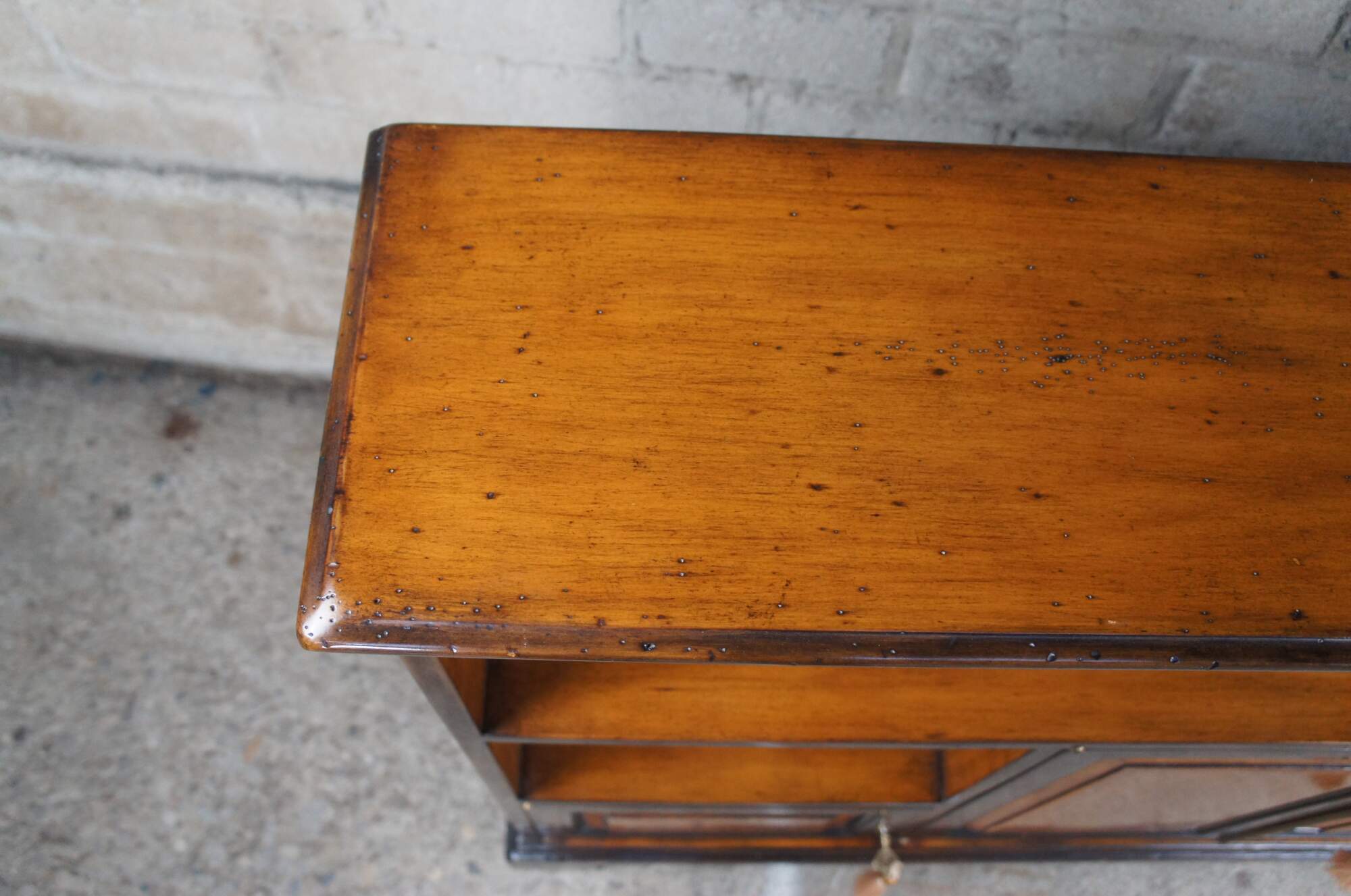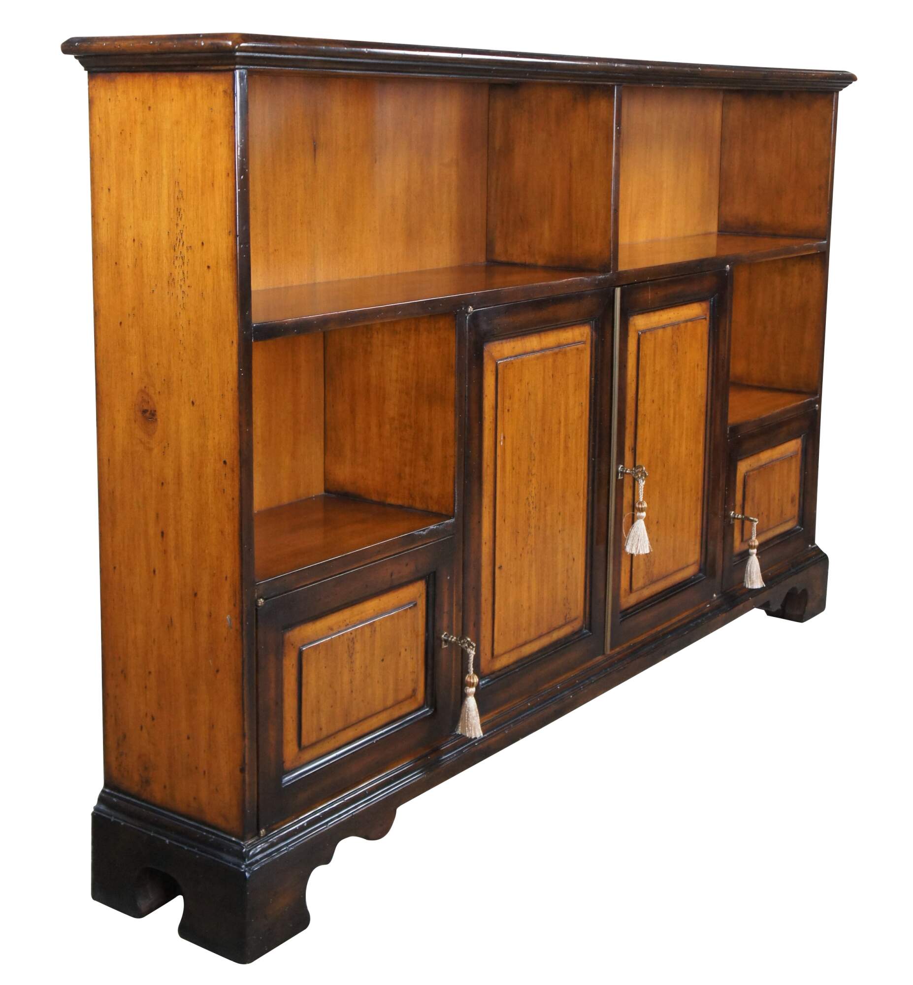 Vintage Theodore Alexander Chateau du Vallois petite console or book shelf cabinet, circa last quarter 20th century. Made of mahogany with a two tone French Provincial styling. Features a slender rectangular frame with cubbies for books or collectibles and three lower lockable cabinets for accessory storage. The case is supported by bracket feet. Marked Chateau du Vallois along backside with brass plaque.