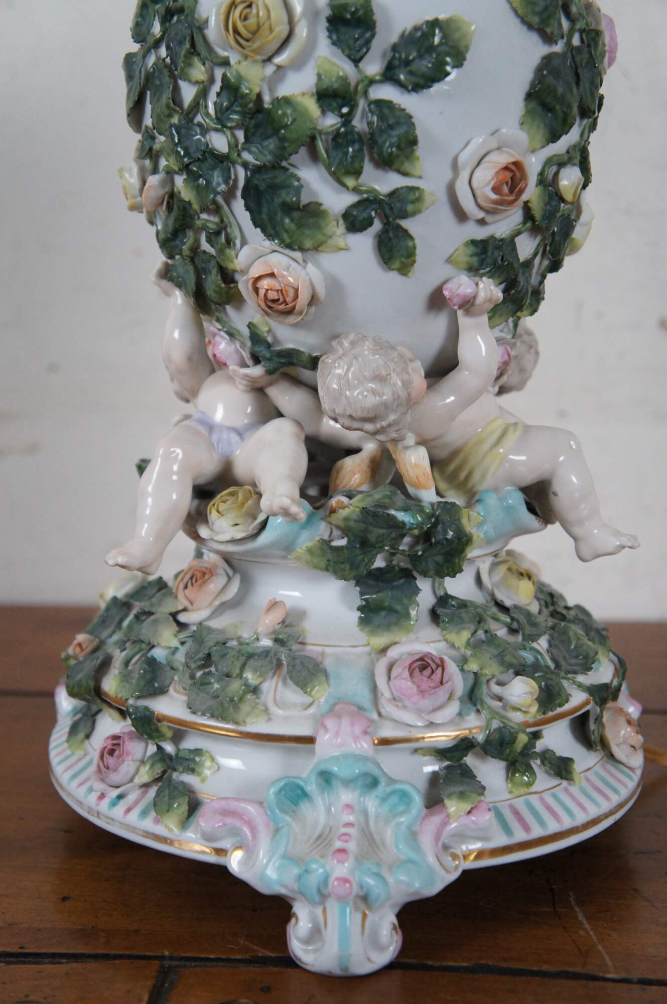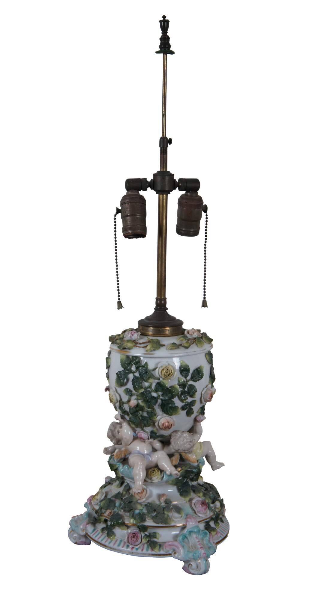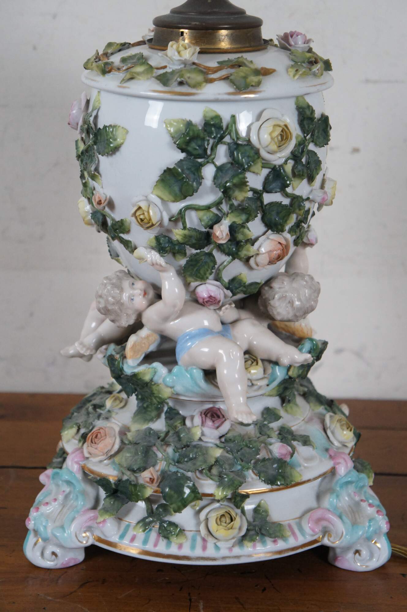 Antique German Sitzendorf Dresden converted oil lamp mantel trophy urn featuring a design of climbing roses and reclining cherubs. Marked on base with crossed lines, circa 1884 - 1902. Includes round white scalloped edge shade with braided trim.