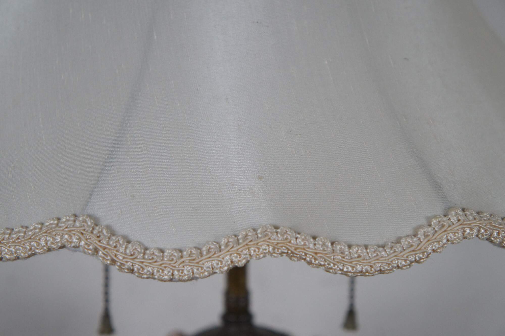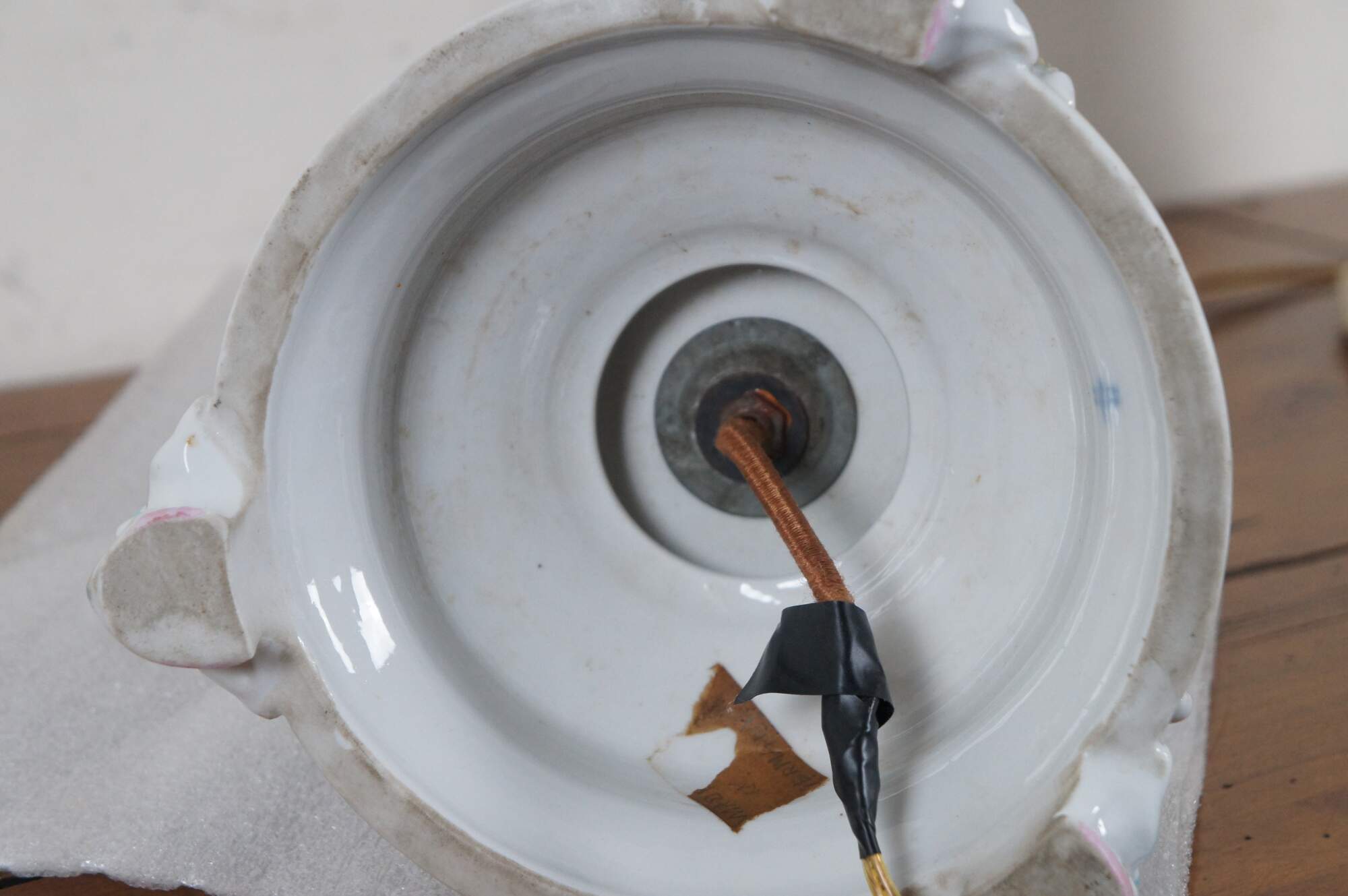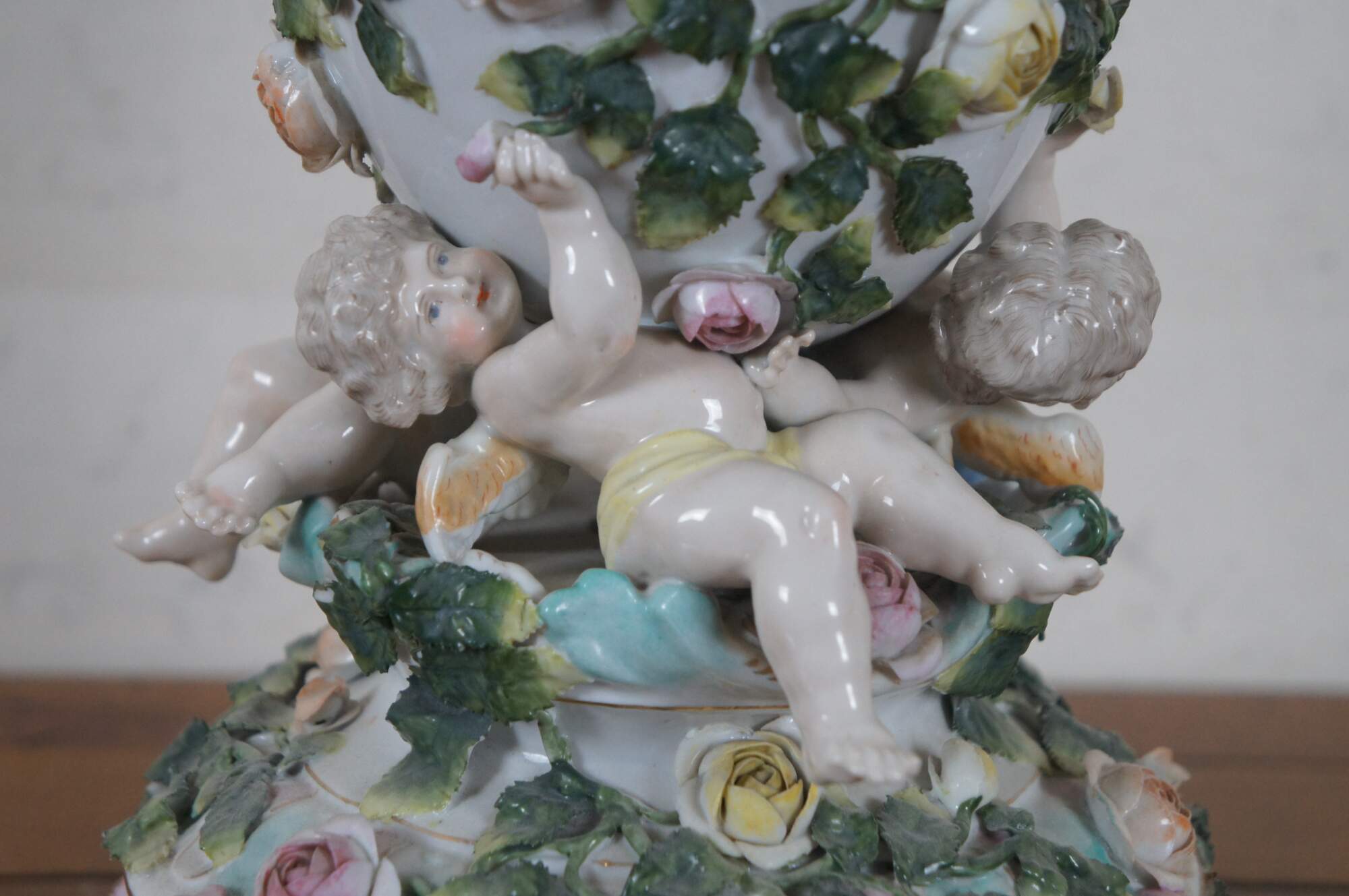 Antique German Sitzendorf Dresden converted oil lamp mantel trophy urn featuring a design of climbing roses and reclining cherubs. Marked on base with crossed lines, circa 1884 - 1902. Includes round white scalloped edge shade with braided trim.