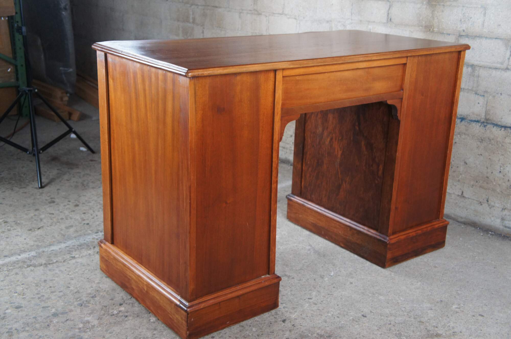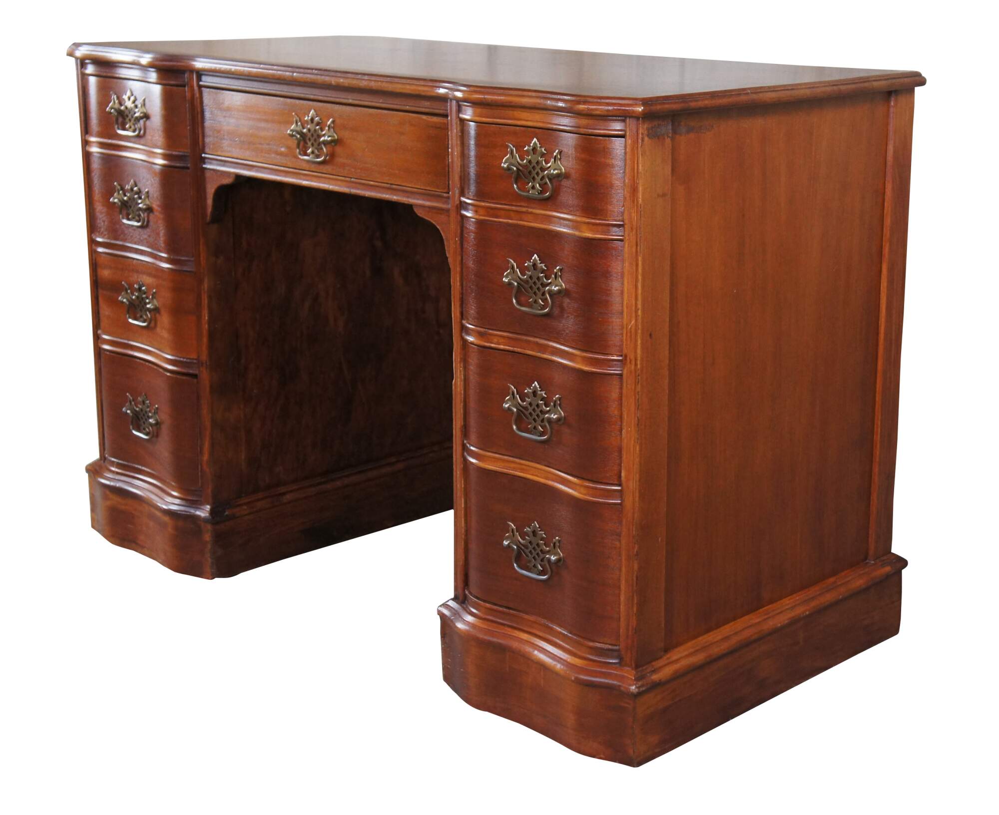 Antique Chippendale library writing desk. Made of mahogany featuring serpentine rectangular form with nine dovetailed drawers and pierced brass hardware.