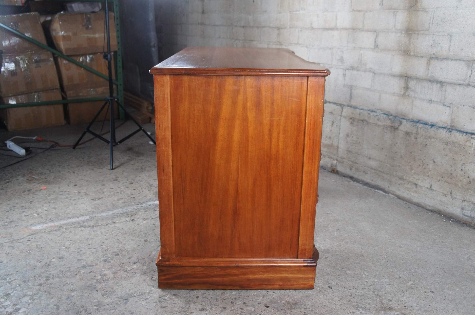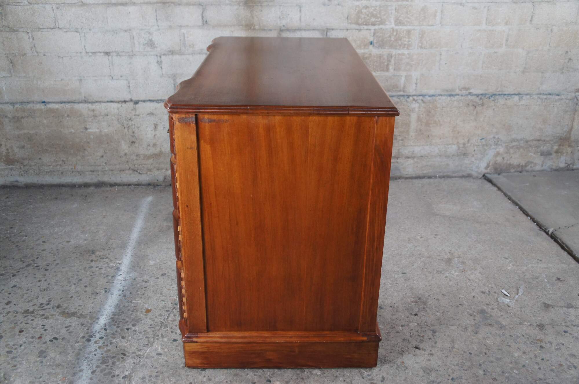 Good overall condition, wear and distressing commensurate with age and use, finish loss, marking, couple drawers reglued.