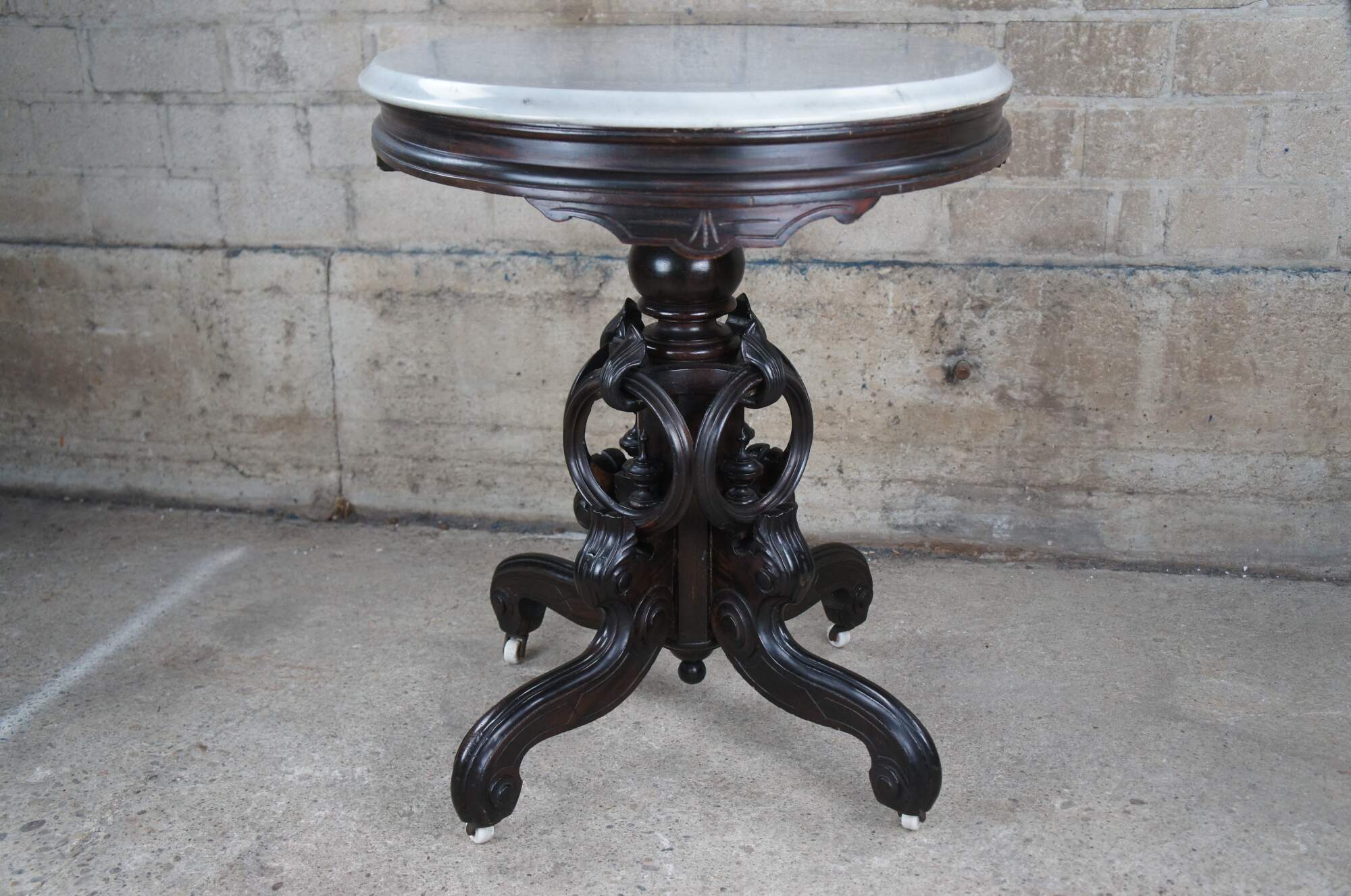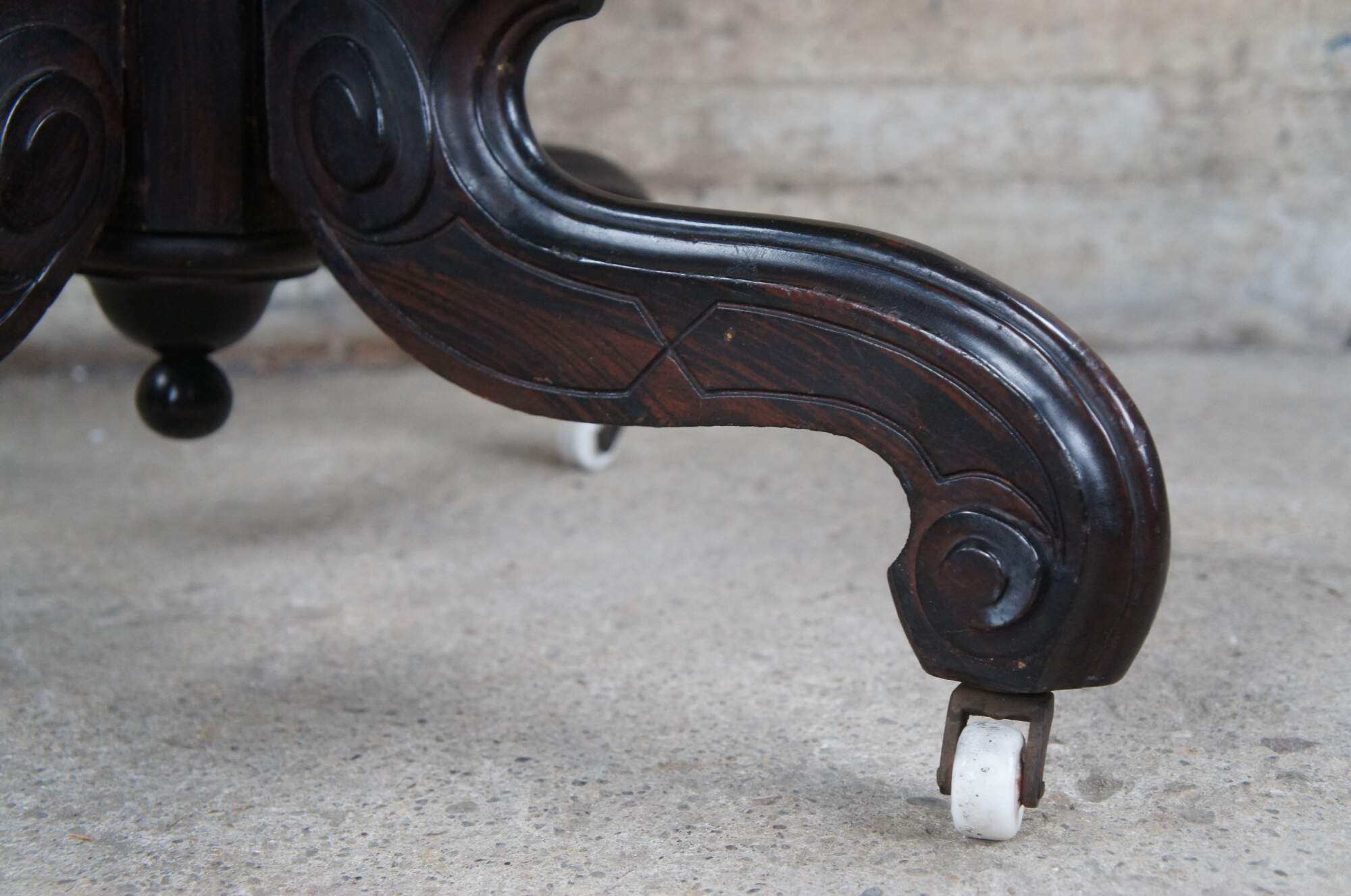 Antique Victorian Eastlake parlor table with Rosewood painted grain finish featuring an oval top with beveled edge over acanthus leaf accents, rings, finials, and serpentine legs.