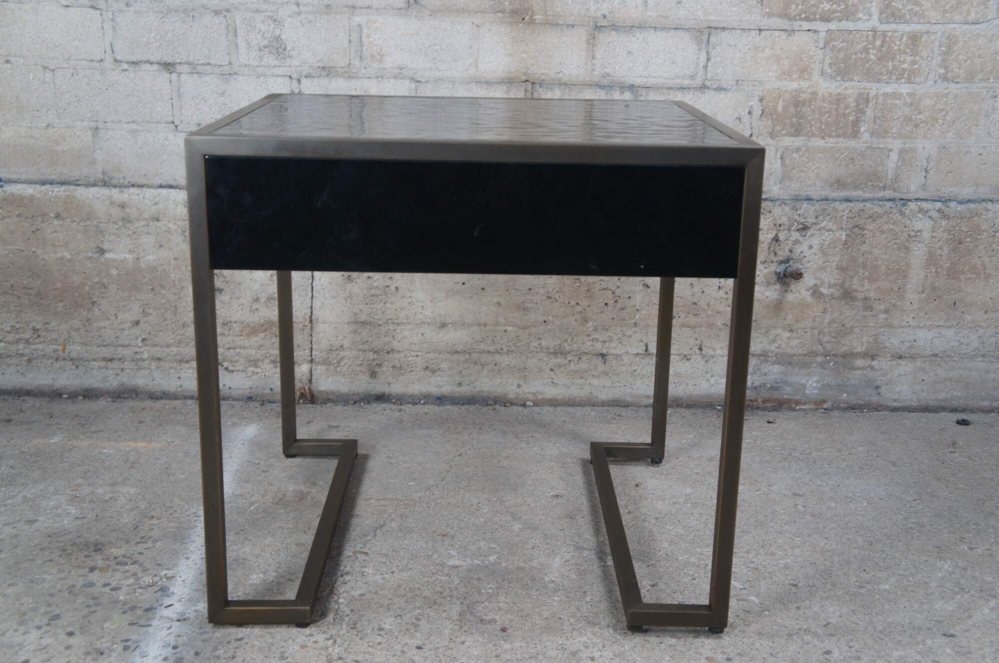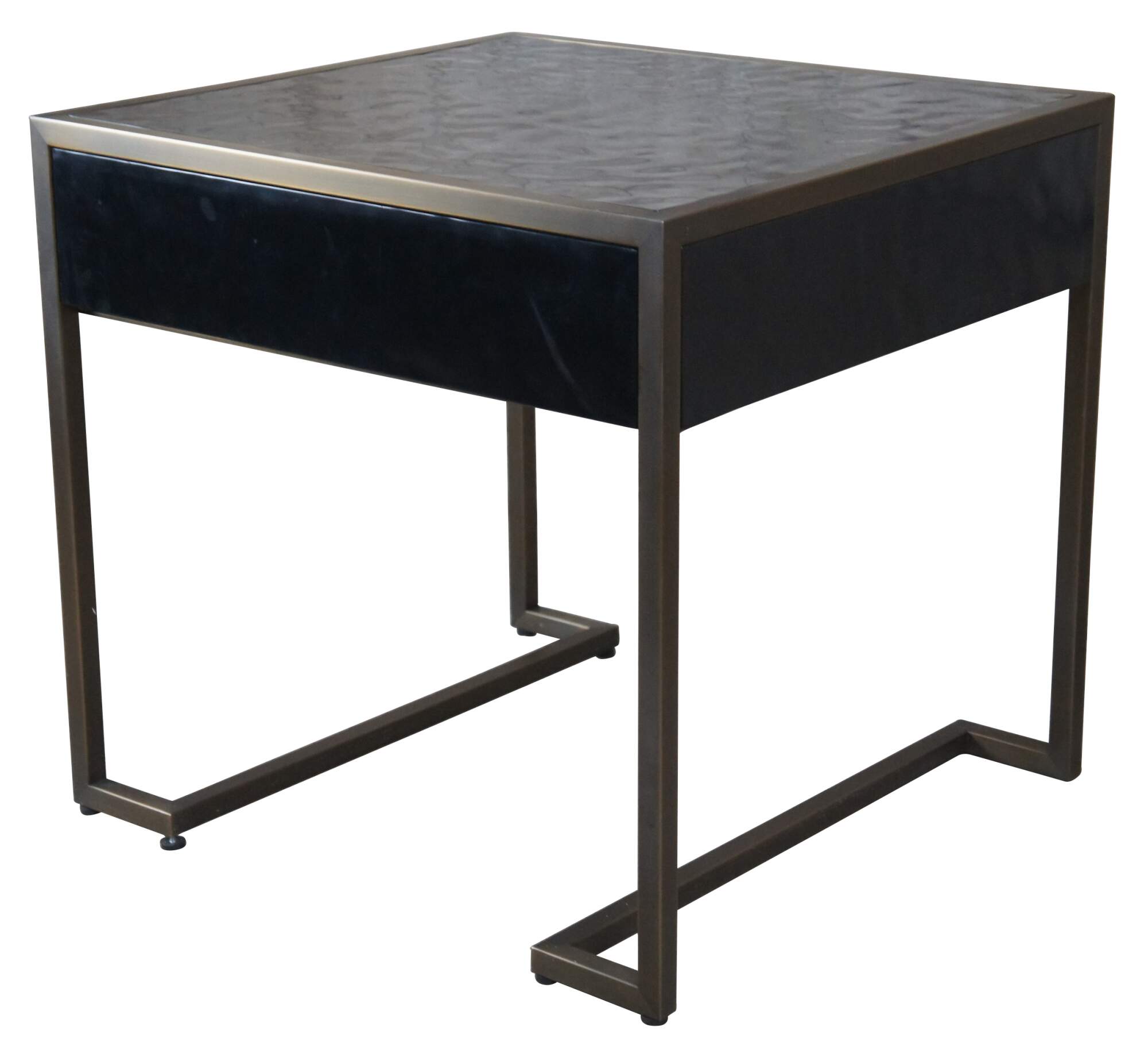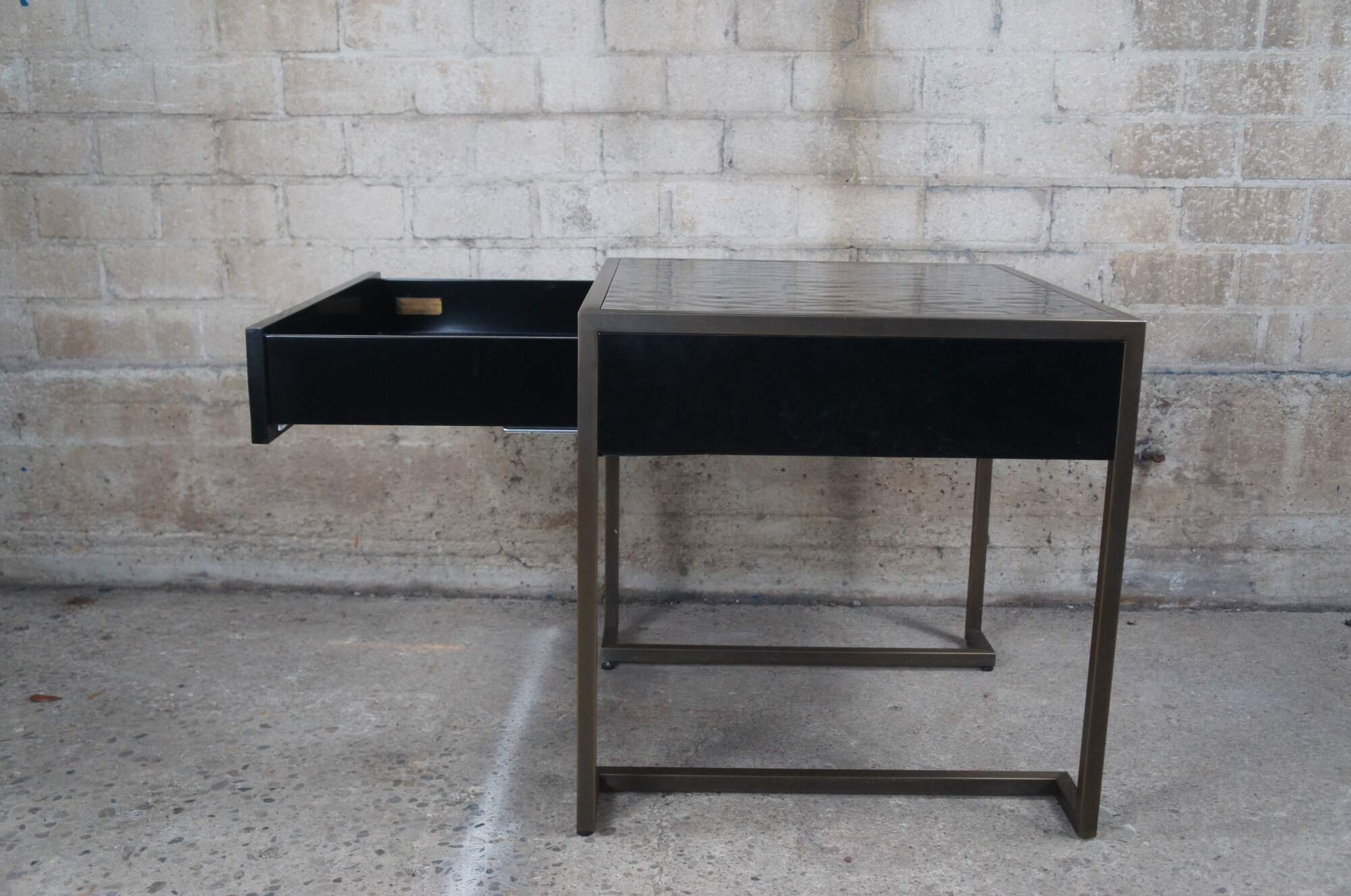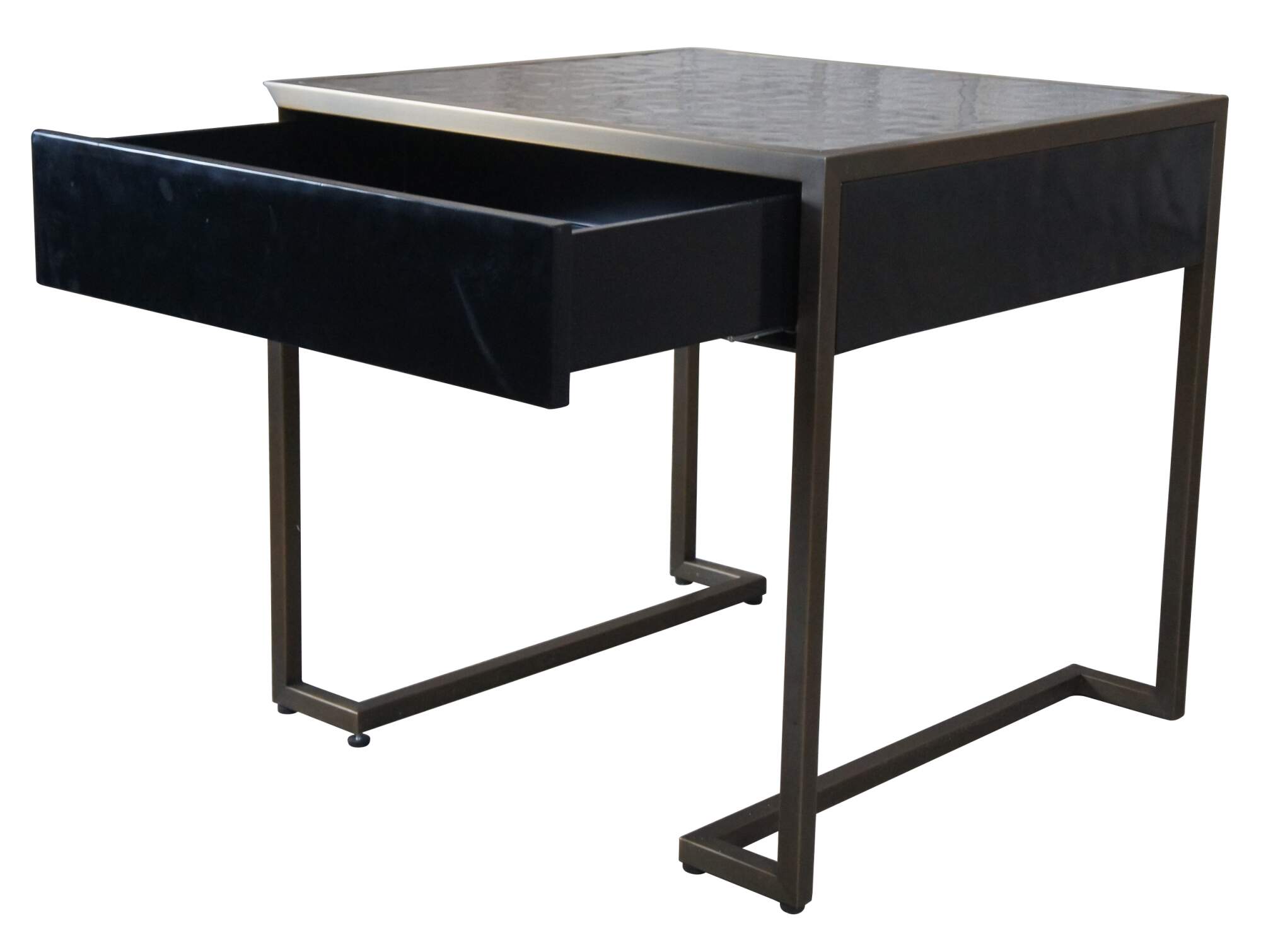 Vintage Baker Milling Road Kara Mann Collection ""Straight Up"" side table featuring black liquid lacquered finish and metal frame with one drawer. MR7060