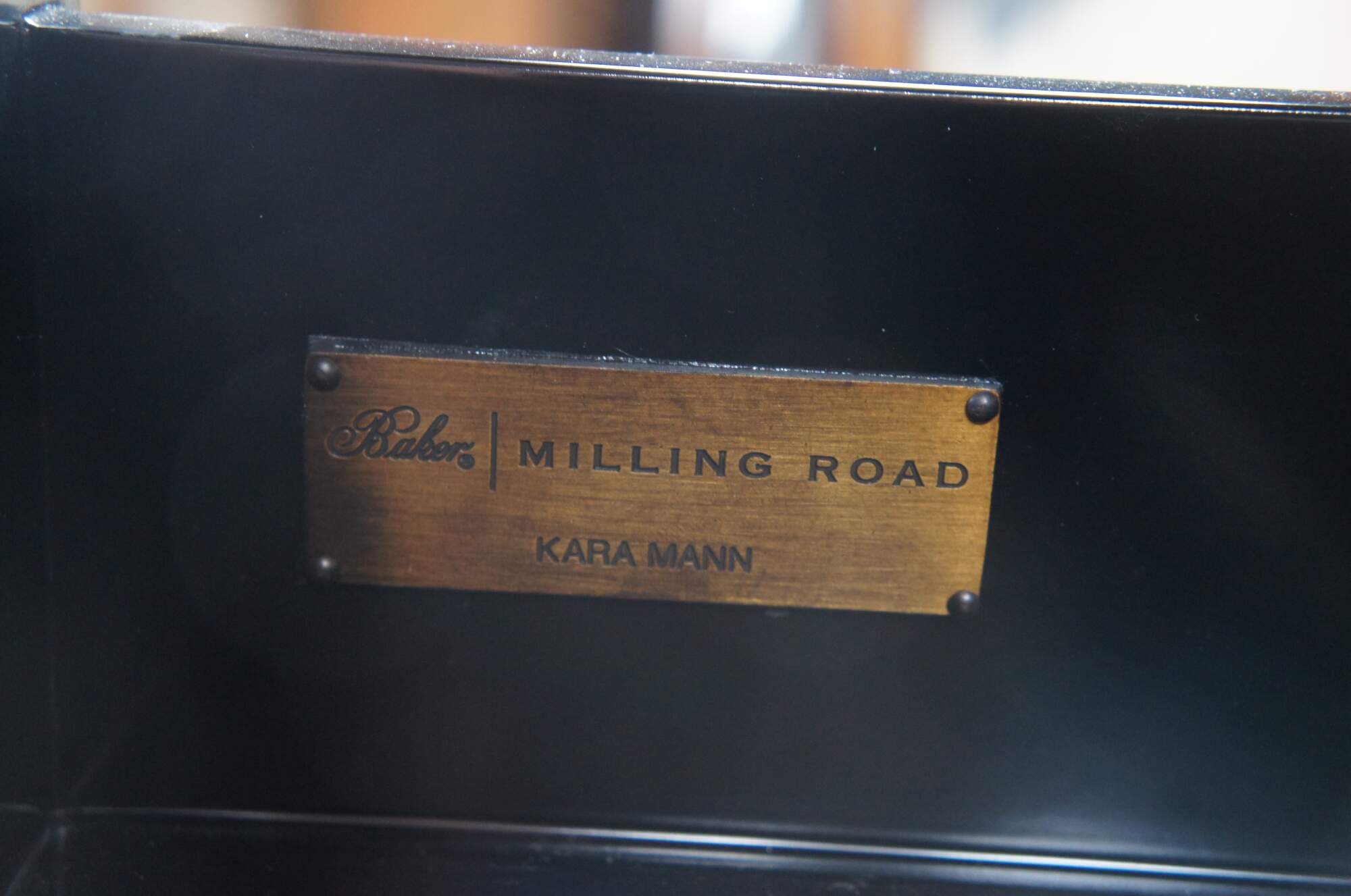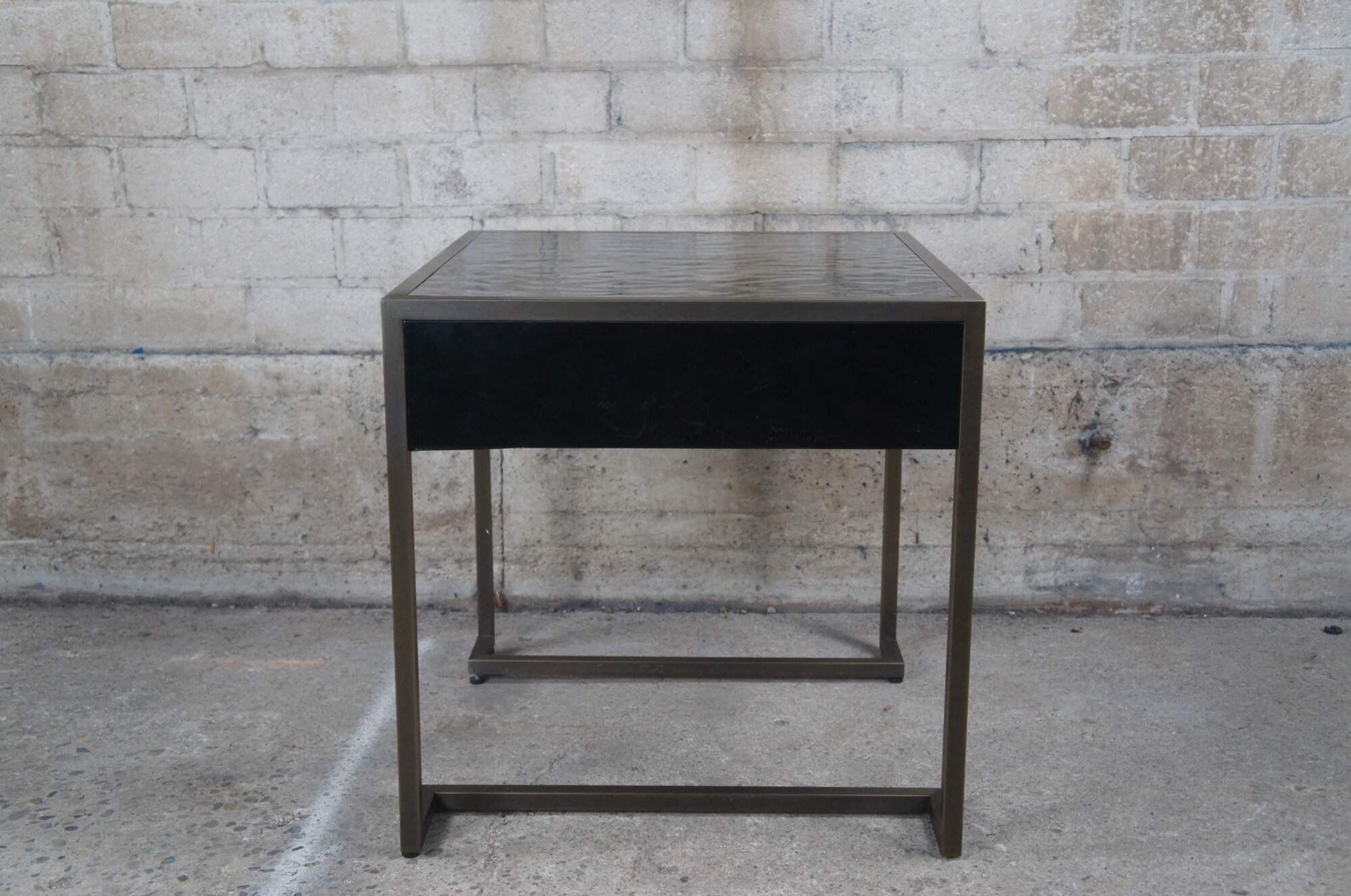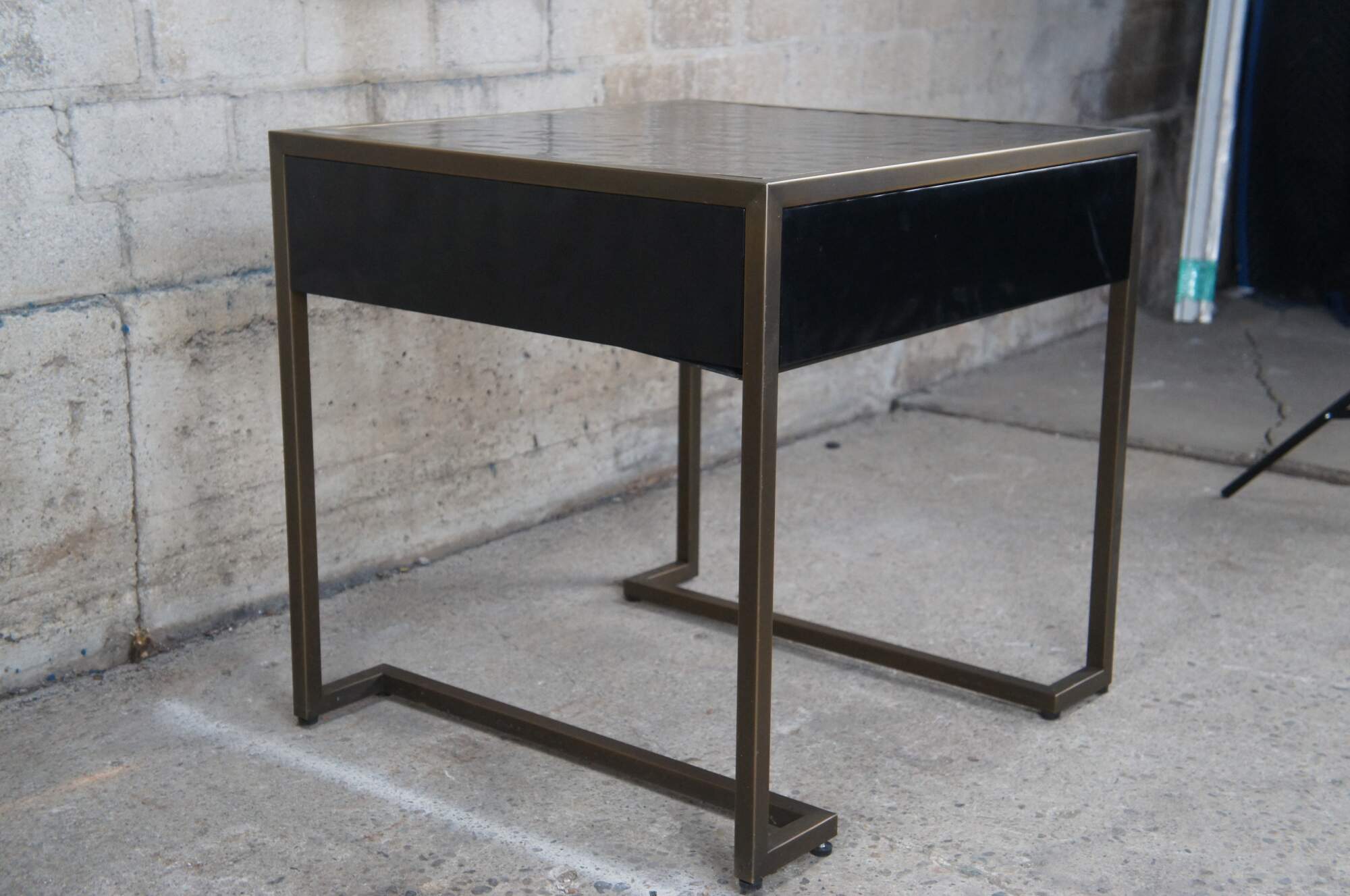 Vintage Baker Milling Road Kara Mann Collection ""Straight Up"" side table featuring black liquid lacquered finish and metal frame with one drawer. MR7060