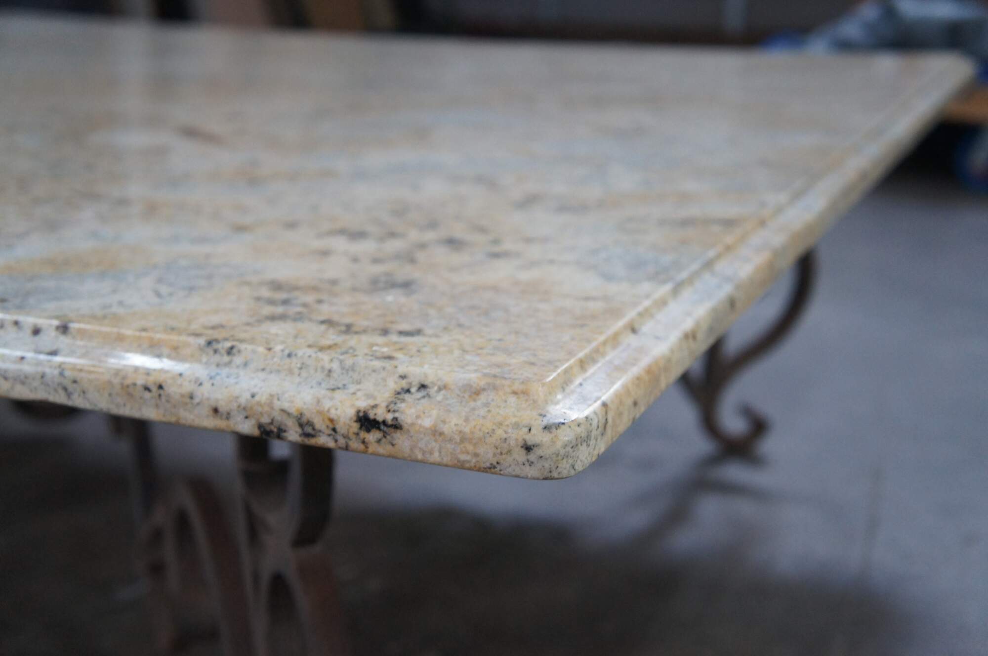 A large and impressive coffee table featuring square form with French scrolled / serpentine wrought iron base and heavy Granite stone top with beveled edge. Very heavy.