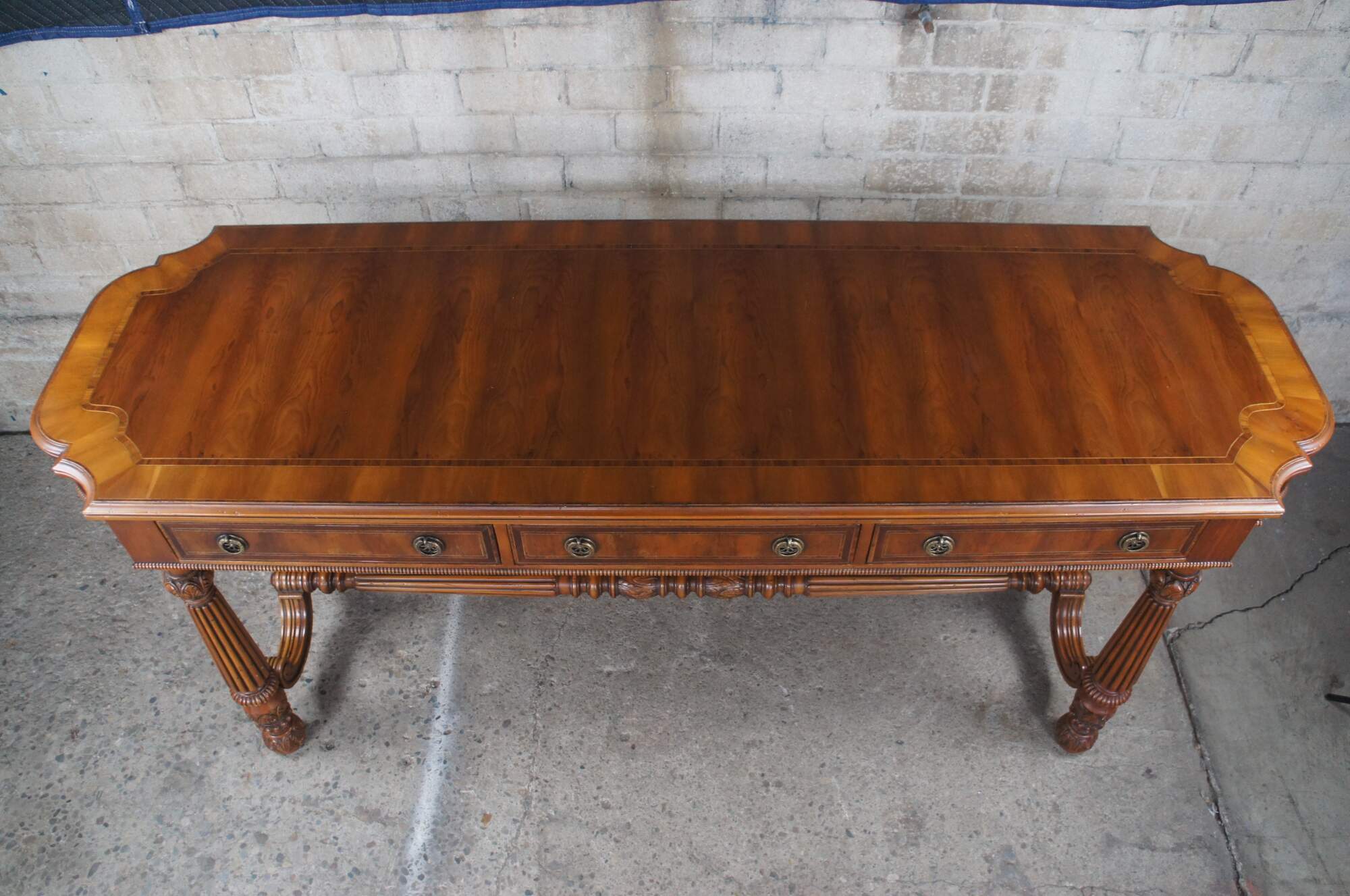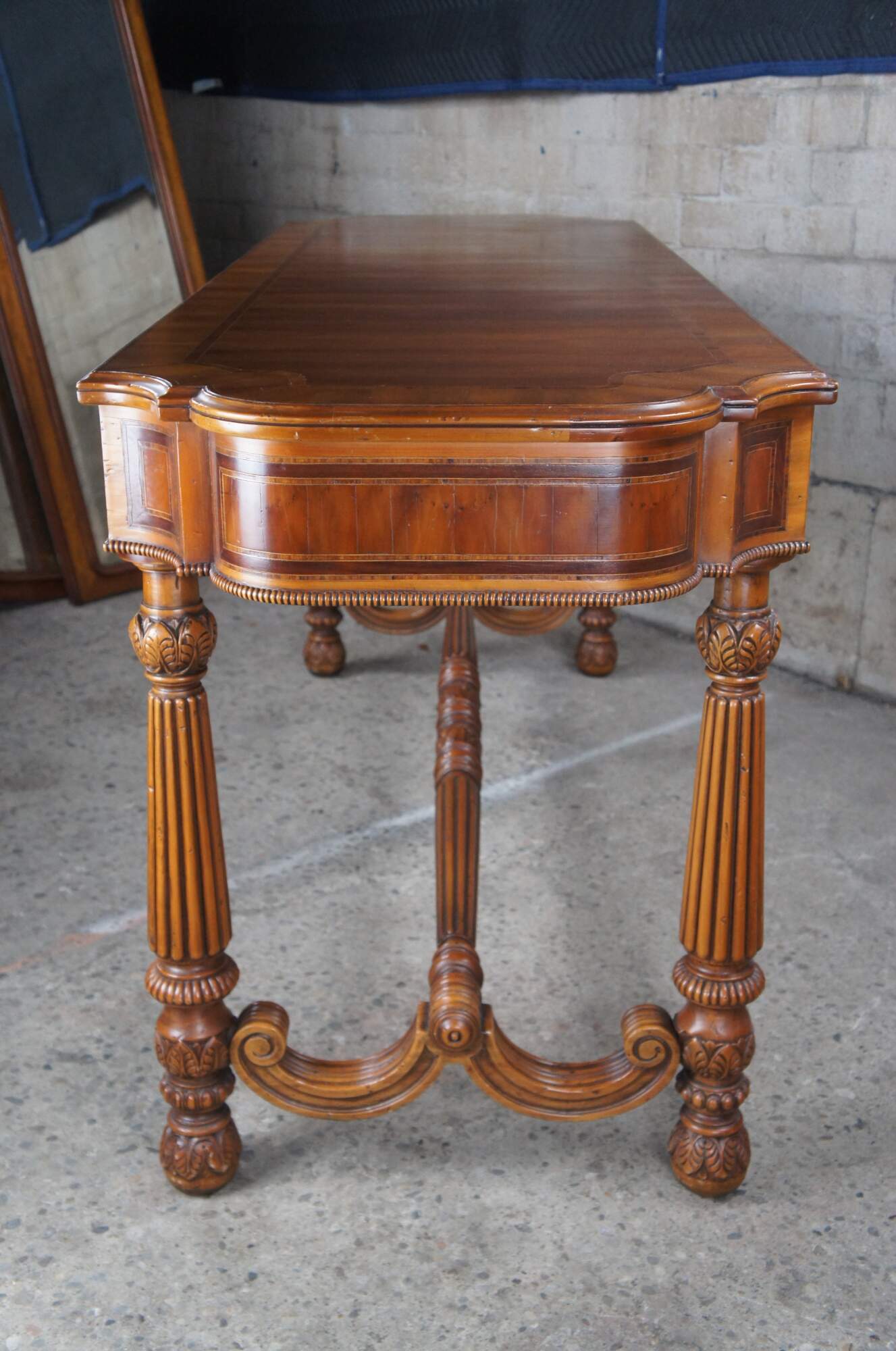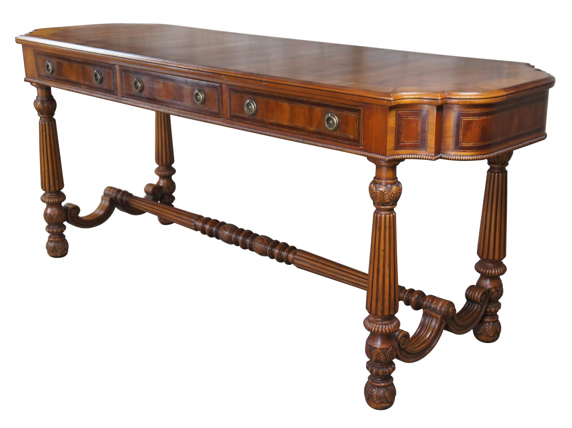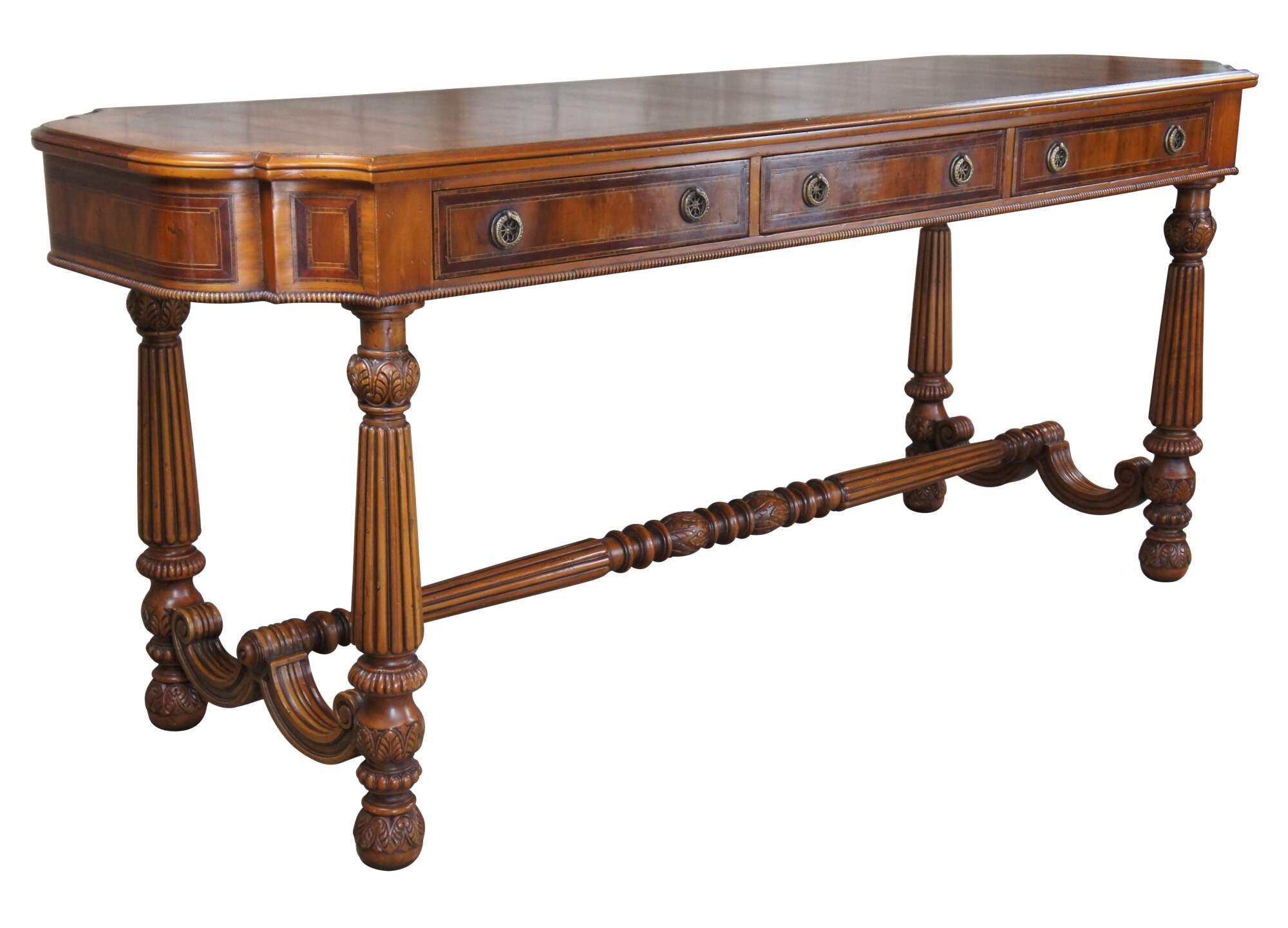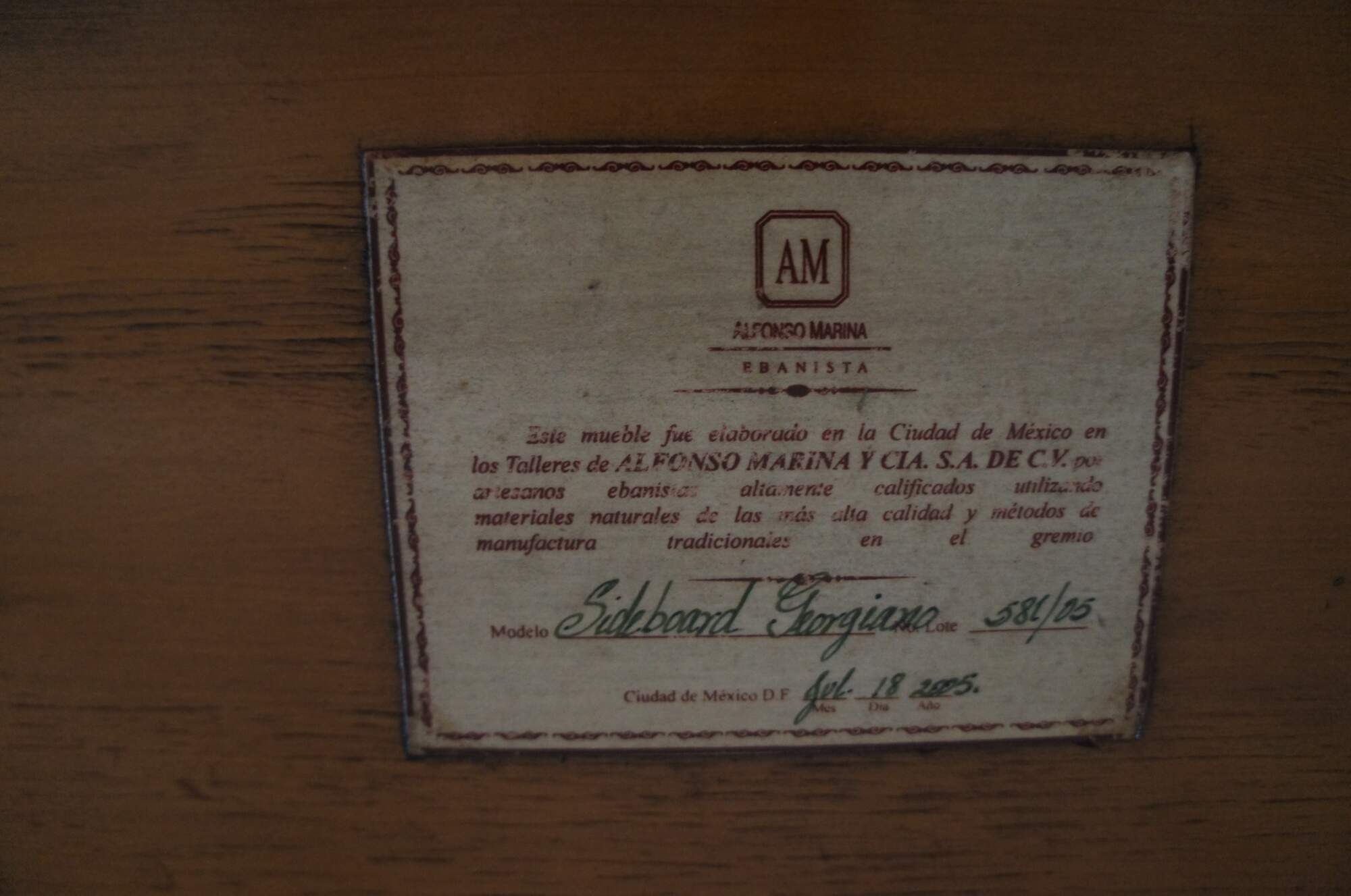 A distinctive oval-shaped, matched-booked top with delicate inlay and scalloped ends, three drawers with brass pulls, fluted legs ending in ball feet and a fluted and turned stretcher. The handcrafted finish on this piece, for which Alfonso Marina is renown, has the warm, distinctive patina of an antique sideboard.
