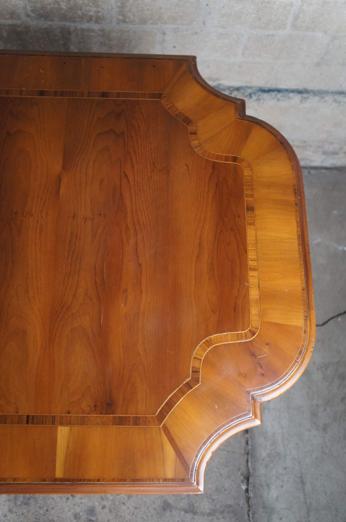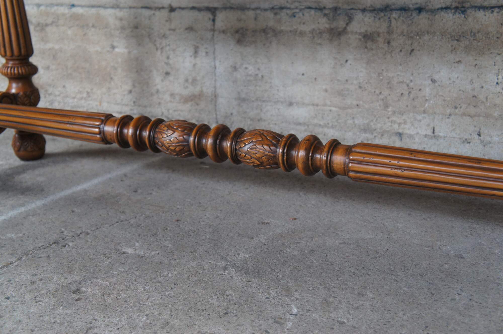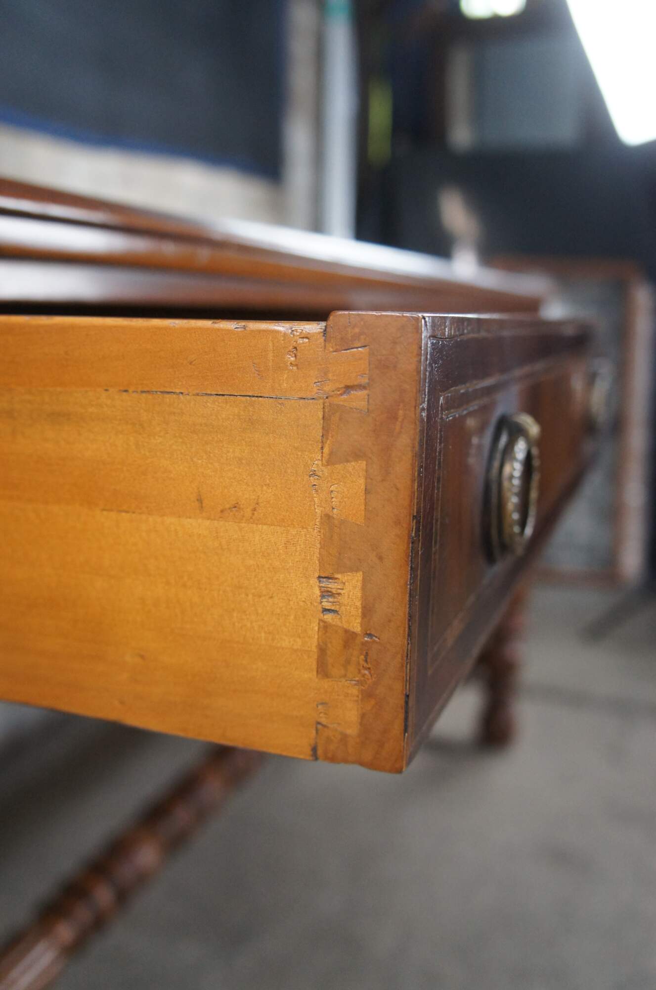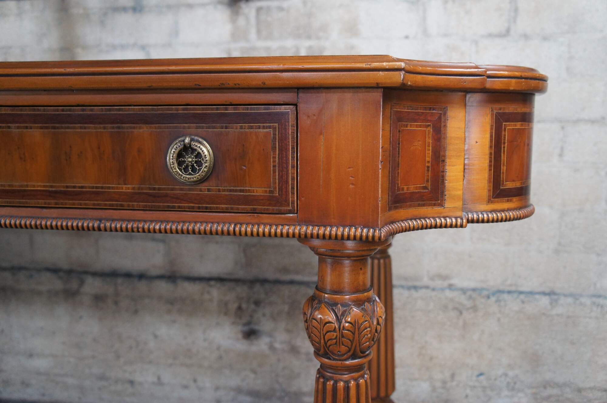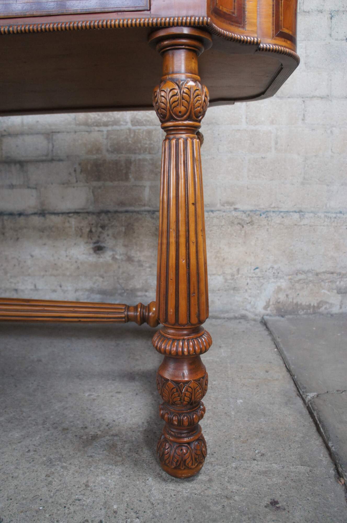 A distinctive oval-shaped, matched-booked top with delicate inlay and scalloped ends, three drawers with brass pulls, fluted legs ending in ball feet and a fluted and turned stretcher. The handcrafted finish on this piece, for which Alfonso Marina is renown, has the warm, distinctive patina of an antique sideboard.