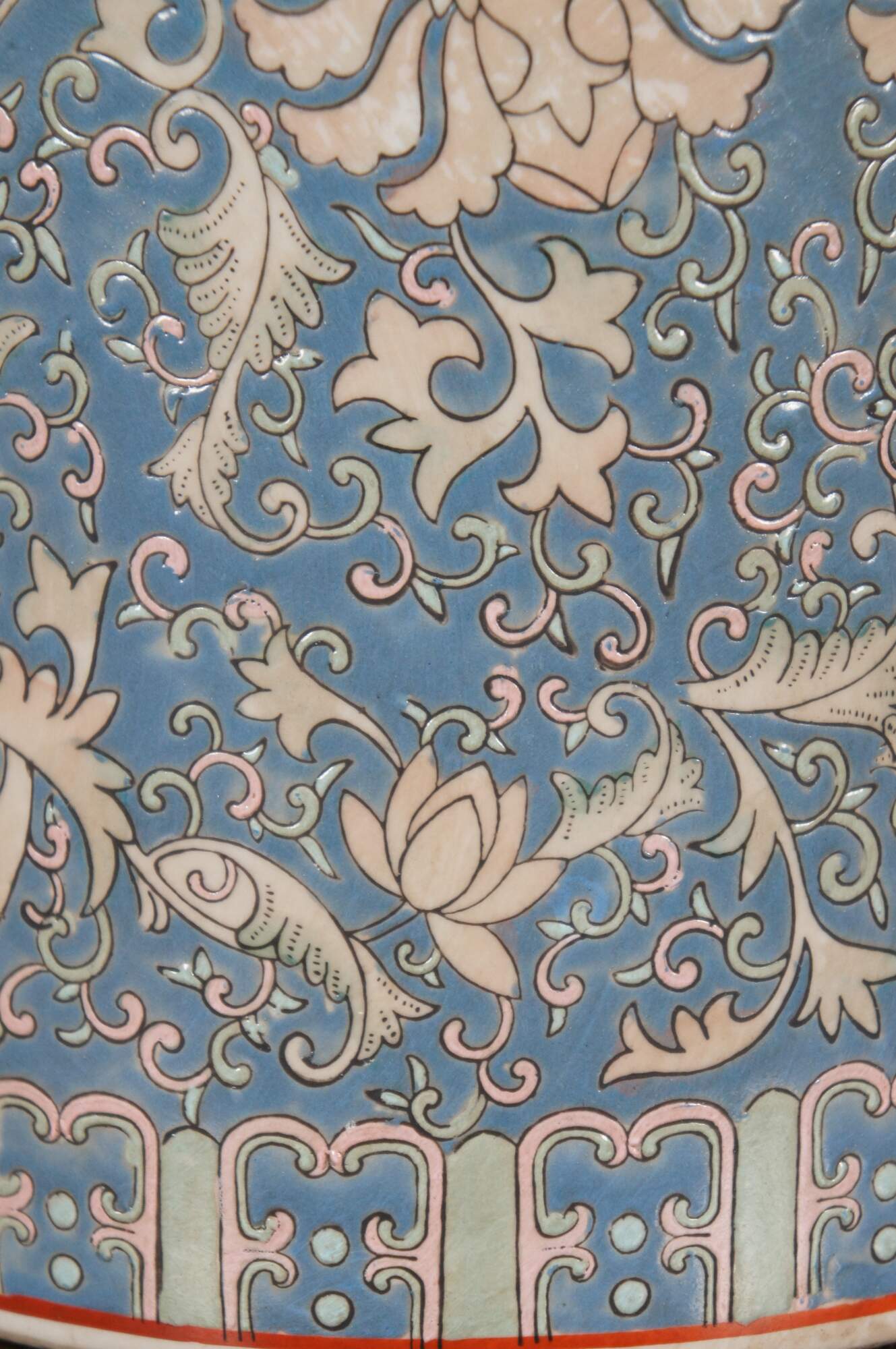 Vintage Chinoiserie famille rose porcelain ginger jar / vase / tea caddy table lamp by Frederick Copper, featuring a floral Chrysanthemum design in blue and pink with Greek Key pattern lid, dark wooden base, and round brass finial. Includes round, off white, pleated fabric shade.
