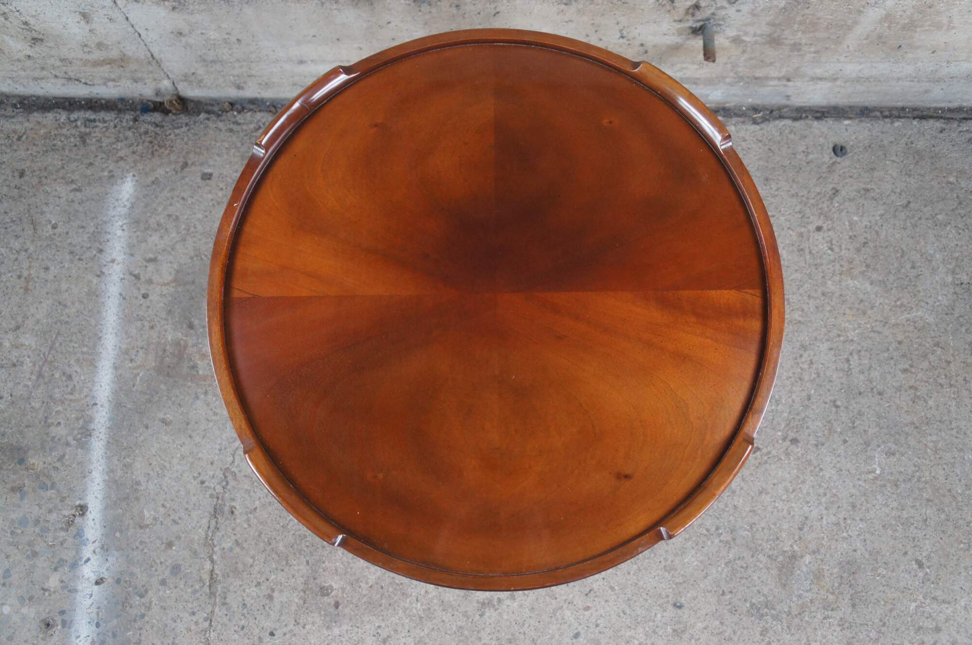 A gorgeous side or accent table by Baker Furniture, Circa last quarter 20th century. Drawing inspiration from English and Chinese Chippendale styling. Made from mahogany with a matchbook banded instet top. The frieze features one dovetailed drawer with traditional brass bale hardware. The table is supported by four square legs with inset fretwork and spandrels over marlborough feet. The legs are chamfered along the back side and connected via an X stretcher. Marked Baker via metal tag within the drawer. Includes a polished glass top for protection