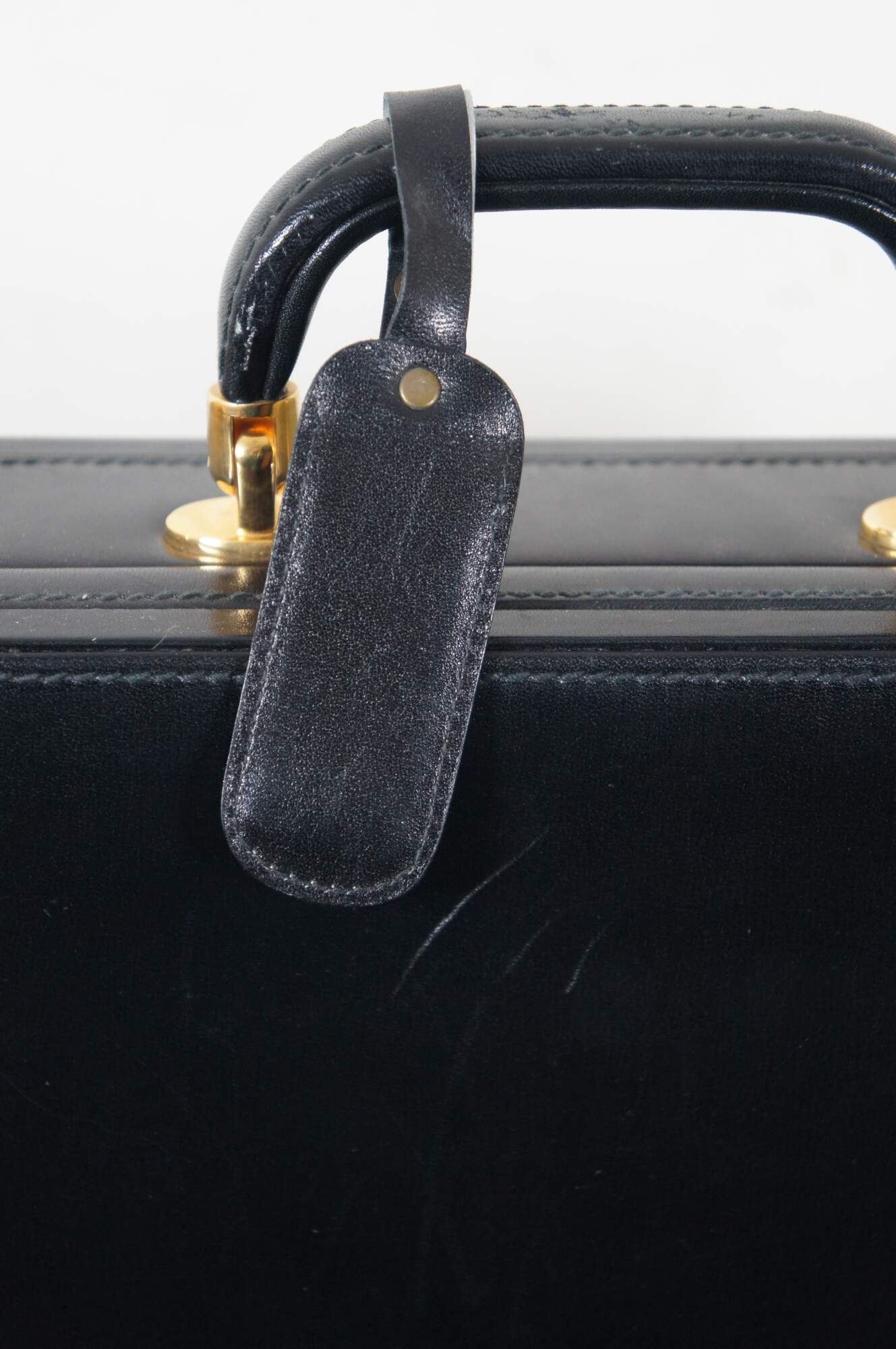 Vintage Bally black leather briefcase. Features single handle, brass feet, capped corners, and double latches with combination locks (currently set at default 000). Interior features beige suede lining, small slip pocket with removable ID card holder, attached wallet with slots for six cards and snap closure, two medium slip pockets, and two document compartments with latching strap. Includes luggage tag. Made in Italy. Original Price $700 circa 1983.