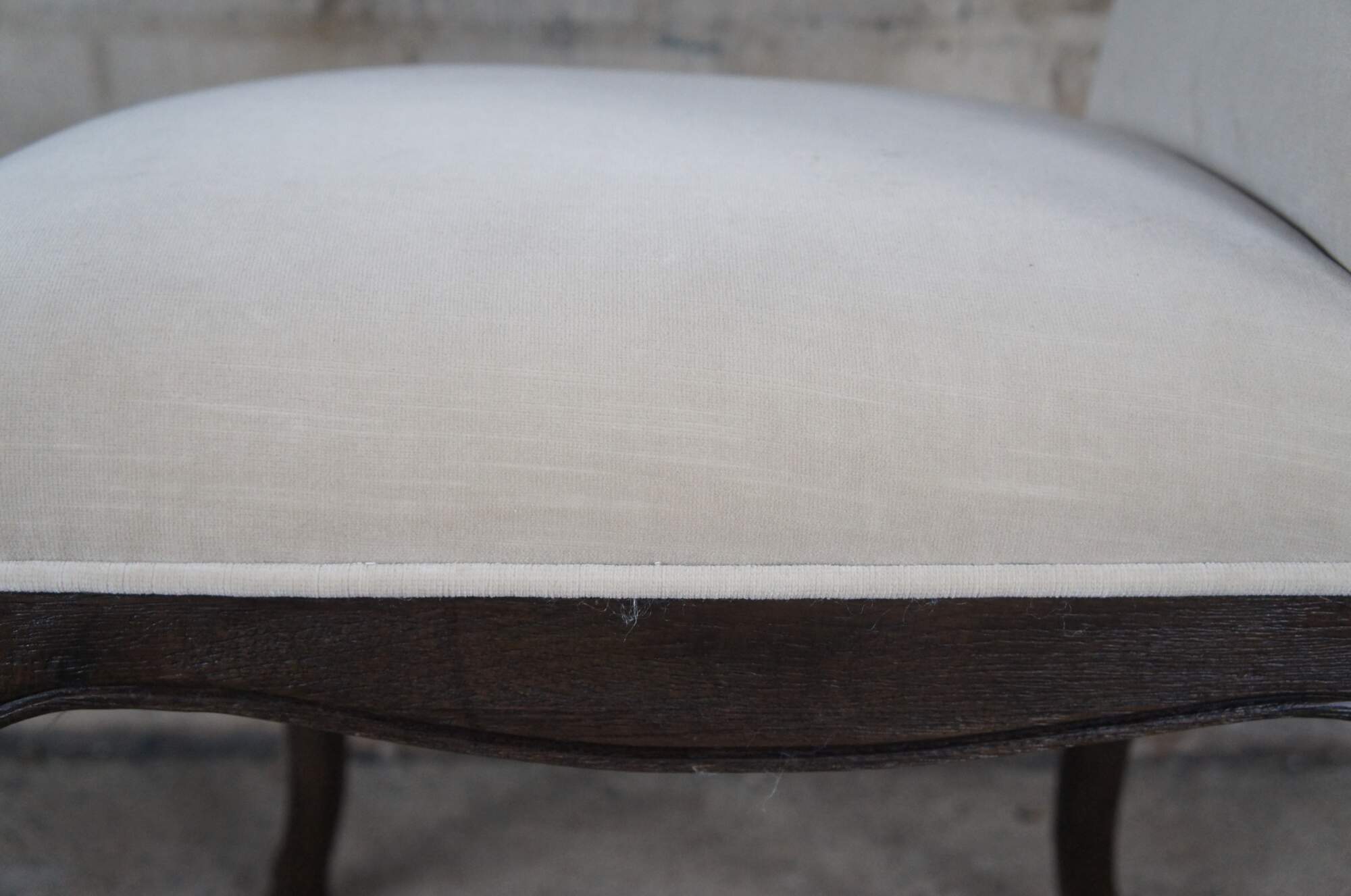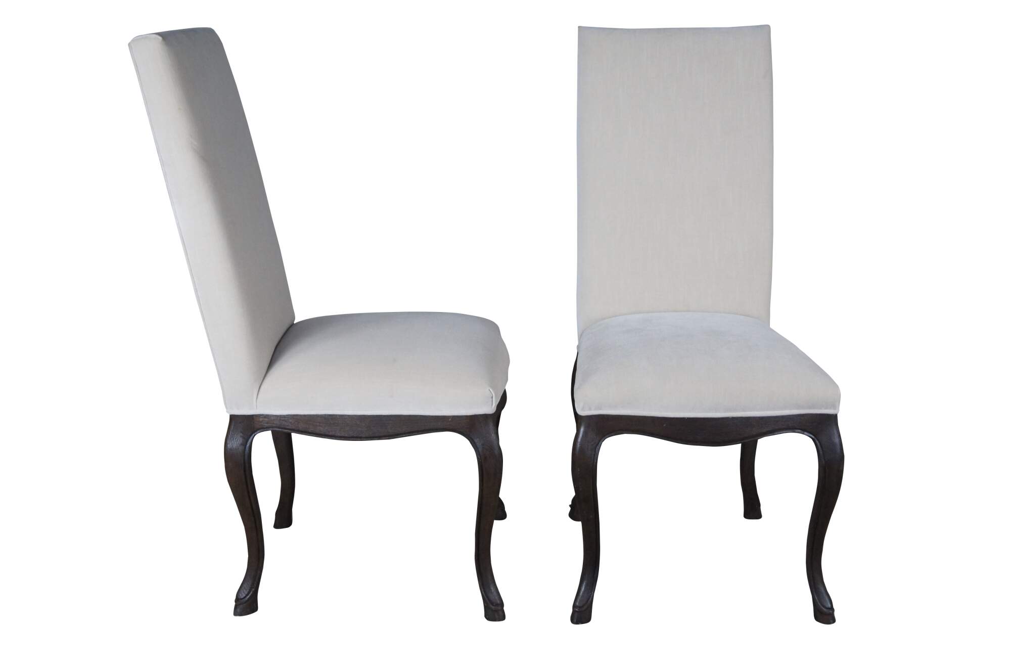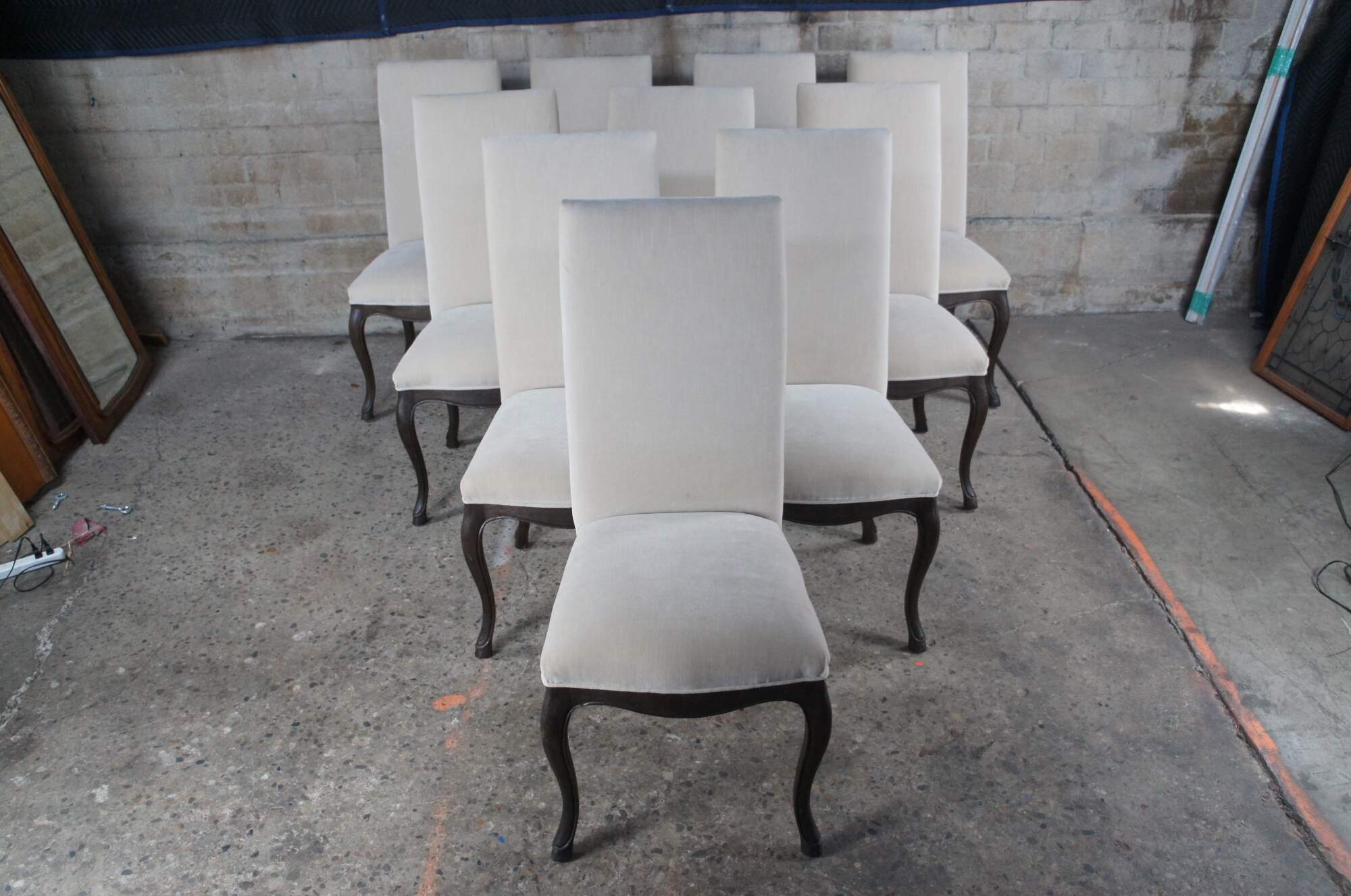 Ten Restoration Hardware French Louis XVI style dining chairs. Features a square back with velour / velvet upholstery and serpentine cabriole legs with hoof foot.