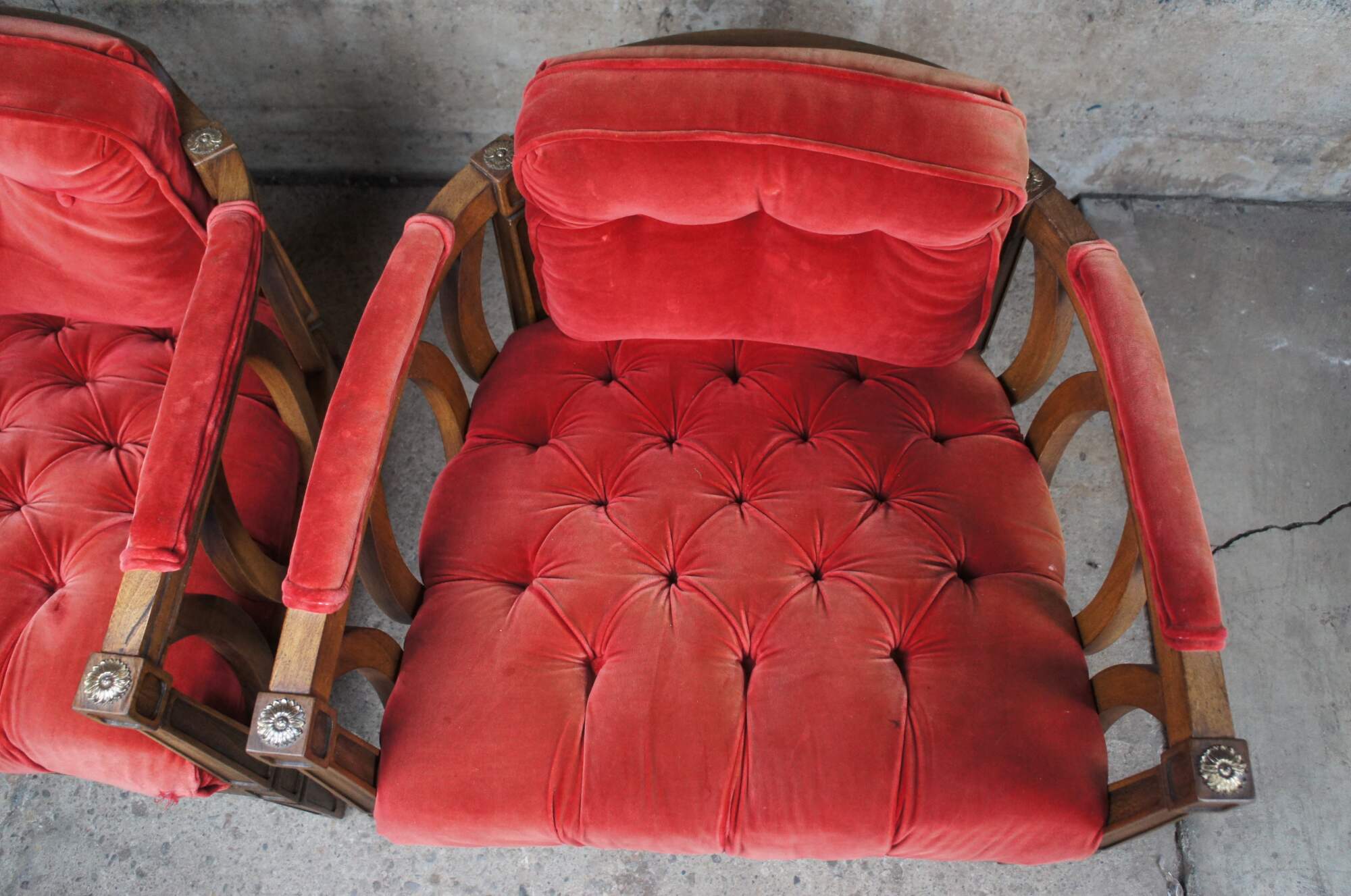 A pair of Mid Century barrel back armchairs featuring a horse shoe shape with red velvet or velour tufted upholstery with high padded arms, and inset walnut panels with tapered legs.