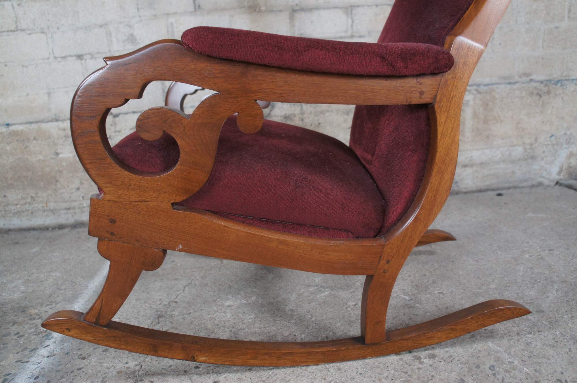 Antique Victorian Aesthetic movement rocking armchair. Made of walnut featuring serpentine form with velvet / velour upholstery, padded arms, and tall back carved with berry and leaf design.