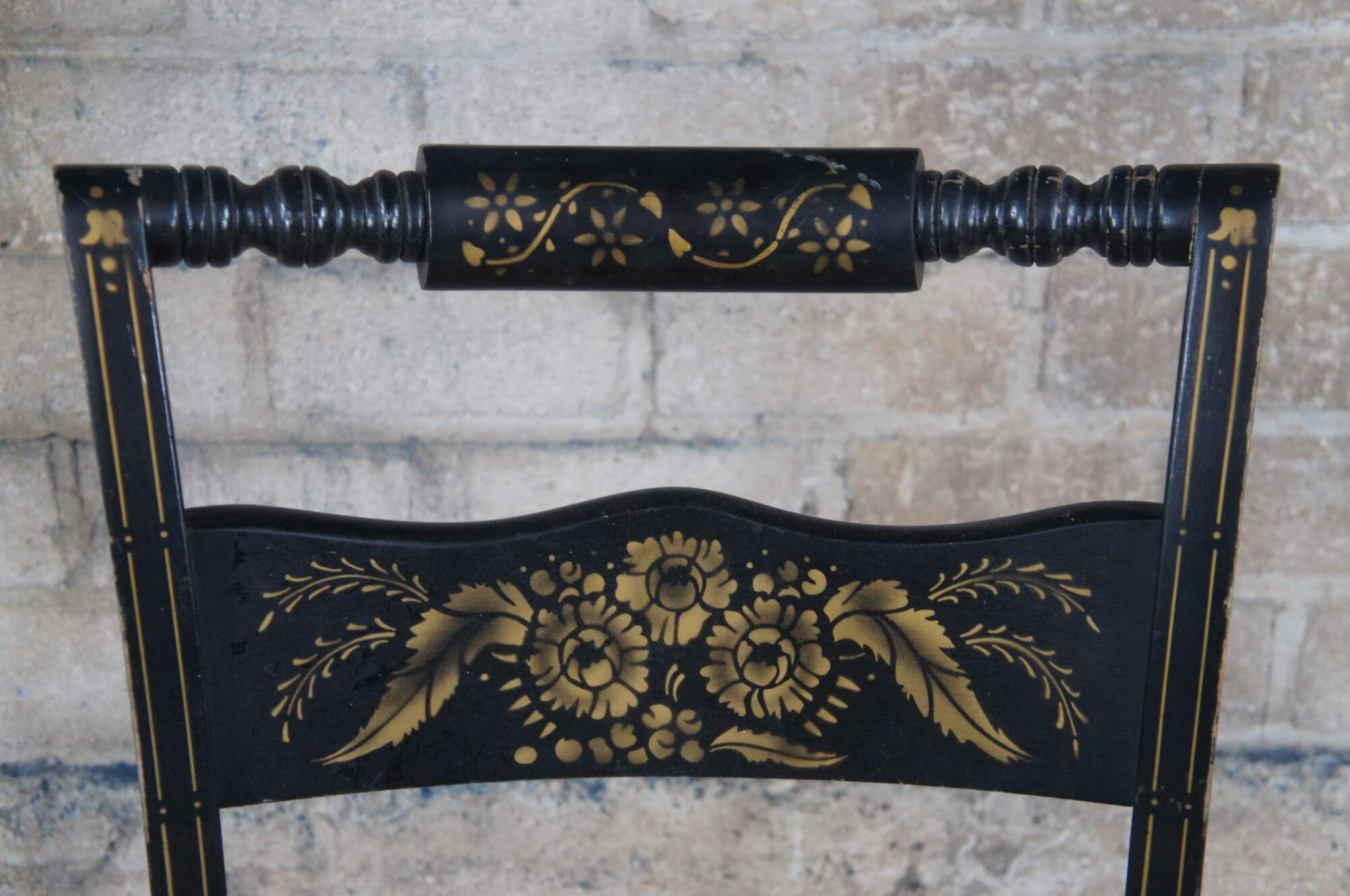 A turn of the 20th century Hitchcock stenciled farmhouse chair. Features a floral berry and leaf / foliate design, ribbed accents and rush seat.