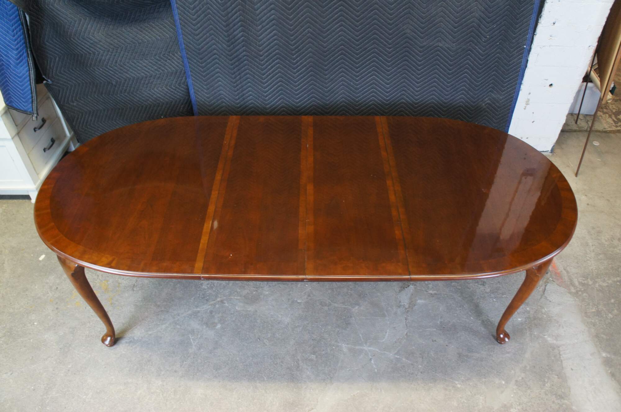 A lovely dining table by Cresent Manufacturing Company, circa 1970s. Features an oval queen anne form made from cherry with banded edge around the top. Includes two leaves for extension up to 93"