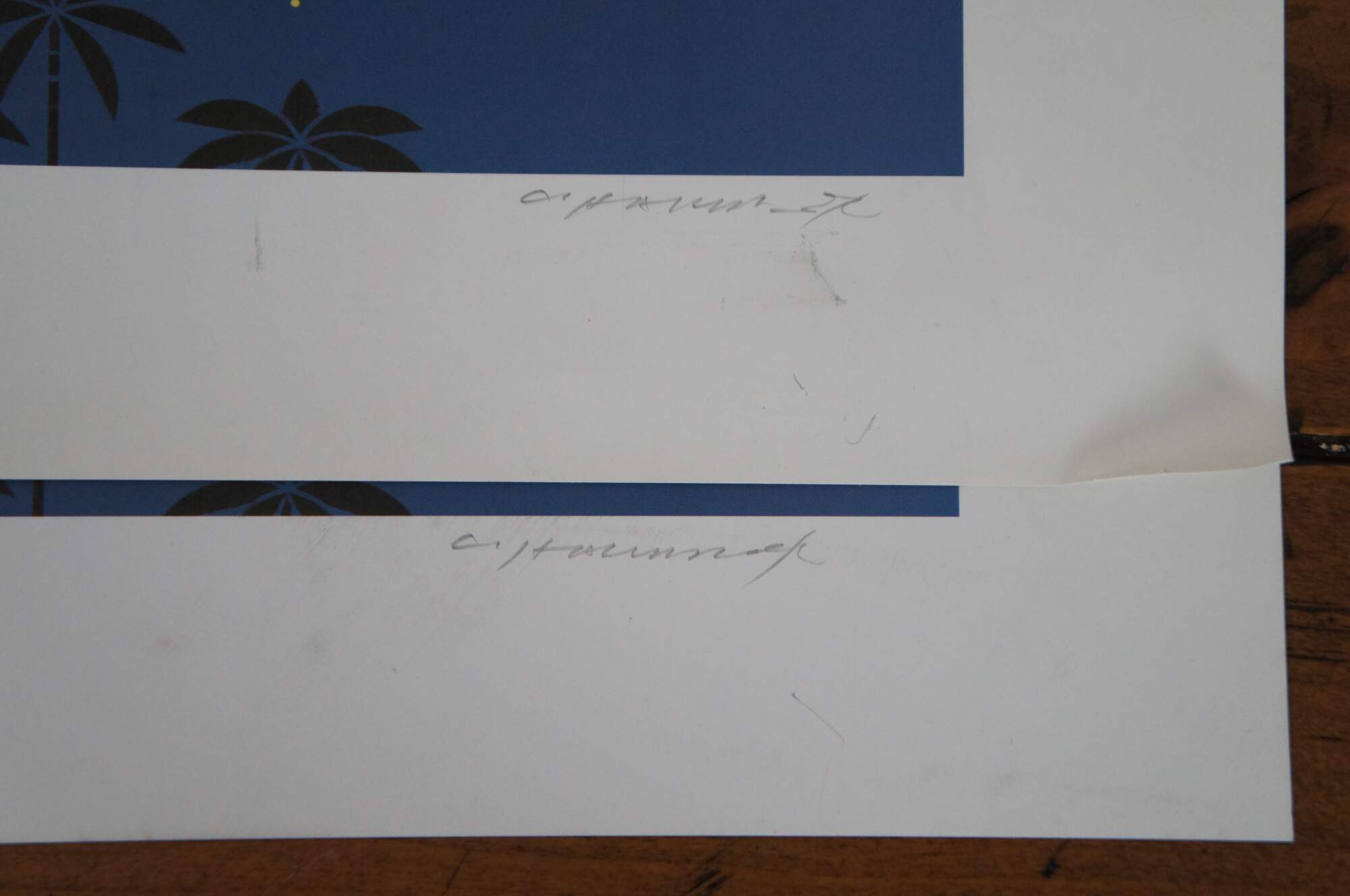 Vintage 1990 print of Mystery of the Missing Migrants by Charley Harper, showing a flock of a variety of migratory birds flying through a blue starry sky. Lithograph on paper. Pencil titled and signed.