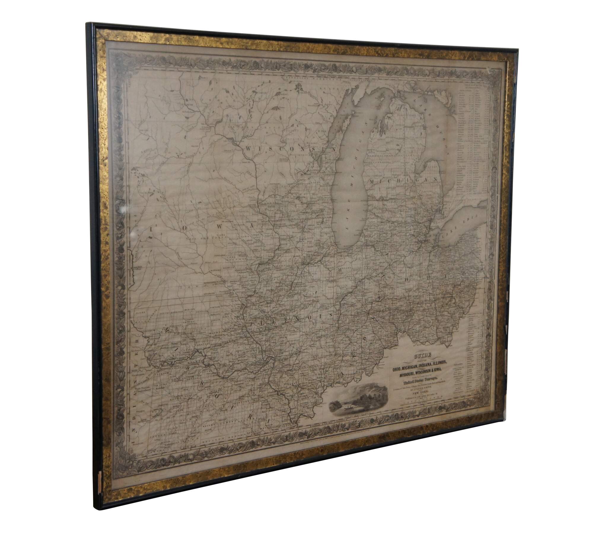 Antique framed black and white map of seven Midwestern American states. Guide Through Ohio, Michigan, Indiana, Illinois, Missouri, Wisconsin, & Iowa. Showing the Township Lines of the United States Surveys, Location of Cities, Towns, Villages, Post Hamlets, Canals, Rail and Stage Roads.