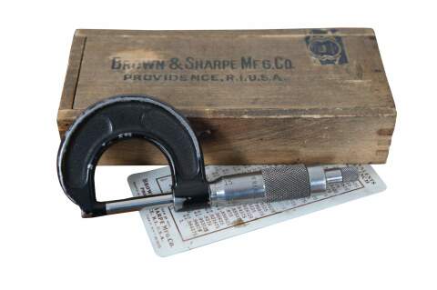 Early to mid 20th century Brown and Sharpe Manufacturing Company No. 11RS Micrometer / Caliper. Measures 0” to 1.” Includes original wooden box and plasticized insert listing Decimal Equivalents of Parts of an Inch.