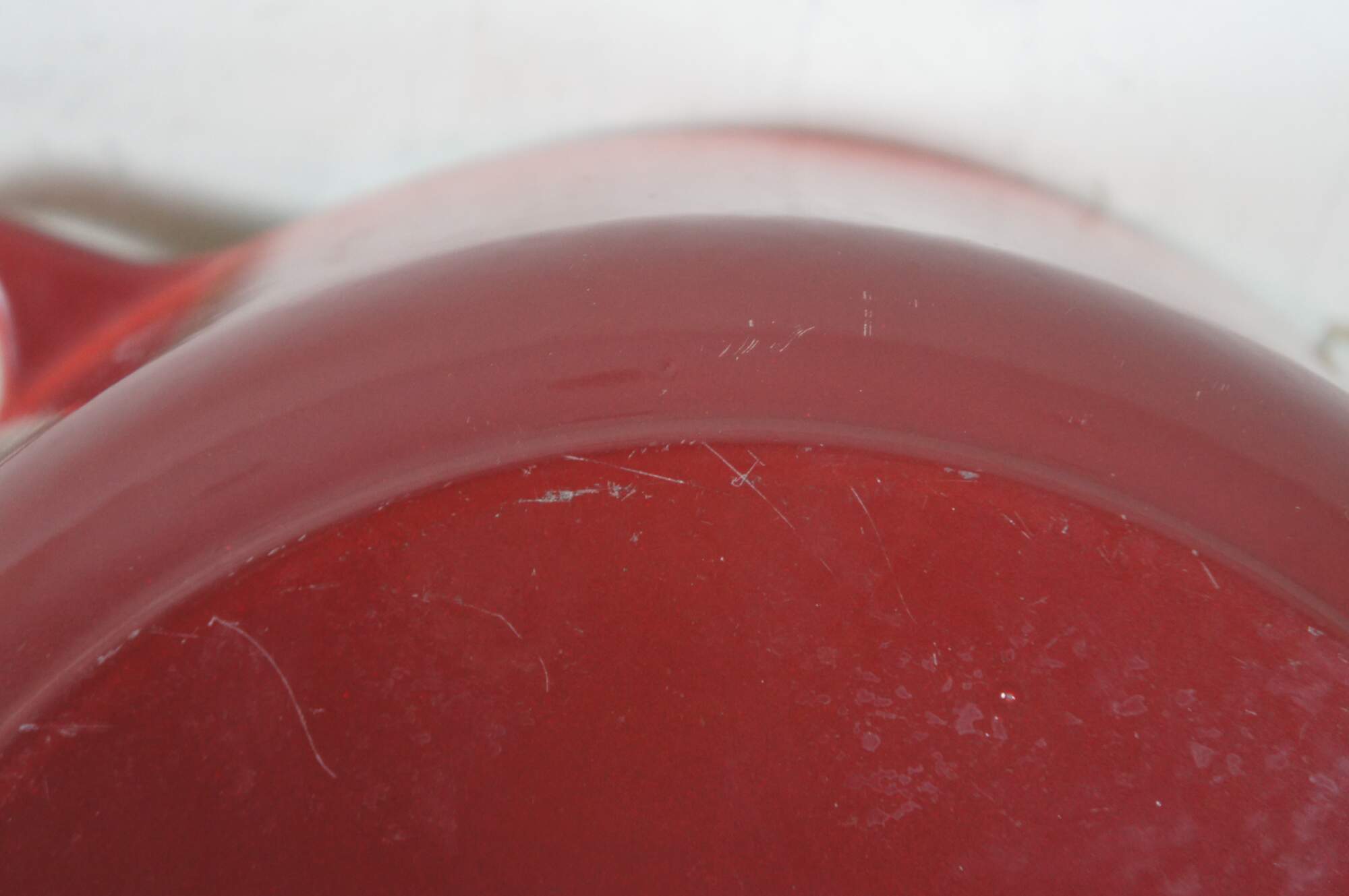 Le Creuset France No. 26, double handled round dutch oven with lid. Made of cast iron and enameled in cerise red ombre with black lid handle. 5.5 quart capacity.