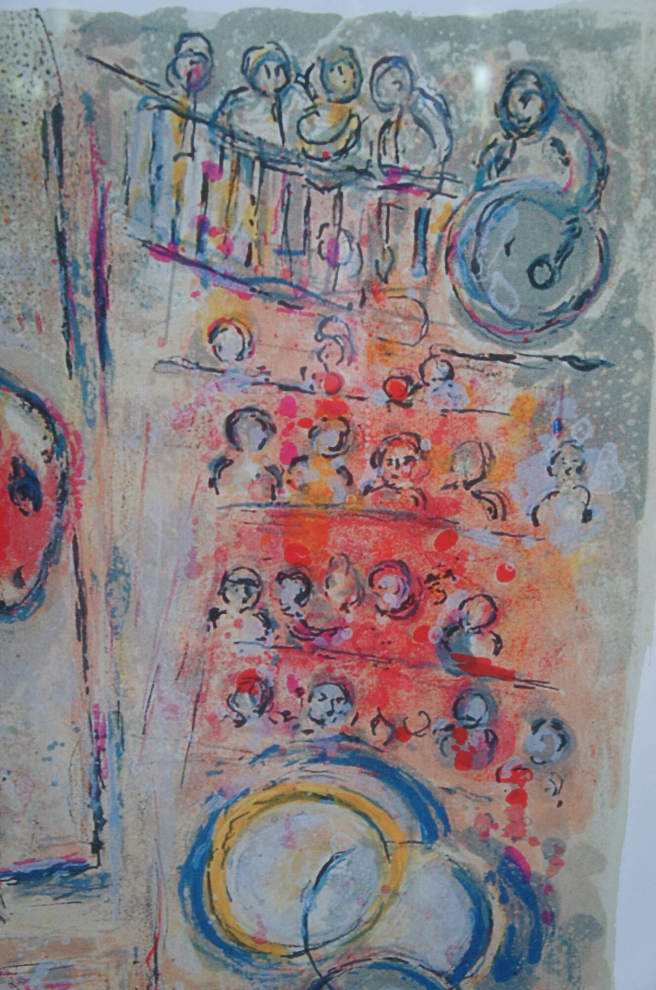 Vintage large and impressive Marc Chagall impressionist/expressionist lithogaph on paper featuring a circus scene with a man, woman / angel and horse levitating above the crowd with a pair of juggling clowns. Beautifully framed in a coin dot / graduated silver bead. Edition 50 of 375.