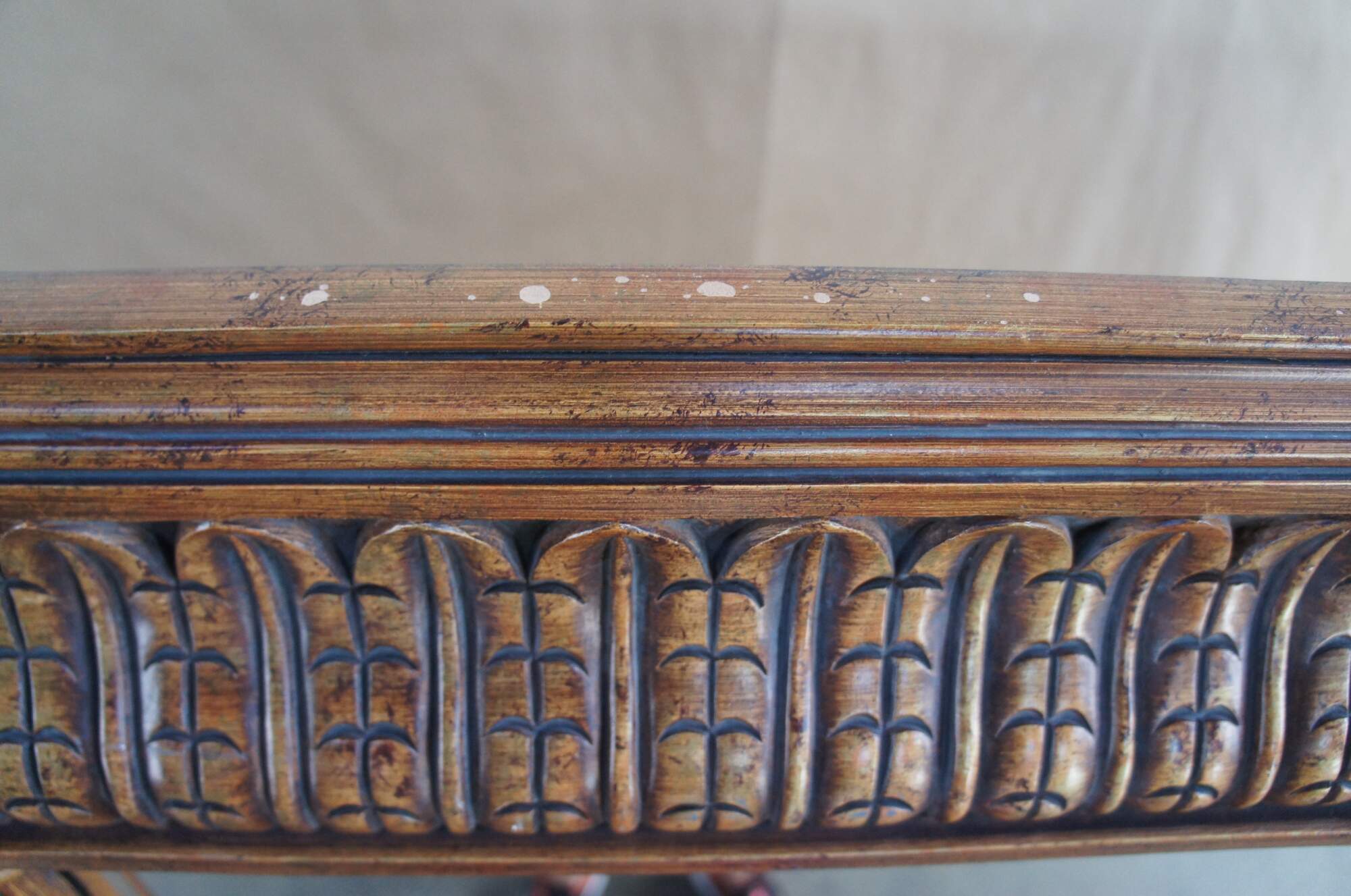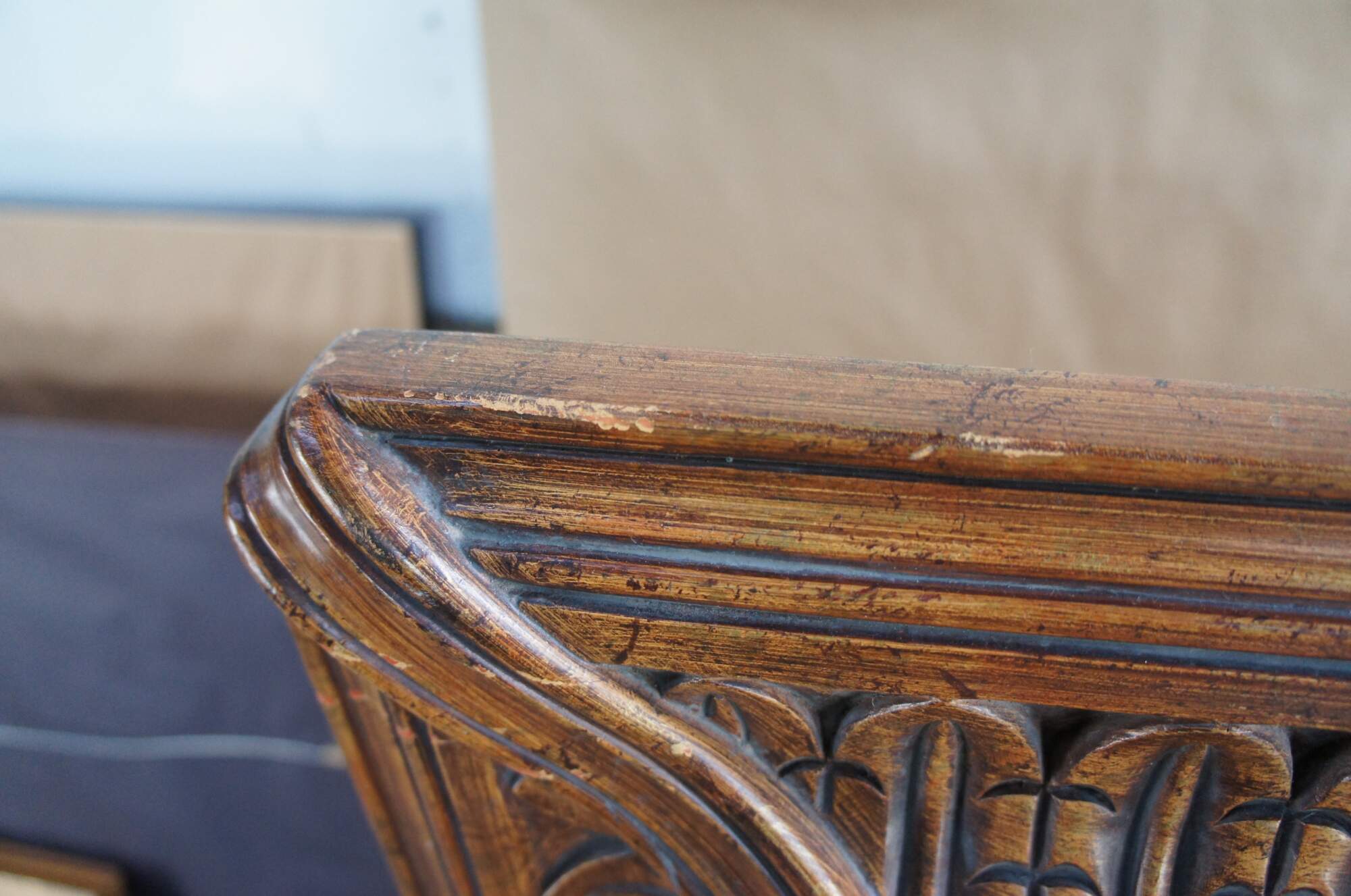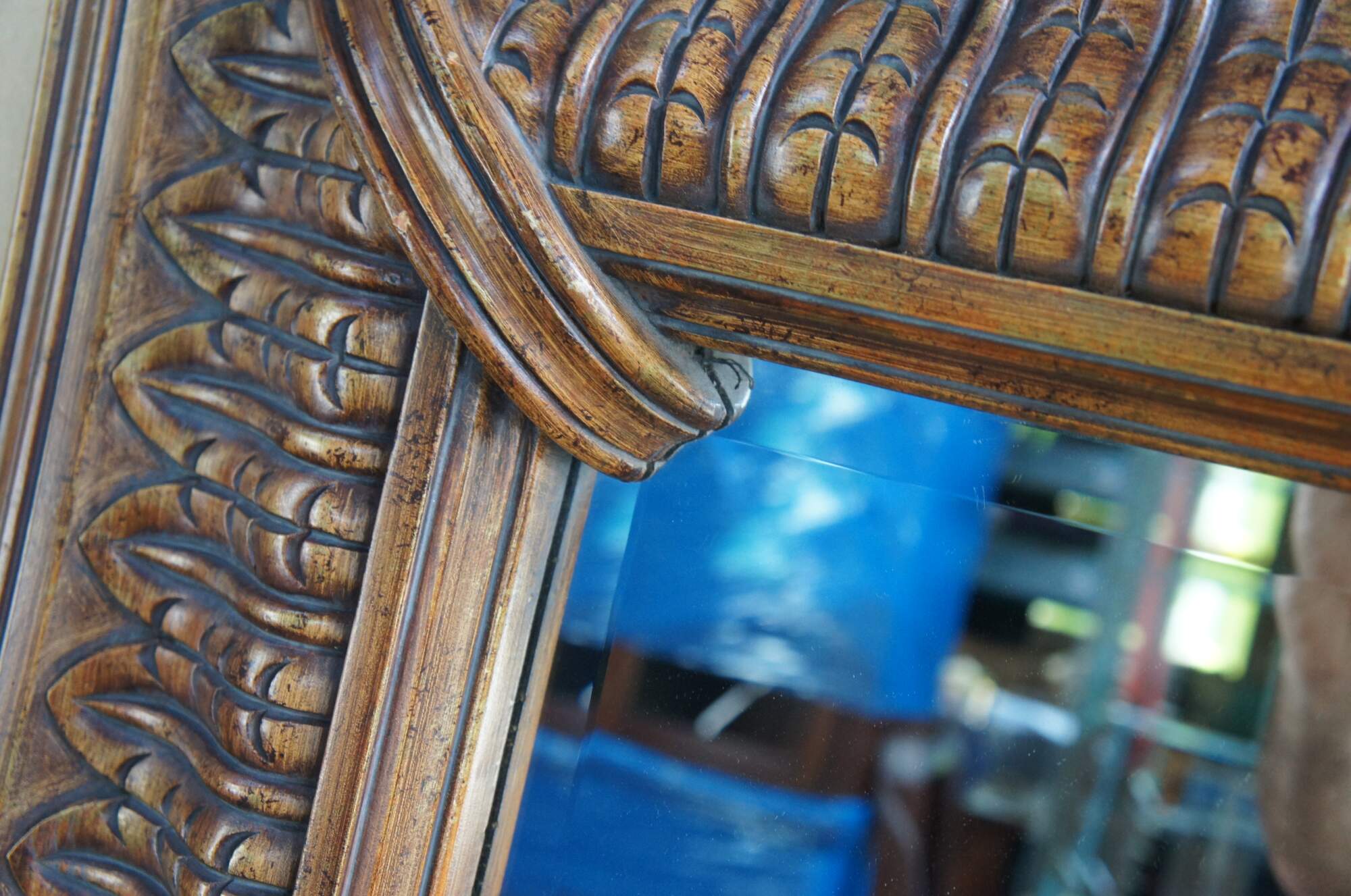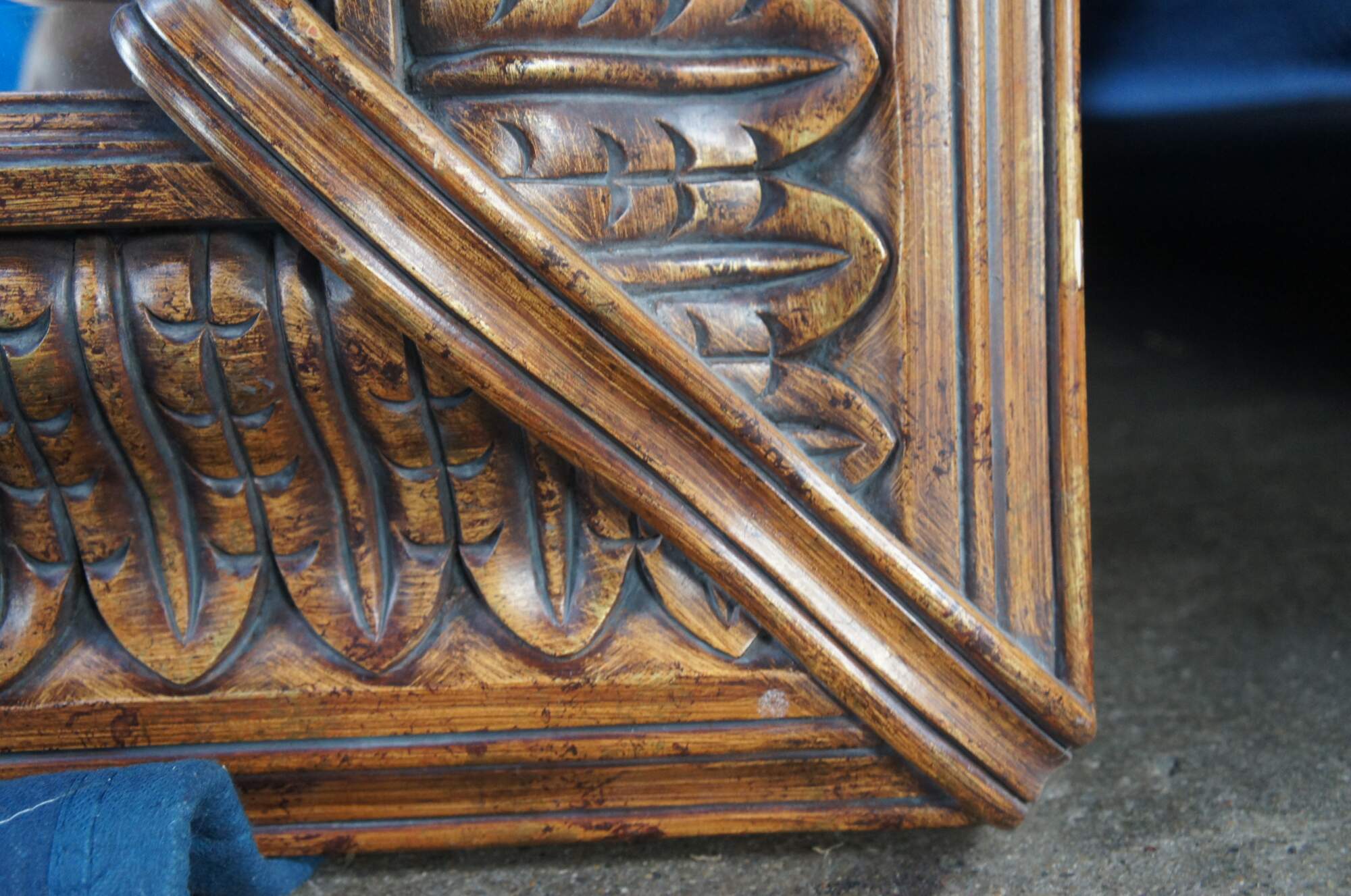 Vintage Raschella Collection beveled vanity or mantel mirror featuring an ornate pecan wood frame. Set up for vertical or horizontal hanging.