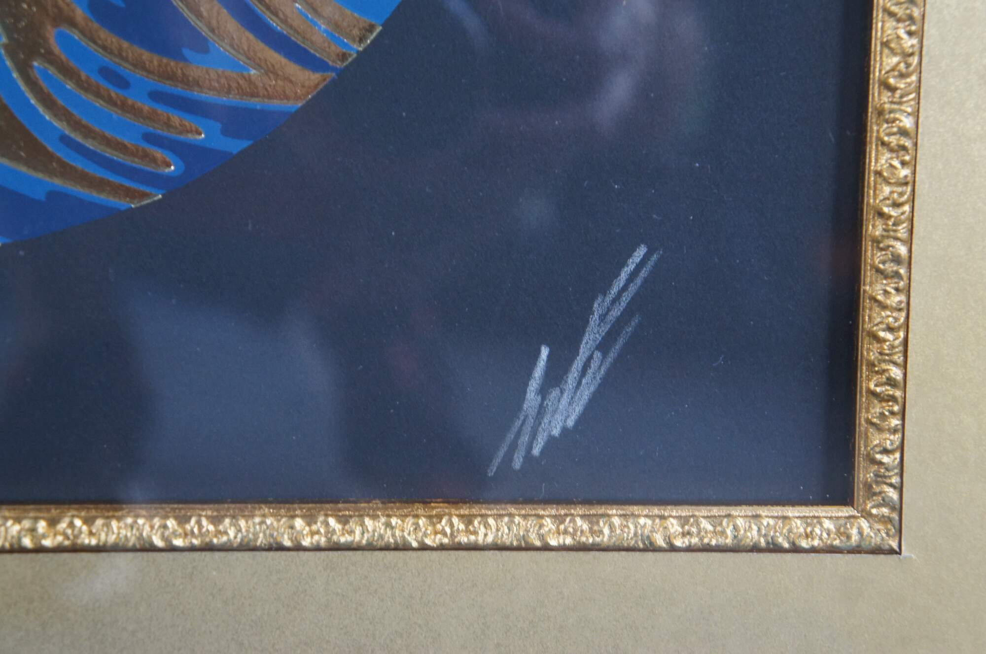 Vintage pair of embossed metallic Art Deco style serigraphs by Erte, circa 1986. The prints feature the famous Statue of Liberty in both day and night settings. The day print features a seascape with her majesty surfing the waves with her outstretched torch against a sunrise and silhouette of New York City. The night print shows similar, with fireworks lighting up the night sky. Both signed lower right and numbered 227 of 300. Framed in ornate gold with an infinity flower / floral motif.