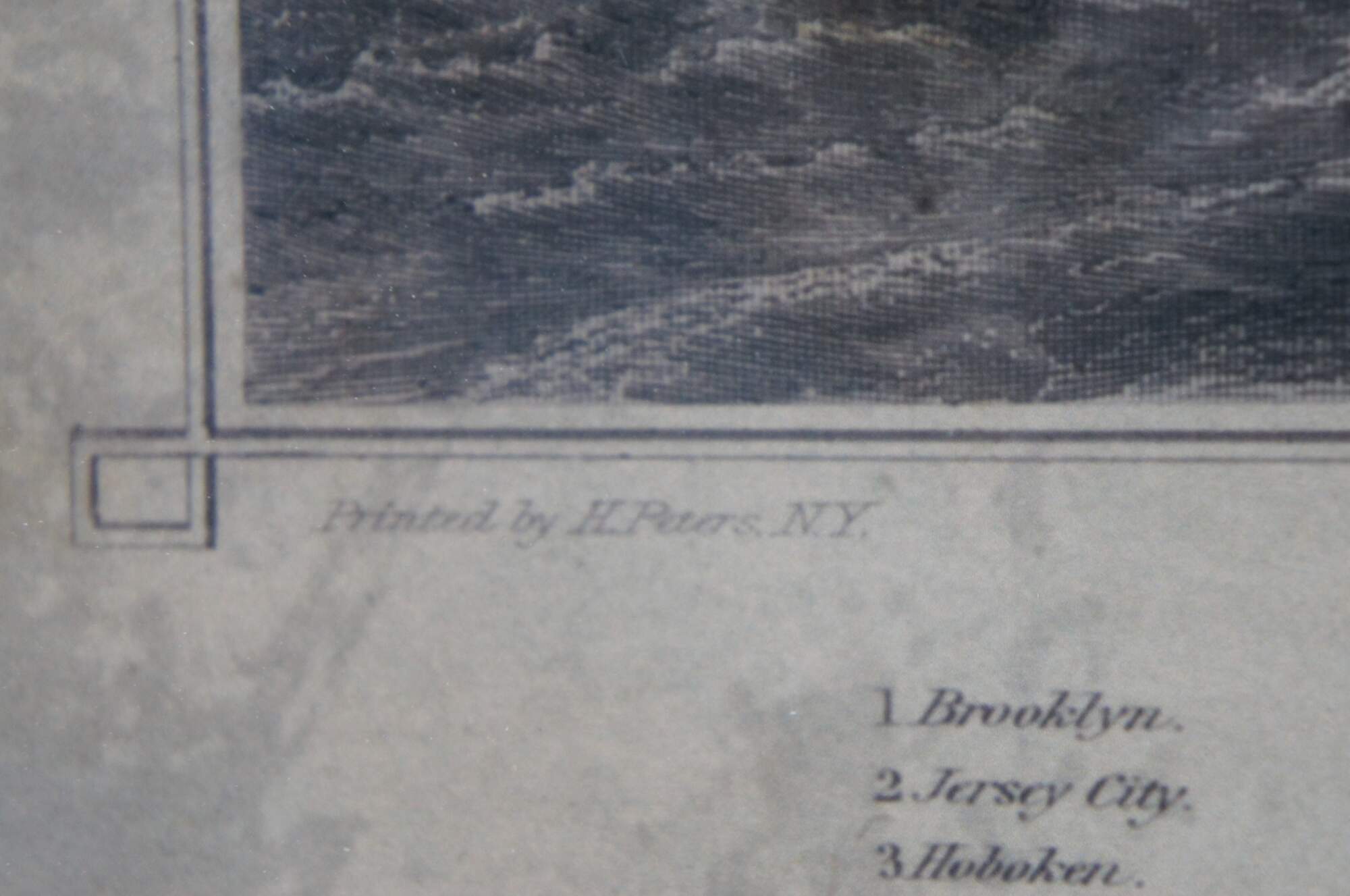 A large and impressive Restoration Hardware framed library map of Old Manhattan, New York. Features a panoramic view, after the original engraving by R. Kupfers in 1986.