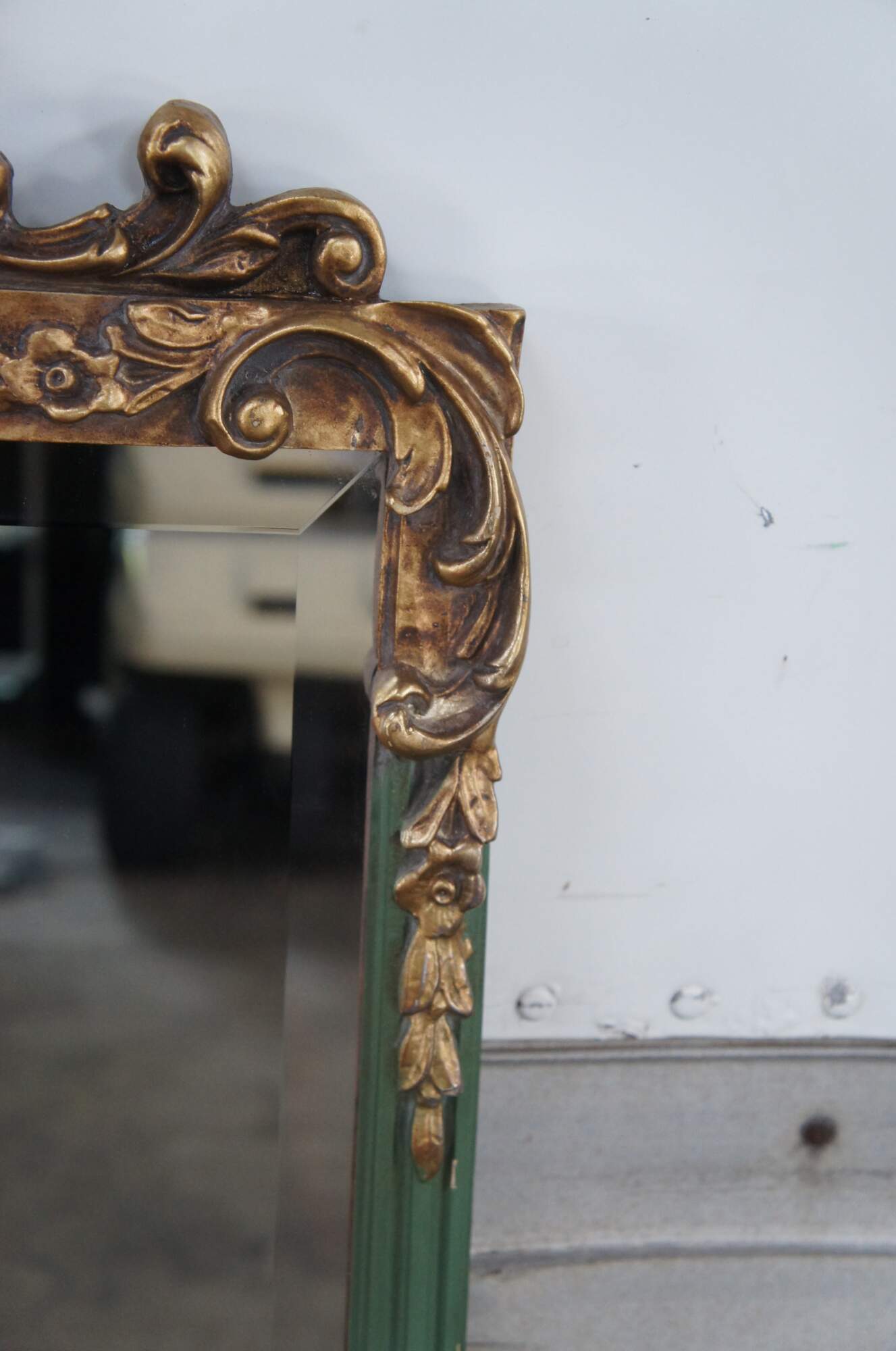 Vintage French Neoclassical vanity dressing mirror featuring rectangular form with gilded floral accents and trophy urn topper. Imported and sold by JC Penny.