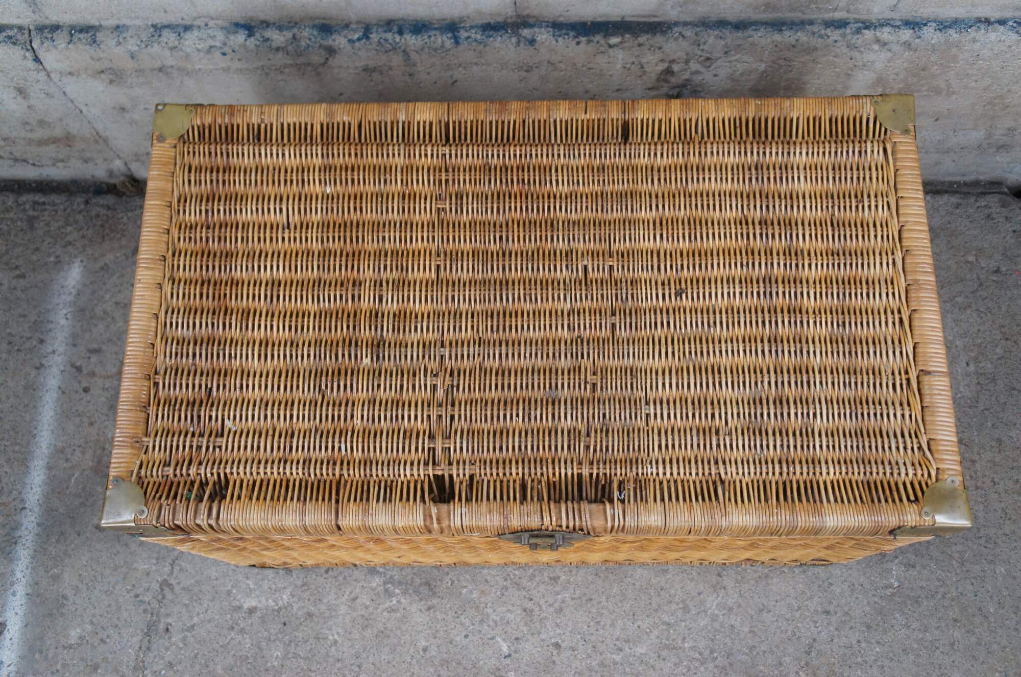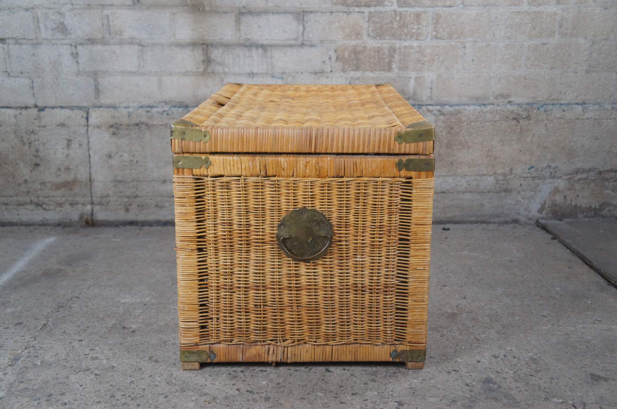 A vintage hand-woven Asian wicker rattan storage chest, 1970s. Ming inspired scalloped brass hardware depicts engraved birds and geometric oriental motif and symbols