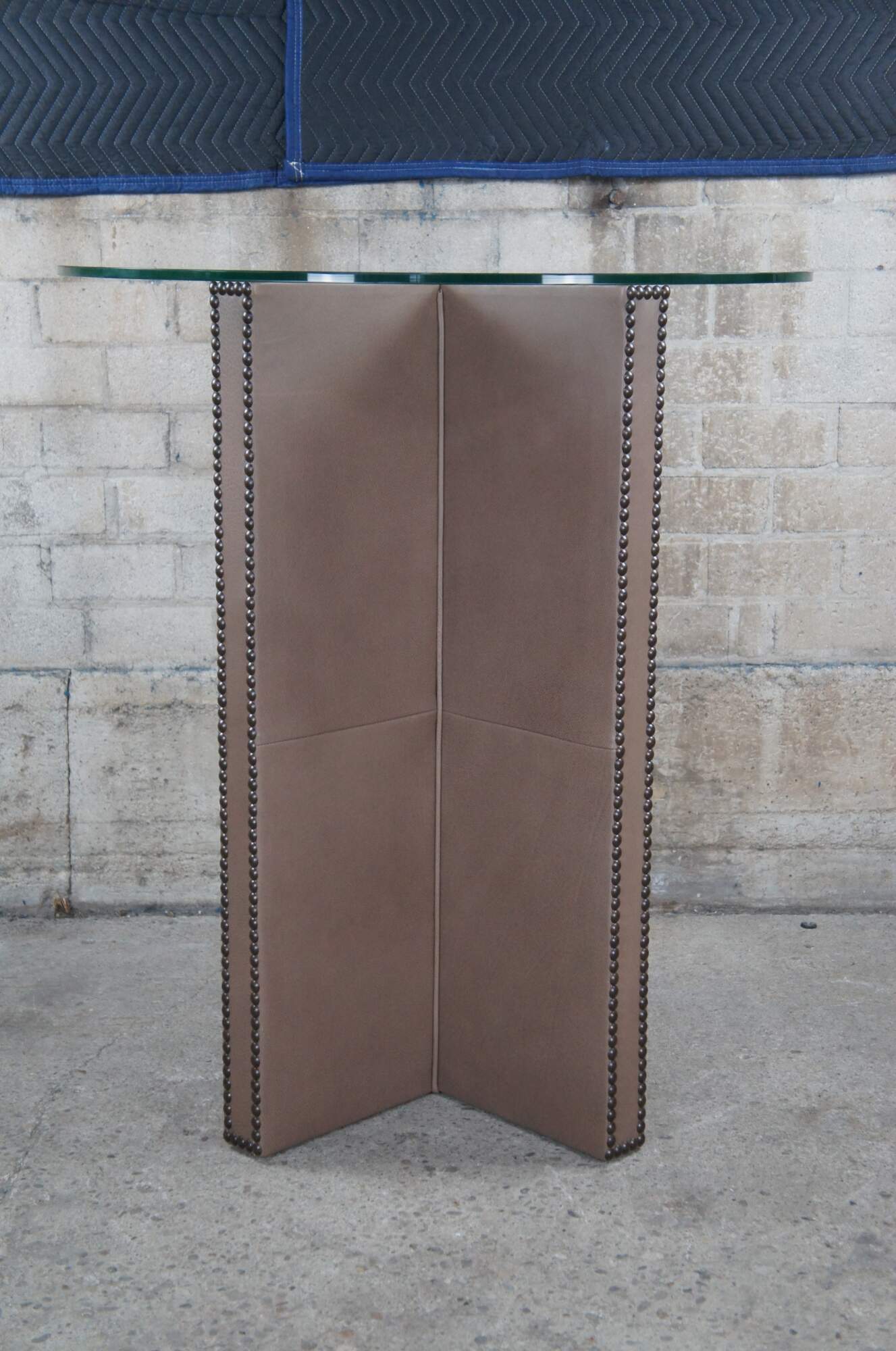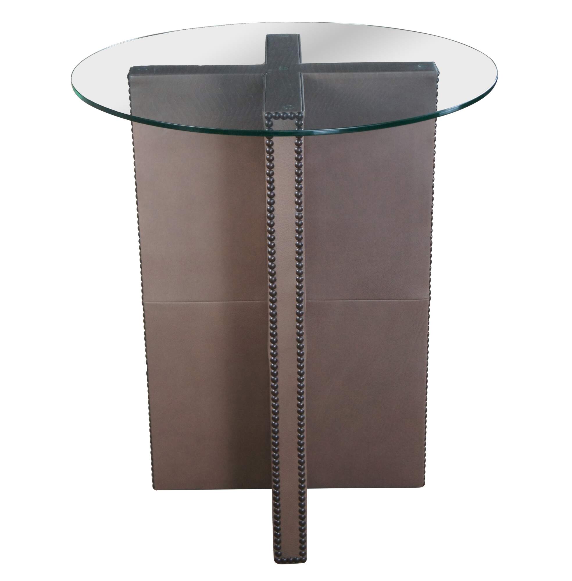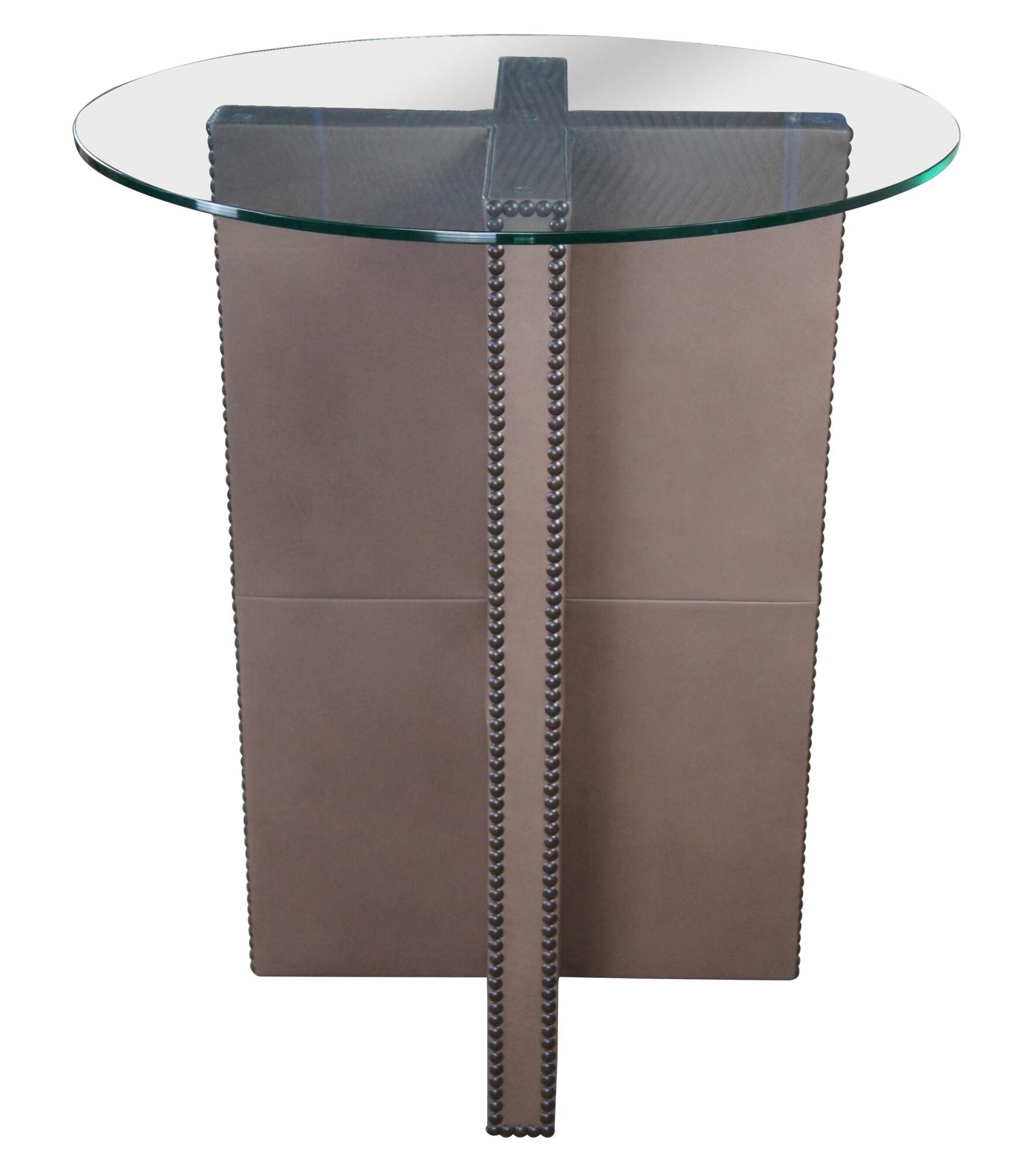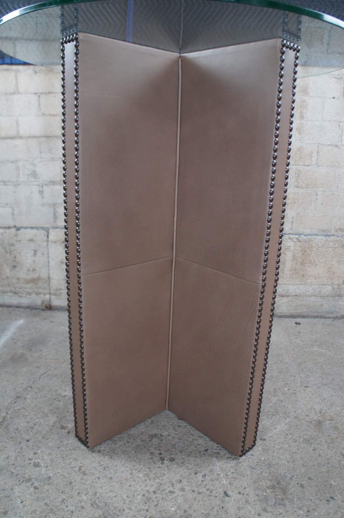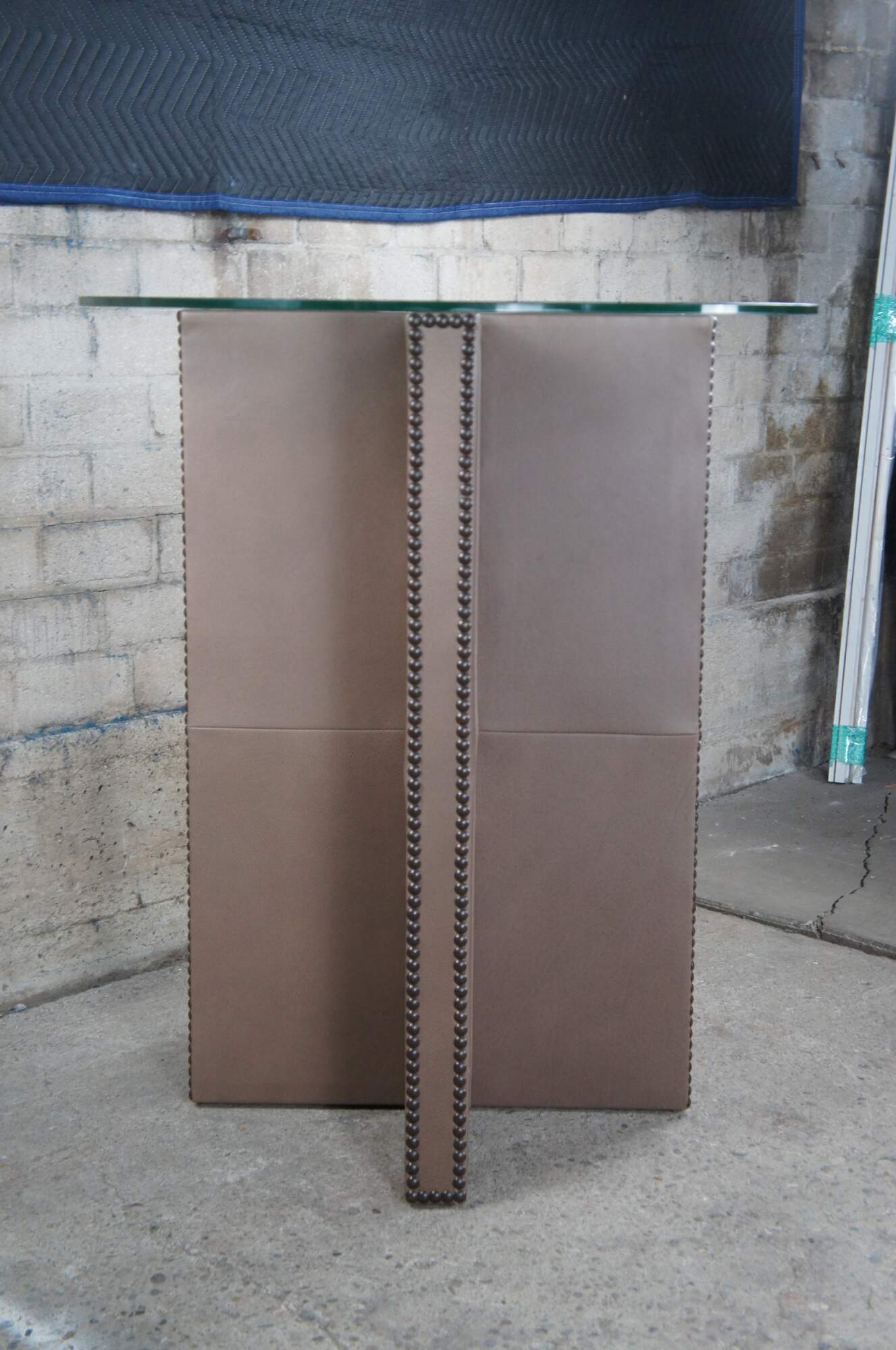 Pair of Brown Leather "X" form handmade pub or bistro tables. Features nailhead trim and round polished glass tops.